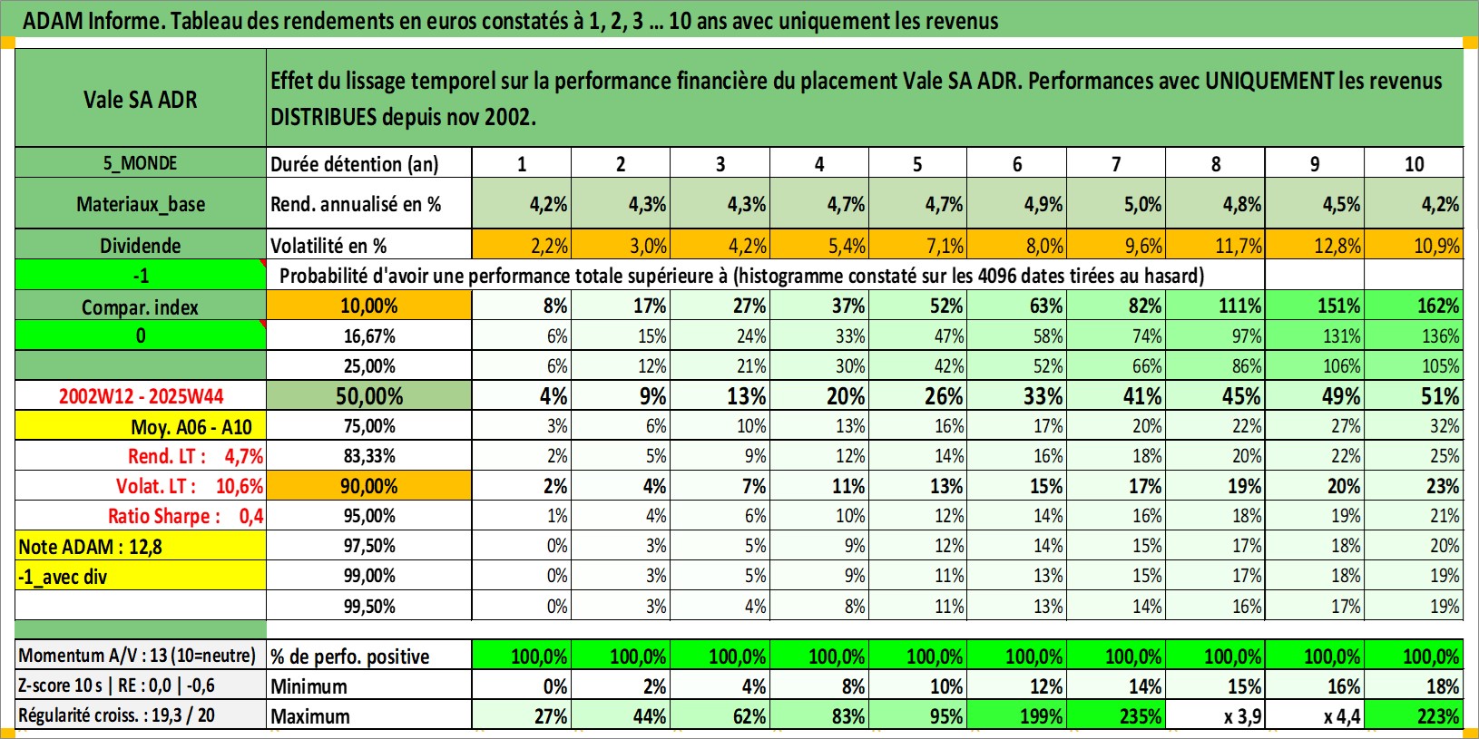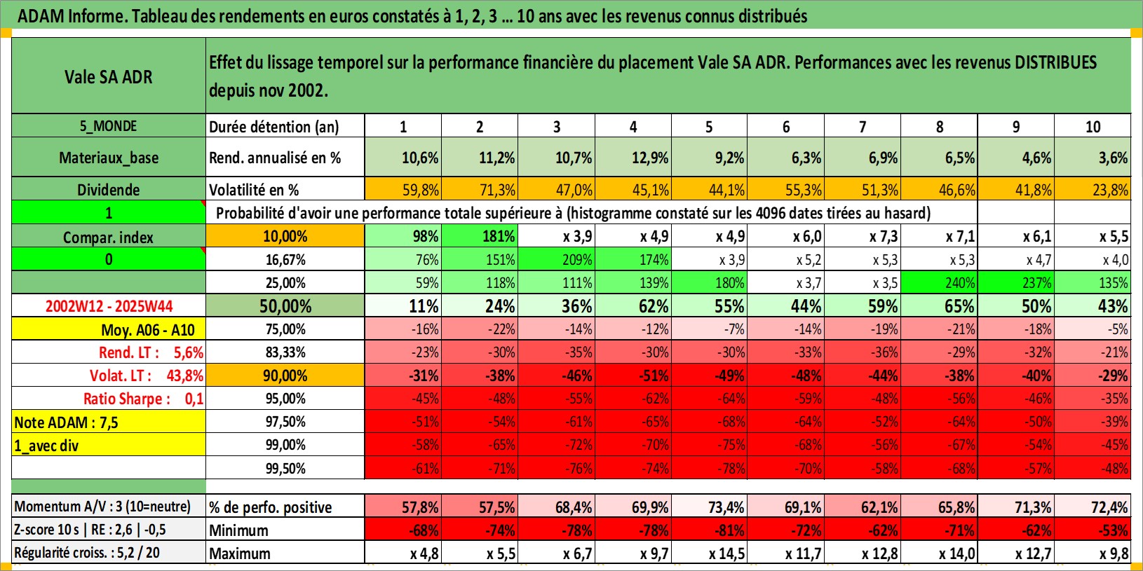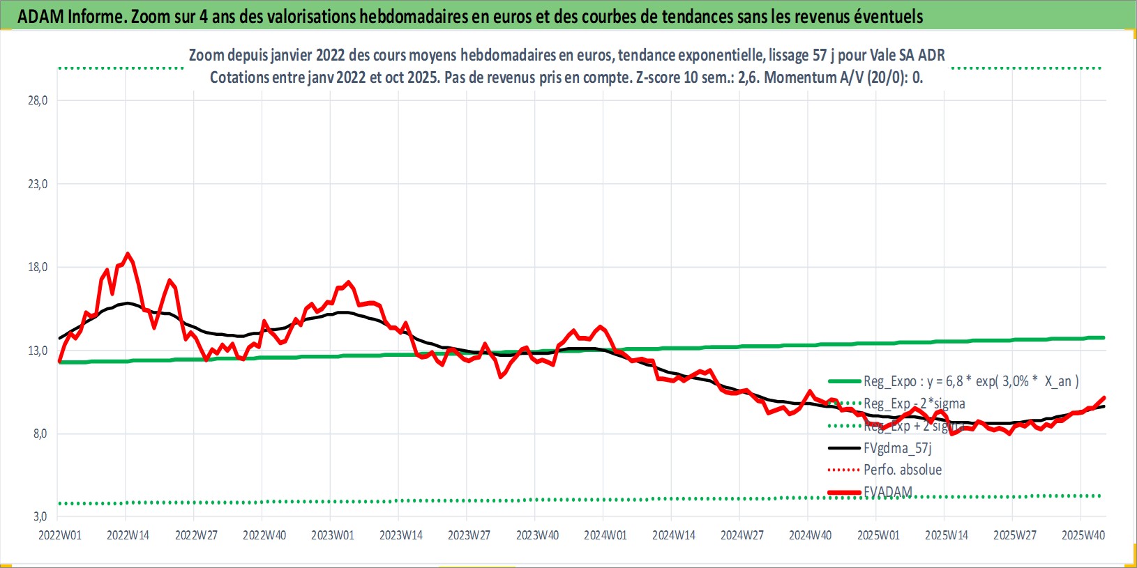 Site dédié aux investisseursPage dédiée sur site financeAnalyse des valorisations hebdomadaires de l'action Vale SA ADR. Cet actif est cote en USD. Les valorisations sont en contrevaleur EURO et couvrent les semaines 2002W12 a 2025W44. Les revenus de cet actif financier sont pris en compte depuis la semaine 2002W46. La note ESG de cet actif n'est pas connue.