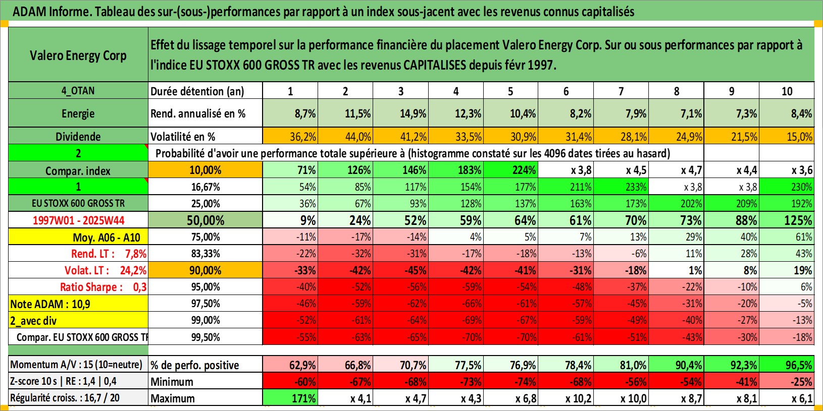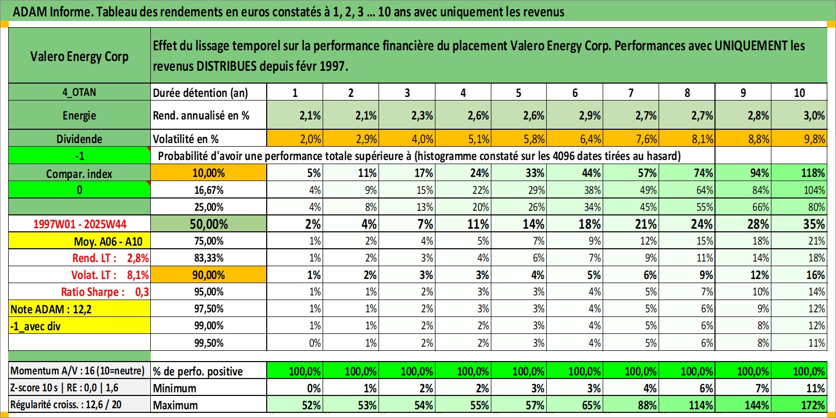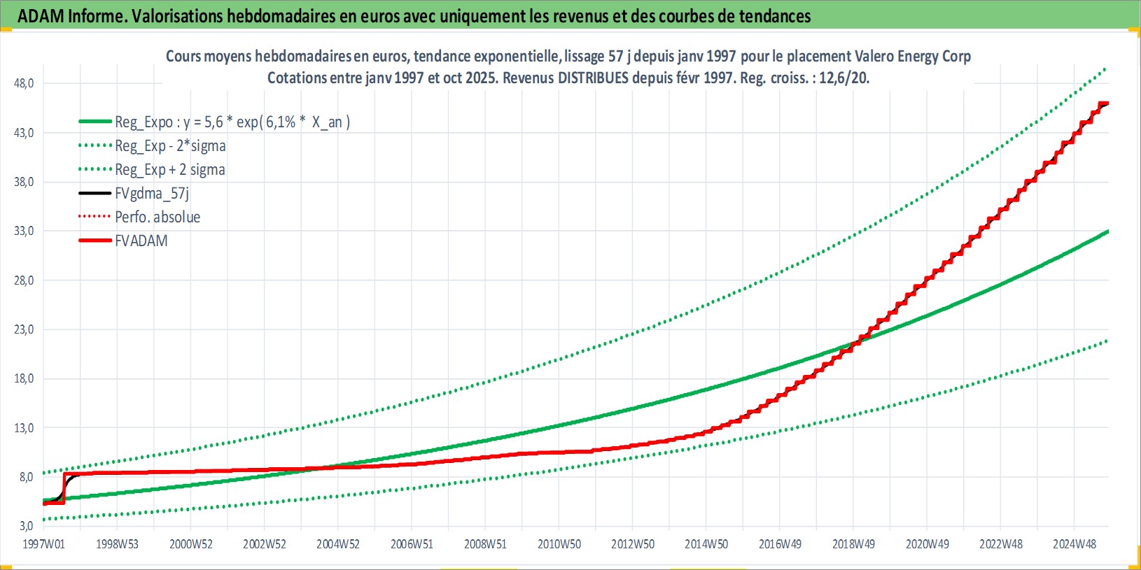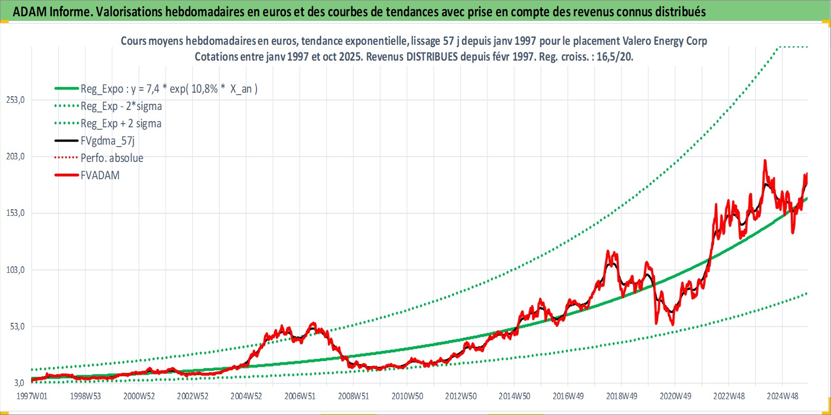 Site dédié aux investisseursPage dédiée sur site financeAnalyse des valorisations hebdomadaires de l'action Valero Energy Corp. Cet actif est cote en USD. Les valorisations sont en contrevaleur EURO et couvrent les semaines 1997W01 a 2025W44. Les revenus de cet actif financier sont pris en compte depuis la semaine 1997W06. La note globale ESG de cet actif est estimee a 5.0 (apres rebasage entre 0 et 20).