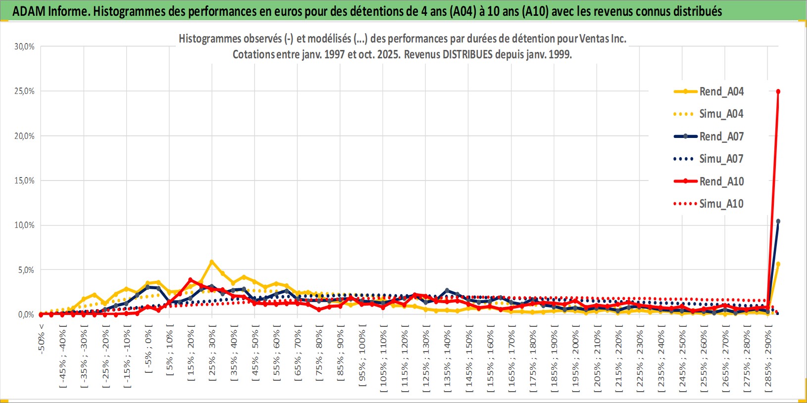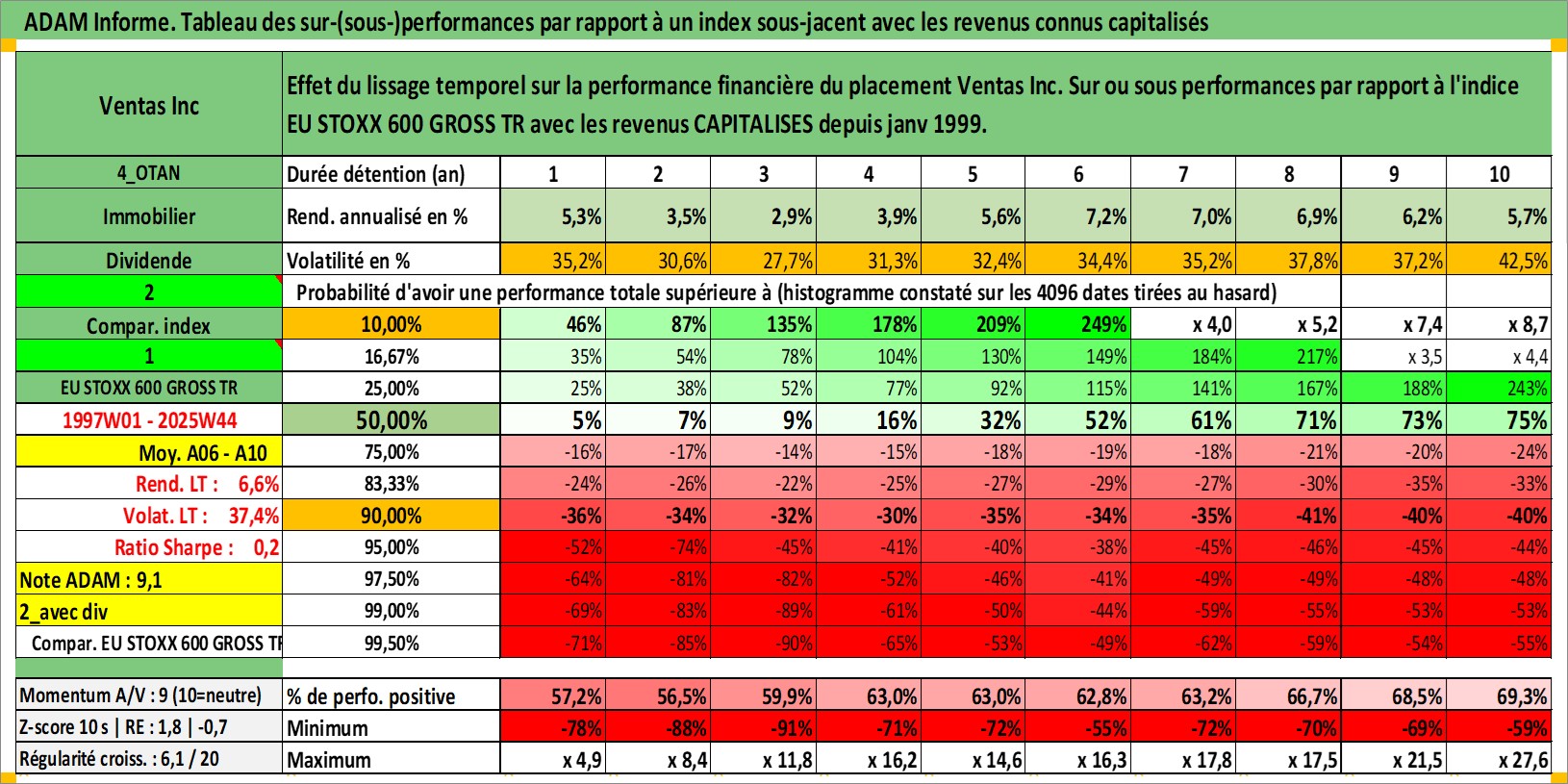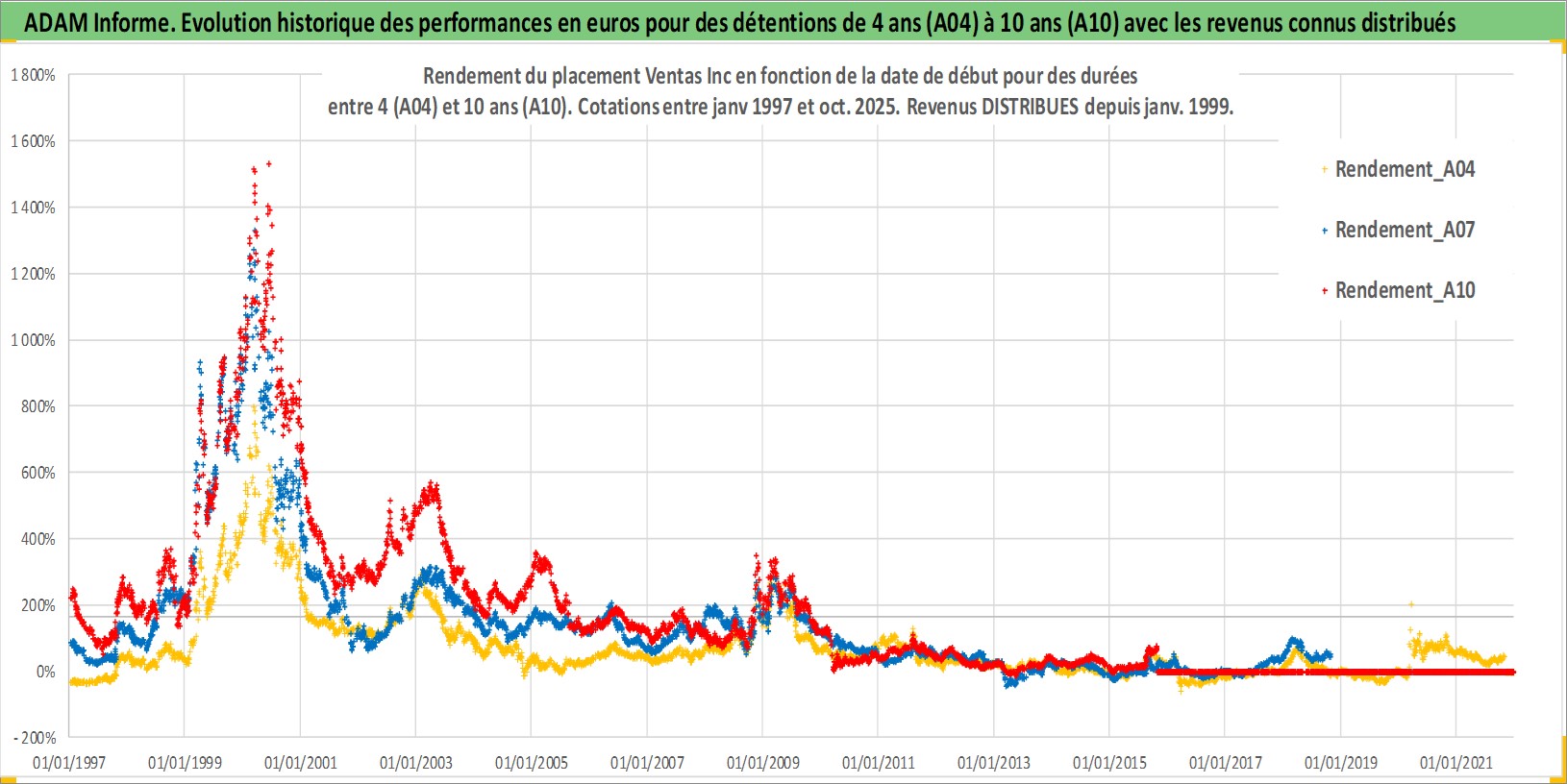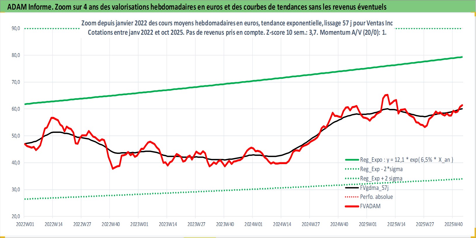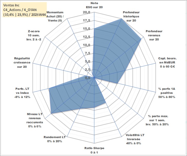 Site dédié aux investisseursPage dédiée sur site financeAnalyse des valorisations hebdomadaires de l'action Ventas Inc. Cet actif est cote en USD. Les valorisations sont en contrevaleur EURO et couvrent les semaines 1997W01 a 2025W44. Les revenus de cet actif financier sont pris en compte depuis la semaine 1999W04. La note globale ESG de cet actif est estimee a 15.0 (apres rebasage entre 0 et 20).