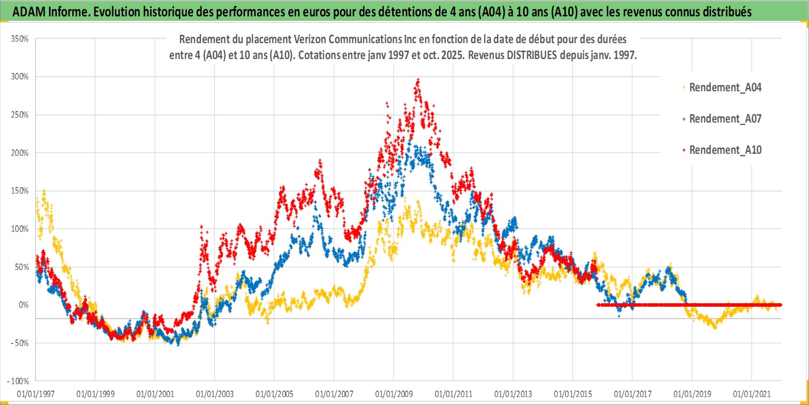 Site dédié aux investisseursPage dédiée sur site financeAnalyse des valorisations hebdomadaires de l'action Verizon Communications Inc. Cet actif est cote en USD. Les valorisations sont en contrevaleur EURO et couvrent les semaines 1997W01 a 2025W44. Les revenus de cet actif financier sont pris en compte depuis la semaine 1997W02. La note globale ESG de cet actif est estimee a 11.0 (apres rebasage entre 0 et 20).