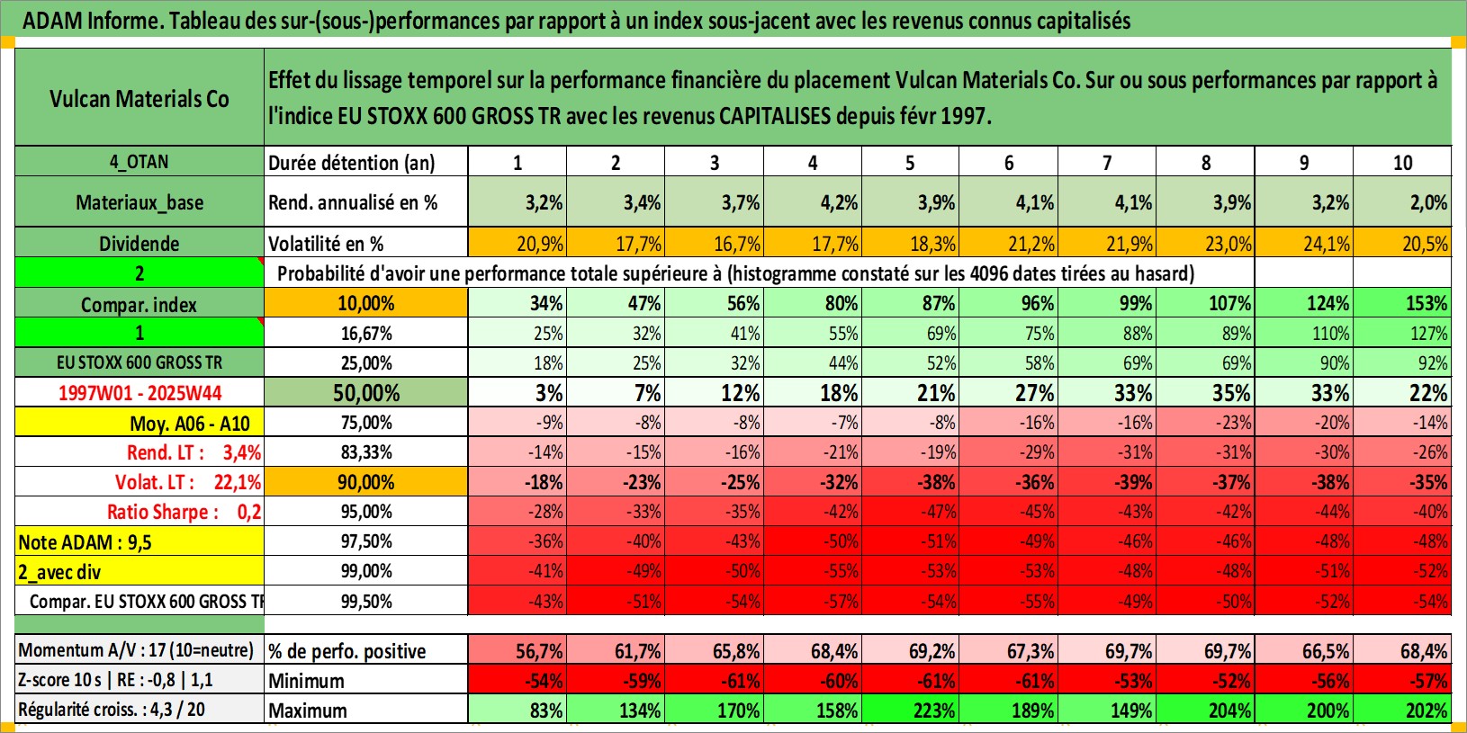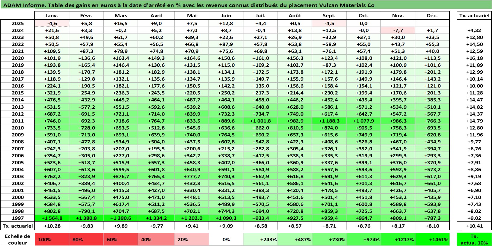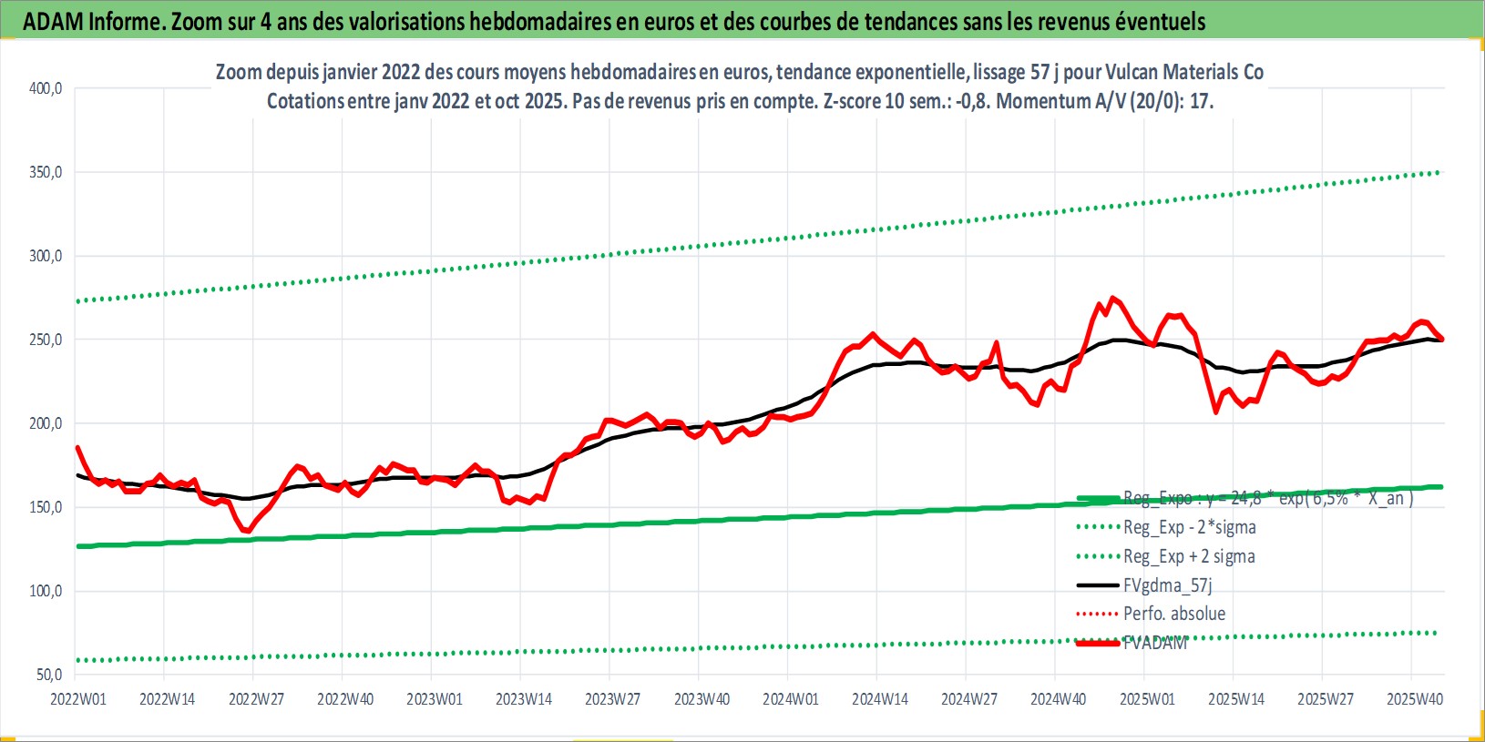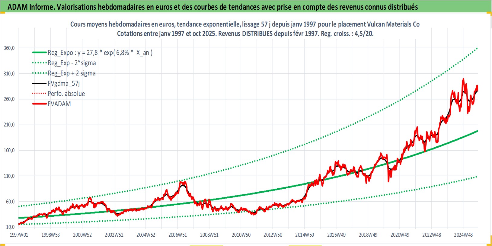 Site dédié aux investisseursPage dédiée sur site financeAnalyse des valorisations hebdomadaires de l'action Vulcan Materials Co. Cet actif est cote en USD. Les valorisations sont en contrevaleur EURO et couvrent les semaines 1997W01 a 2025W44. Les revenus de cet actif financier sont pris en compte depuis la semaine 1997W08. La note globale ESG de cet actif est estimee a 6.0 (apres rebasage entre 0 et 20).
