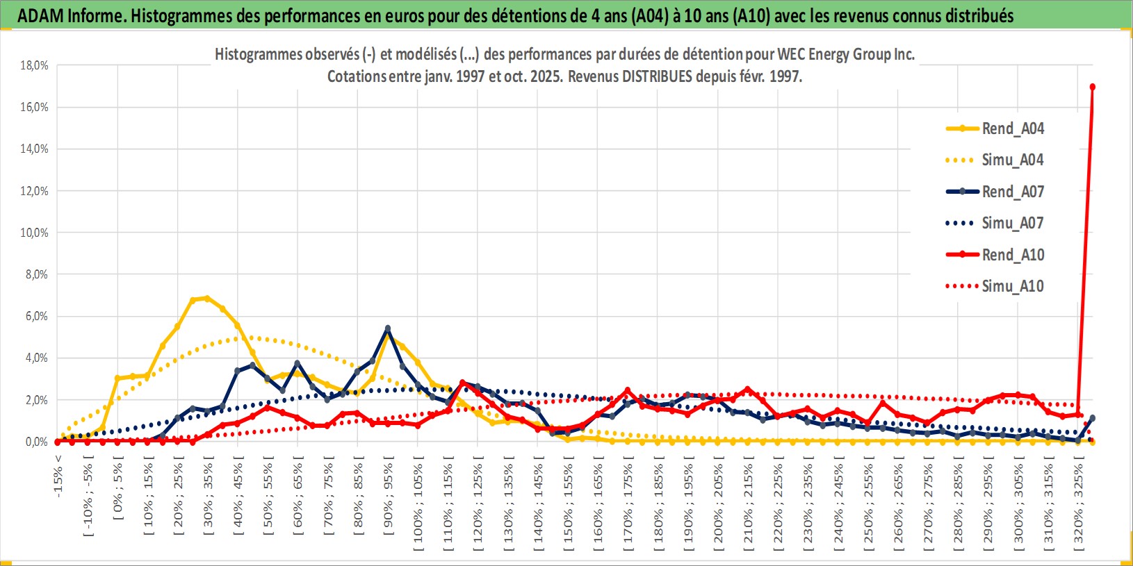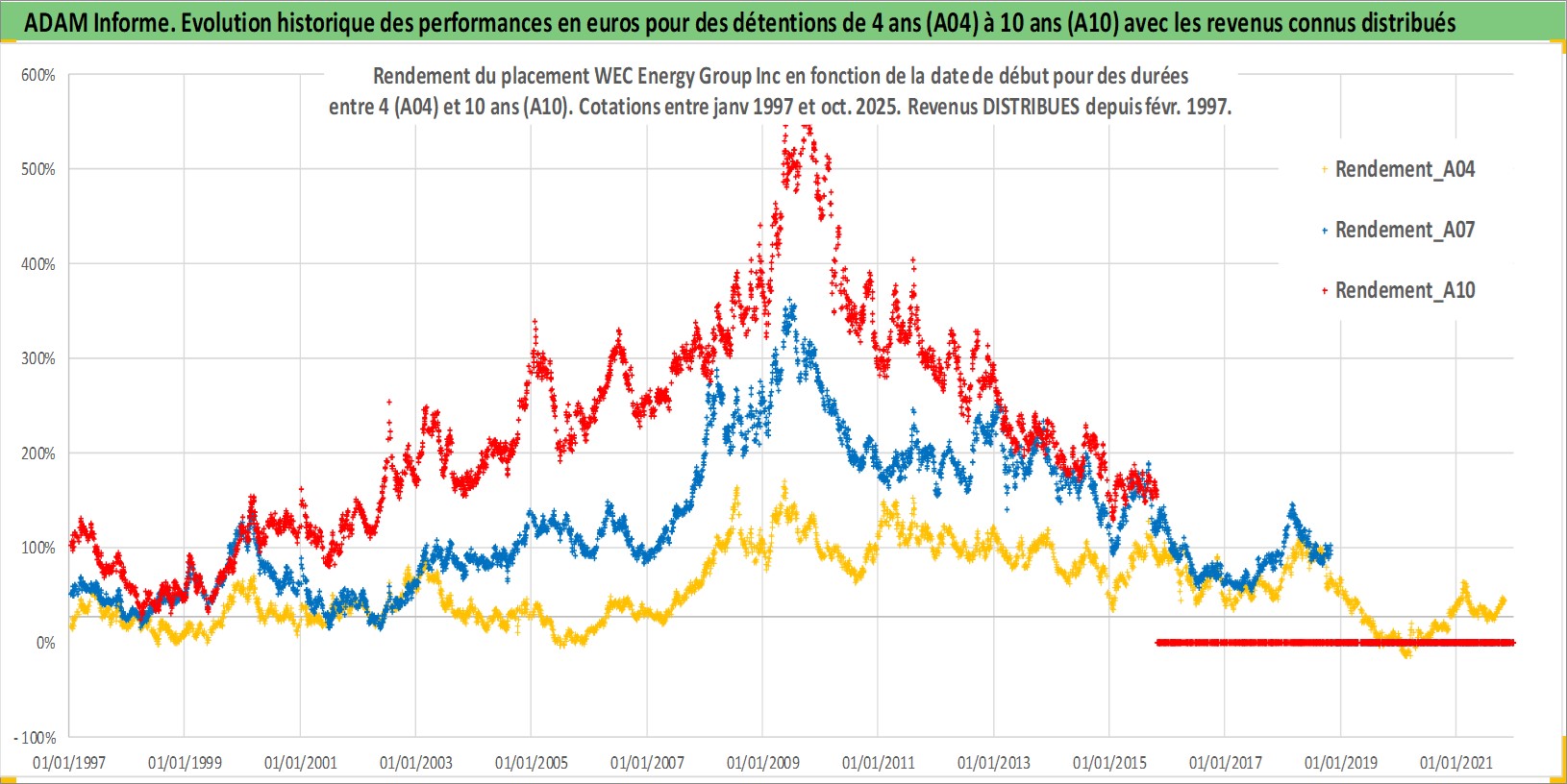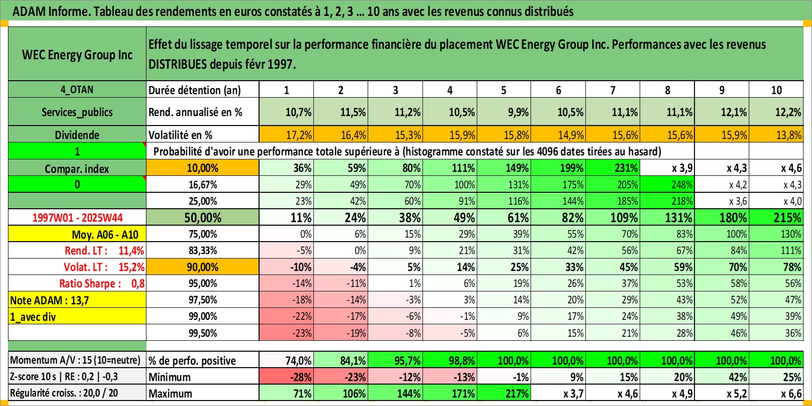 Site dédié aux investisseursPage dédiée sur site financeAnalyse des valorisations hebdomadaires de l'action WEC Energy Group Inc. Cet actif est cote en USD. Les valorisations sont en contrevaleur EURO et couvrent les semaines 1997W01 a 2025W44. Les revenus de cet actif financier sont pris en compte depuis la semaine 1997W07. La note globale ESG de cet actif est estimee a 7.0 (apres rebasage entre 0 et 20).
