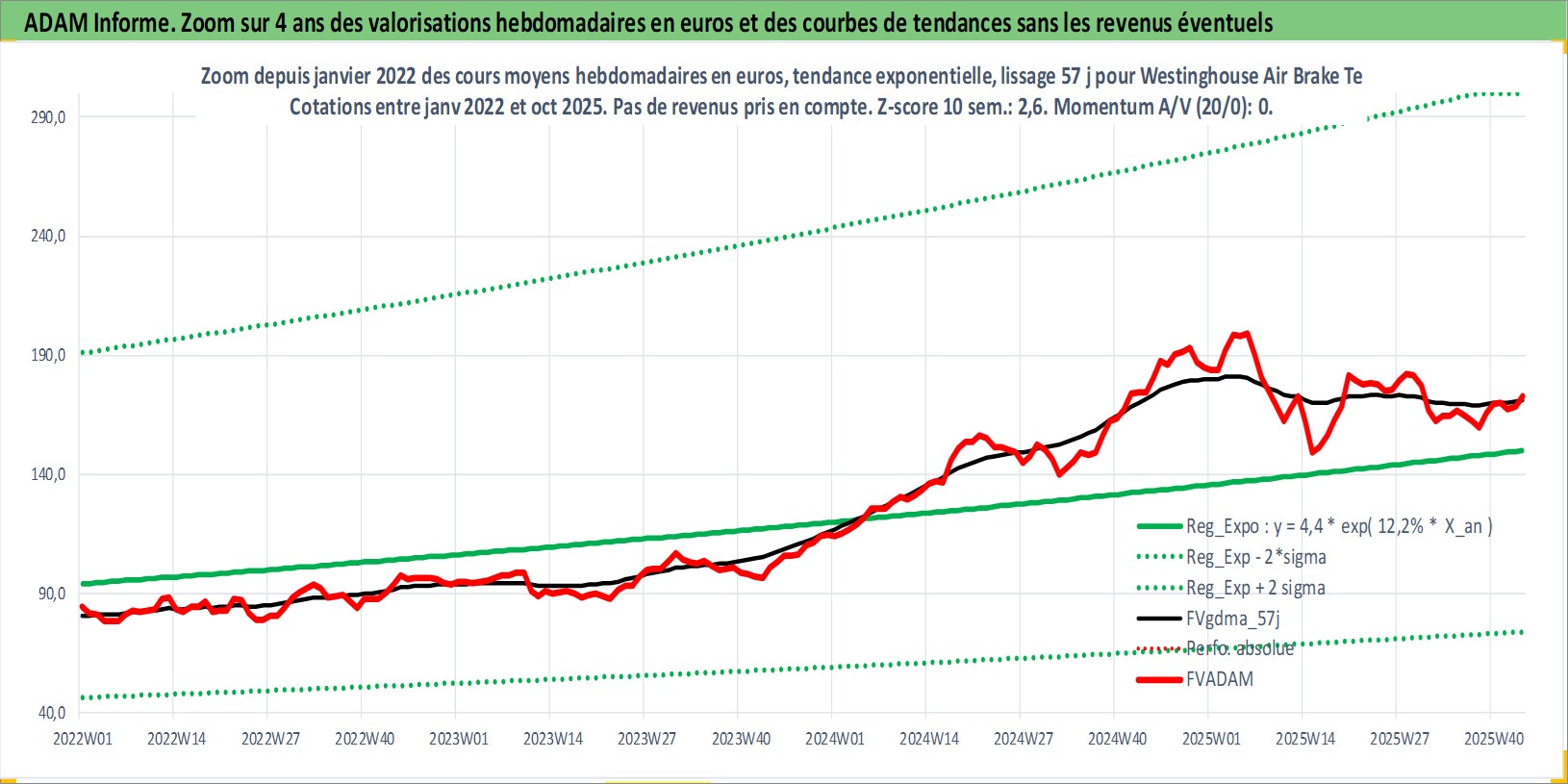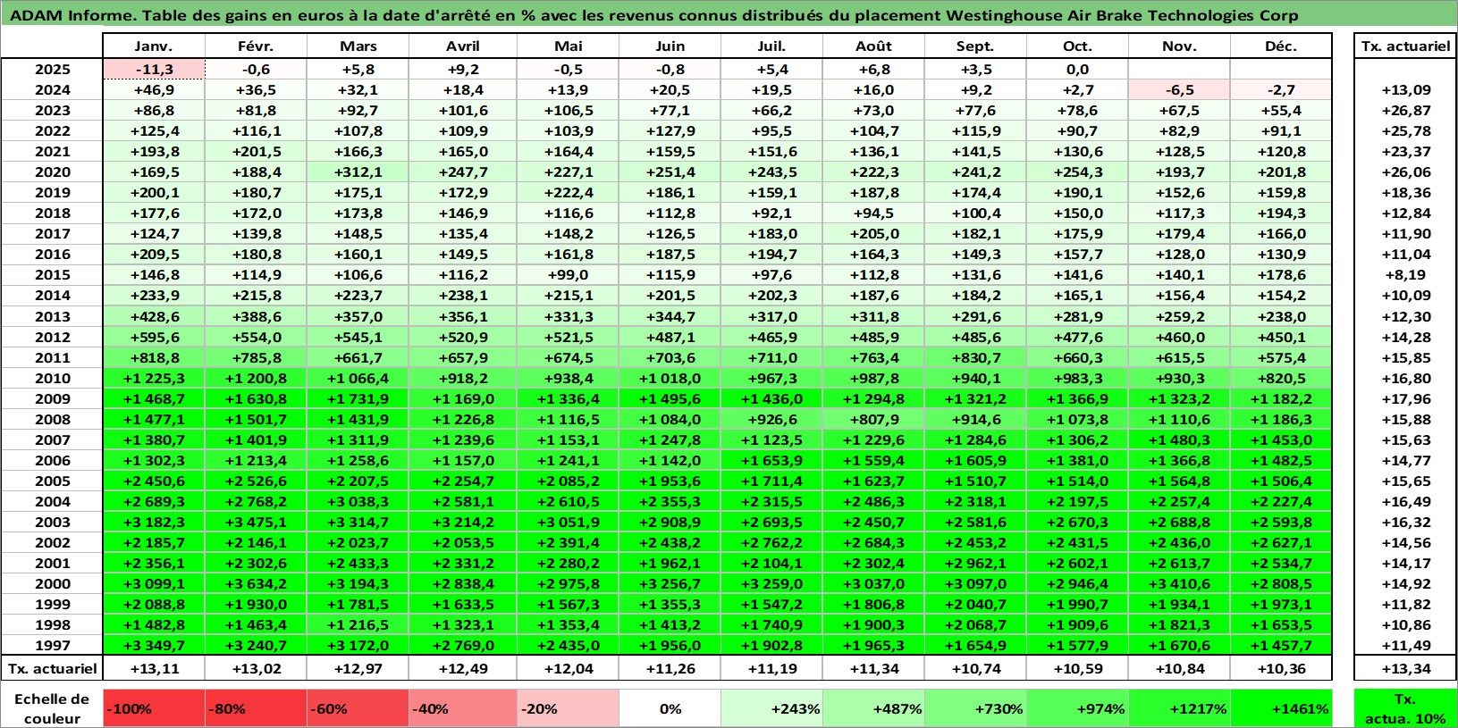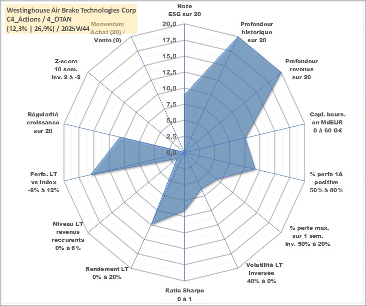 Site dédié aux investisseursPage dédiée sur site financeAnalyse des valorisations hebdomadaires de l'action Westinghouse Air Brake Technologies Corp. Cet actif est cote en USD. Les valorisations sont en contrevaleur EURO et couvrent les semaines 1997W01 a 2025W44. Les revenus de cet actif financier sont pris en compte depuis la semaine 1997W07. La note globale ESG de cet actif est estimee a 9.0 (apres rebasage entre 0 et 20).