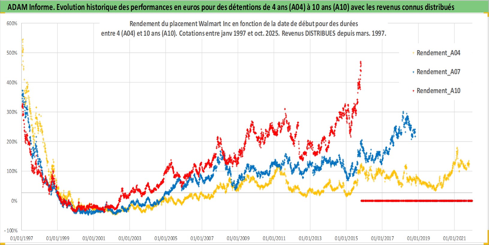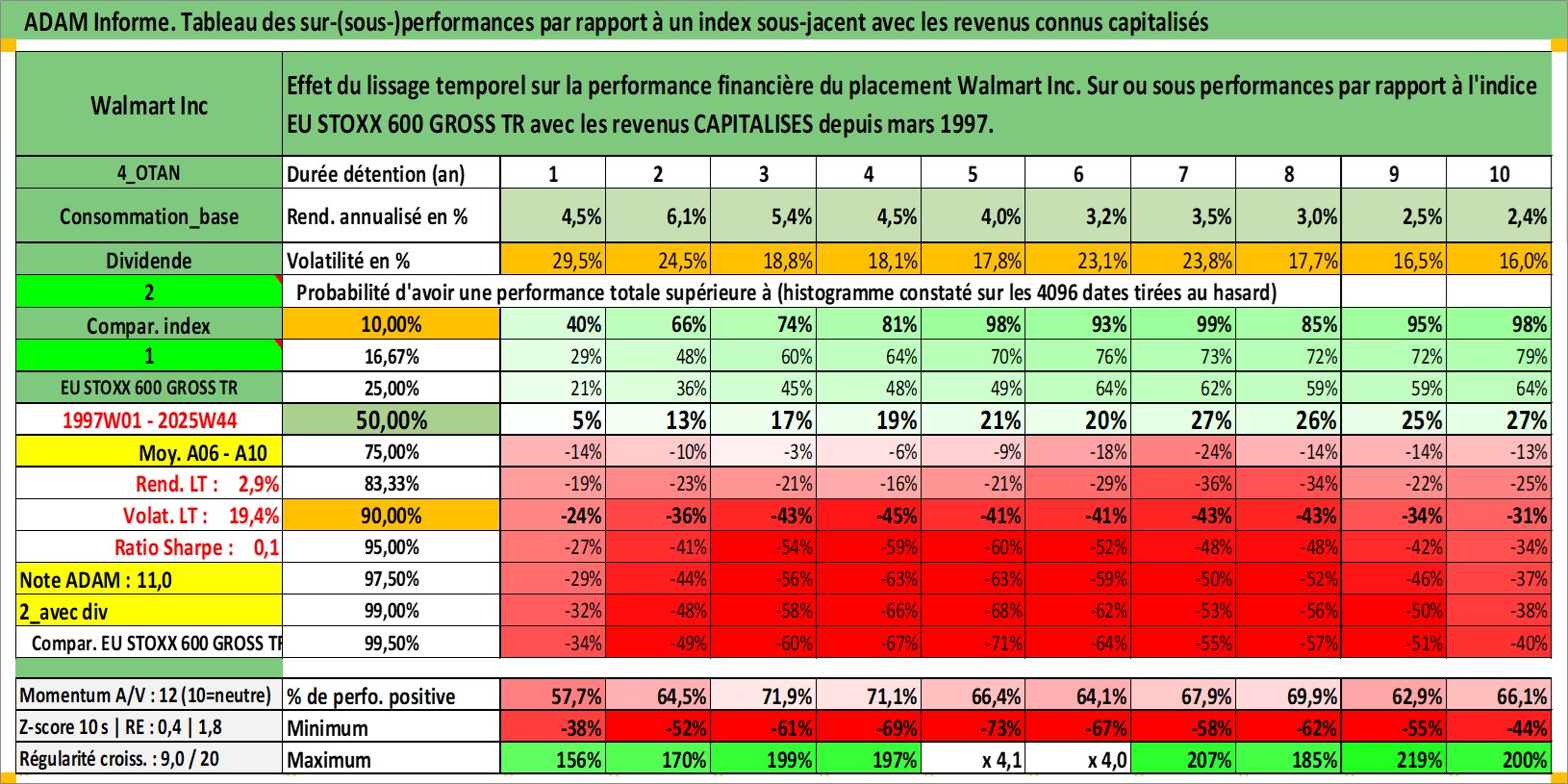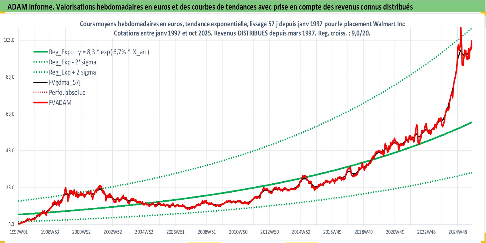 Site dédié aux investisseursPage dédiée sur site financeAnalyse des valorisations hebdomadaires de l'action Walmart Inc. Cet actif est cote en USD. Les valorisations sont en contrevaleur EURO et couvrent les semaines 1997W01 a 2025W44. Les revenus de cet actif financier sont pris en compte depuis la semaine 1997W12. La note globale ESG de cet actif est estimee a 7.0 (apres rebasage entre 0 et 20).