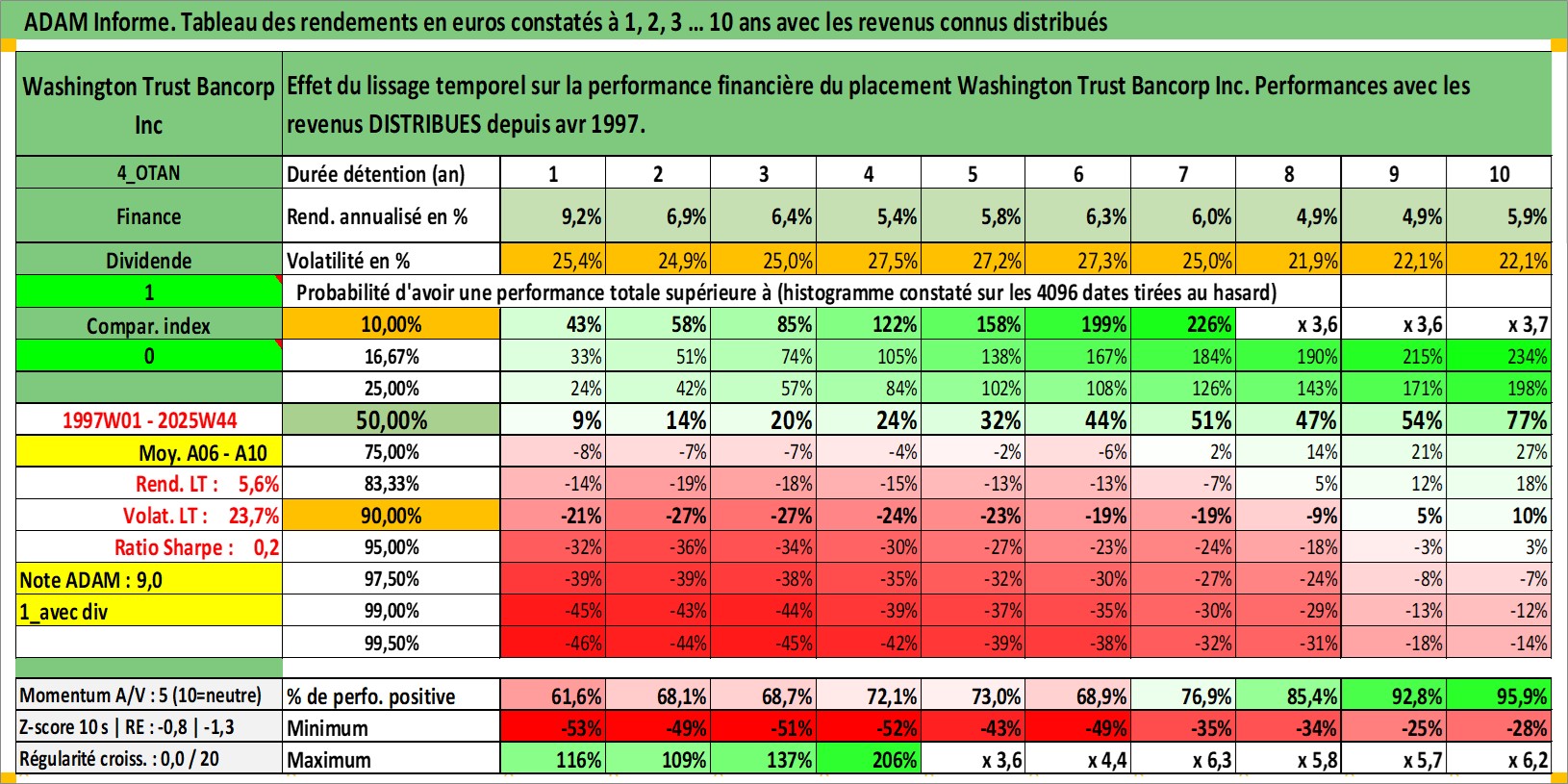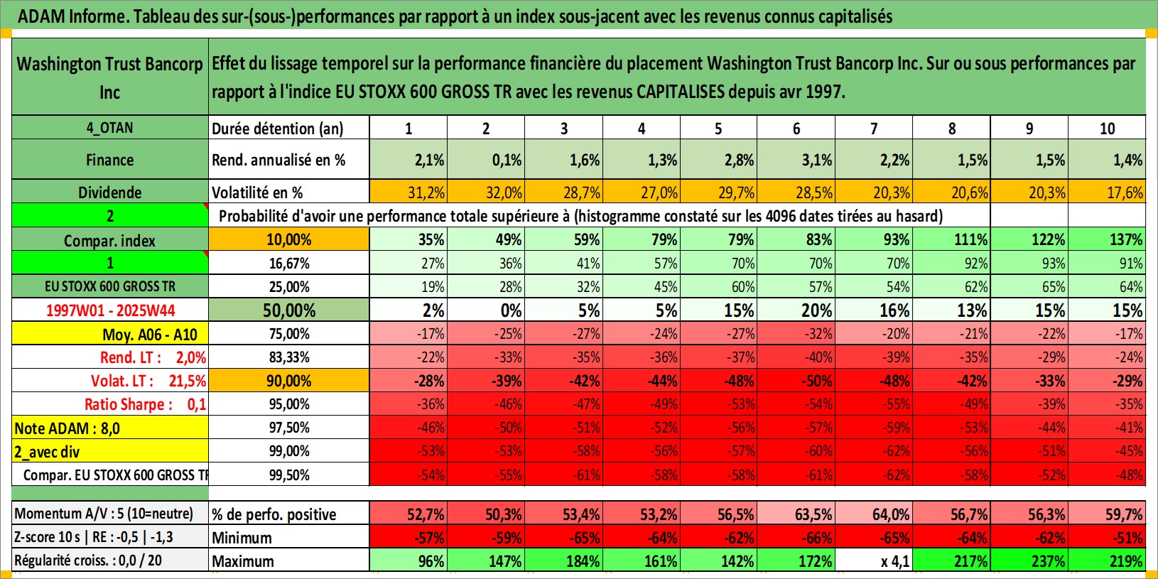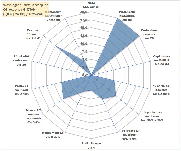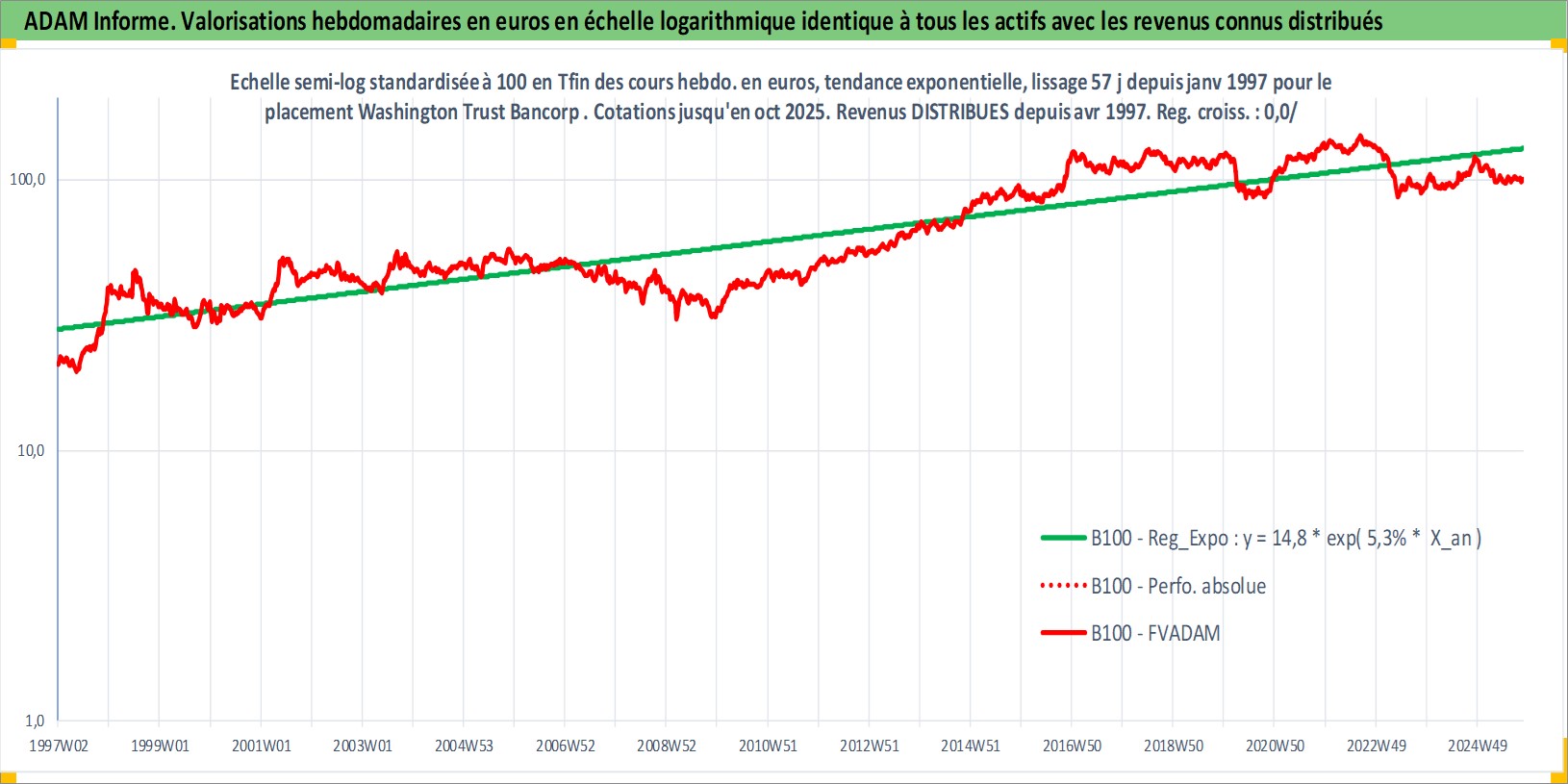 Site dédié aux investisseursPage dédiée sur site financeAnalyse des valorisations hebdomadaires de l'action Washington Trust Bancorp Inc. Cet actif est cote en USD. Les valorisations sont en contrevaleur EURO et couvrent les semaines 1997W01 a 2025W44. Les revenus de cet actif financier sont pris en compte depuis la semaine 1997W14. La note ESG de cet actif n'est pas connue.