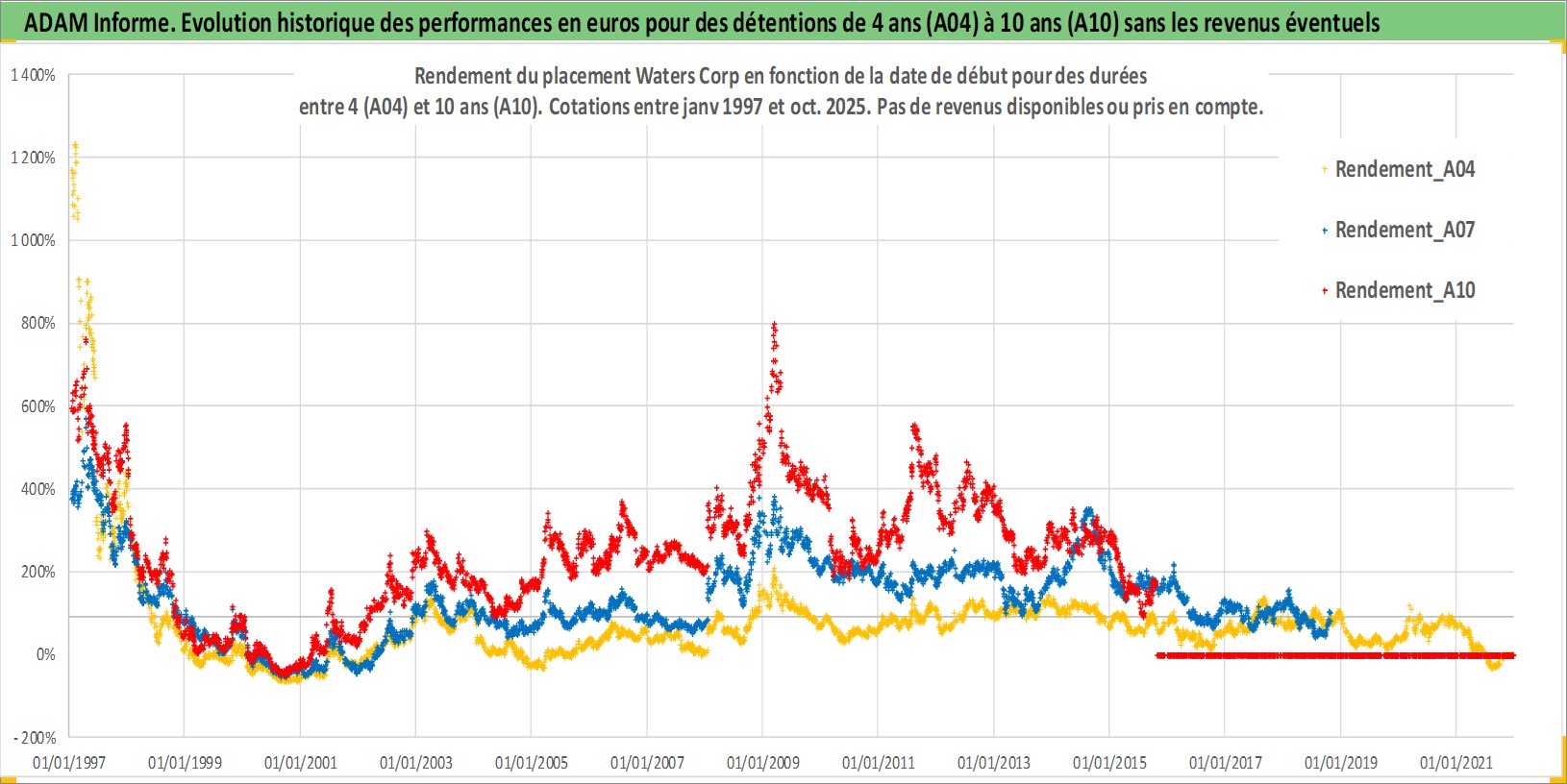 Site dédié aux investisseursPage dédiée sur site financeAnalyse des valorisations hebdomadaires de l'action Waters Corp. Cet actif est cote en USD. Les valorisations sont en contrevaleur EURO et couvrent les semaines 1997W01 a 2025W44. Les revenus de cet actif financier ne sont pas connus car non existants ou non disponibles sur le site Yahoo Finance. La note globale ESG de cet actif est estimee a 12.0 (apres rebasage entre 0 et 20).