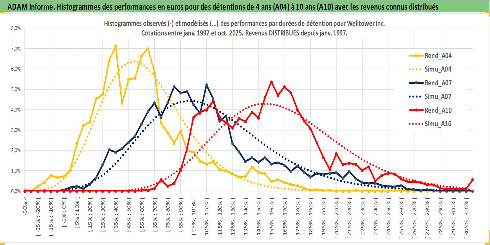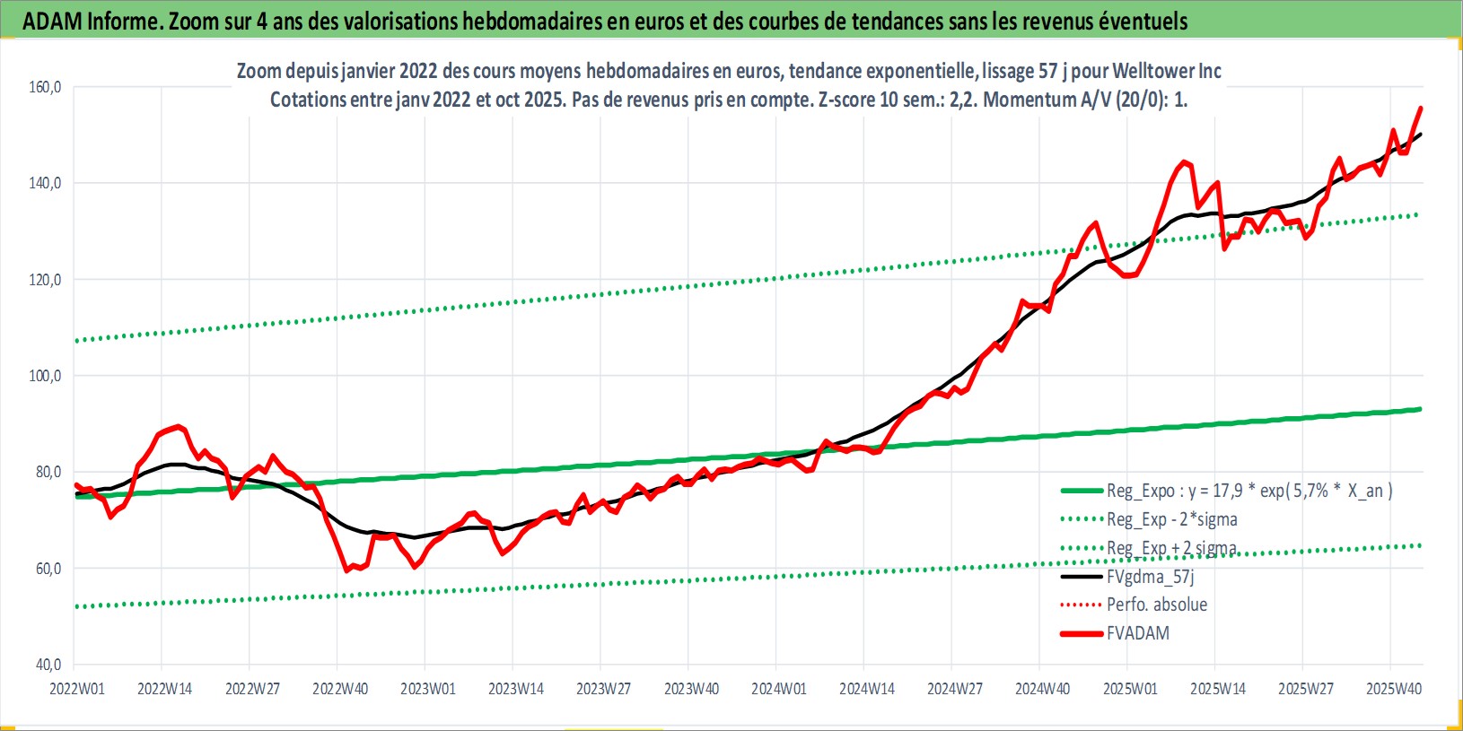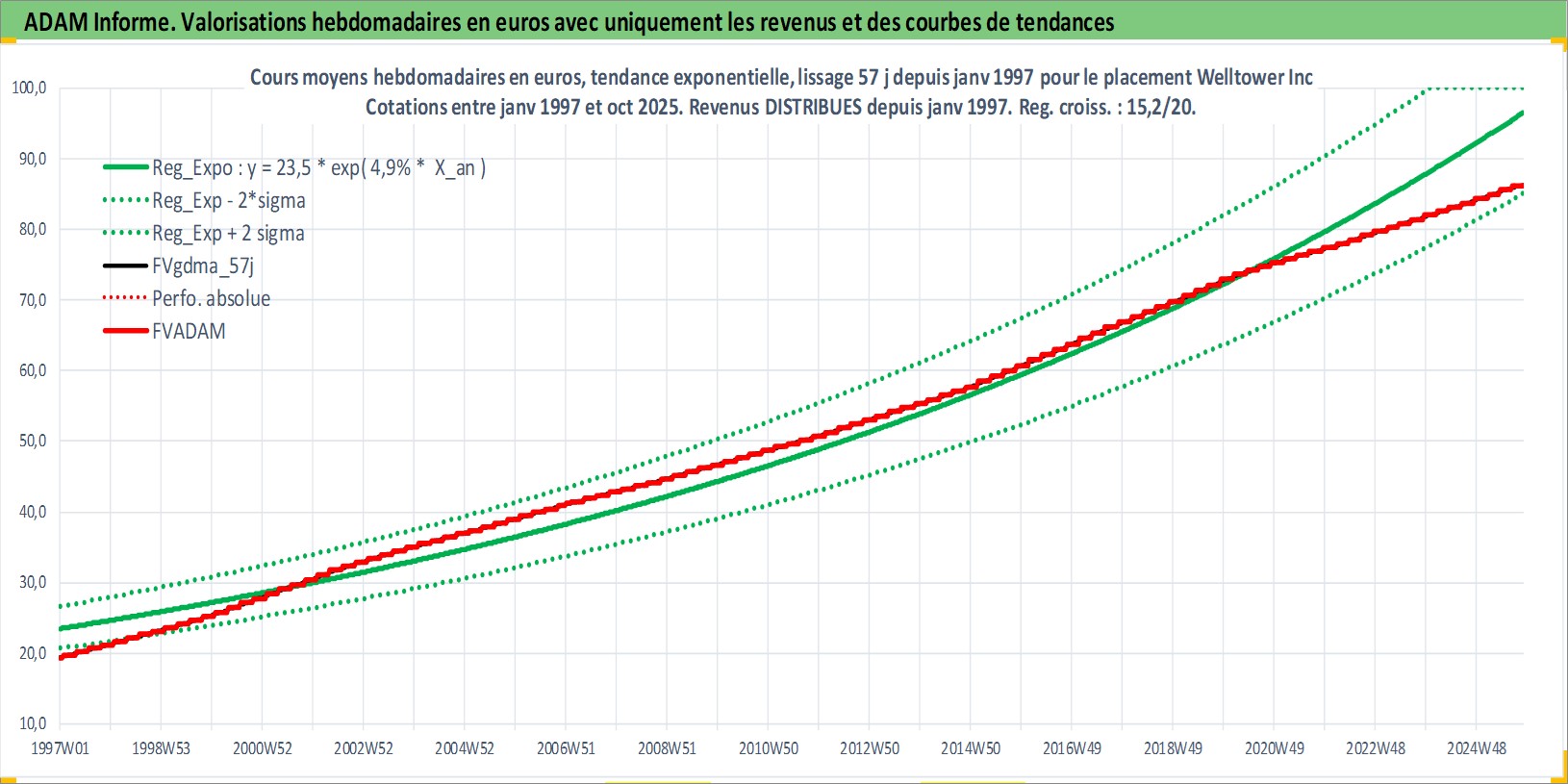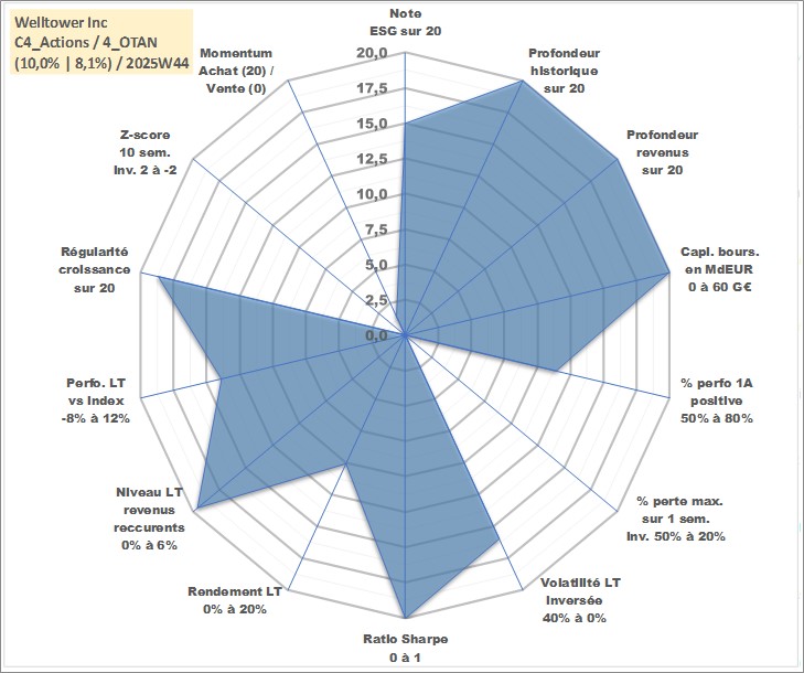 Site dédié aux investisseursPage dédiée sur site financeAnalyse des valorisations hebdomadaires de l'action Welltower Inc. Cet actif est cote en USD. Les valorisations sont en contrevaleur EURO et couvrent les semaines 1997W01 a 2025W44. Les revenus de cet actif financier sont pris en compte depuis la semaine 1997W05. La note globale ESG de cet actif est estimee a 15.0 (apres rebasage entre 0 et 20).