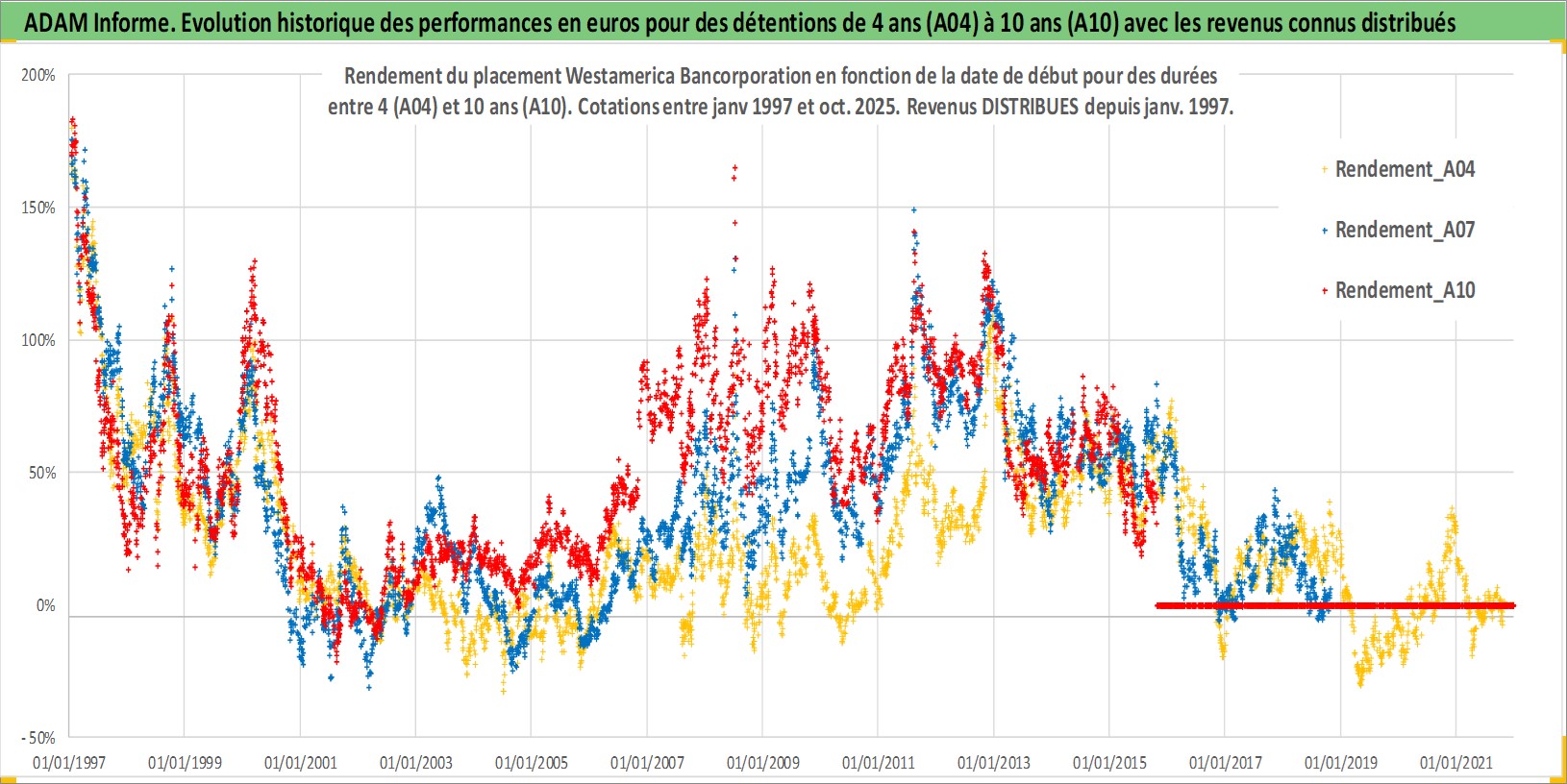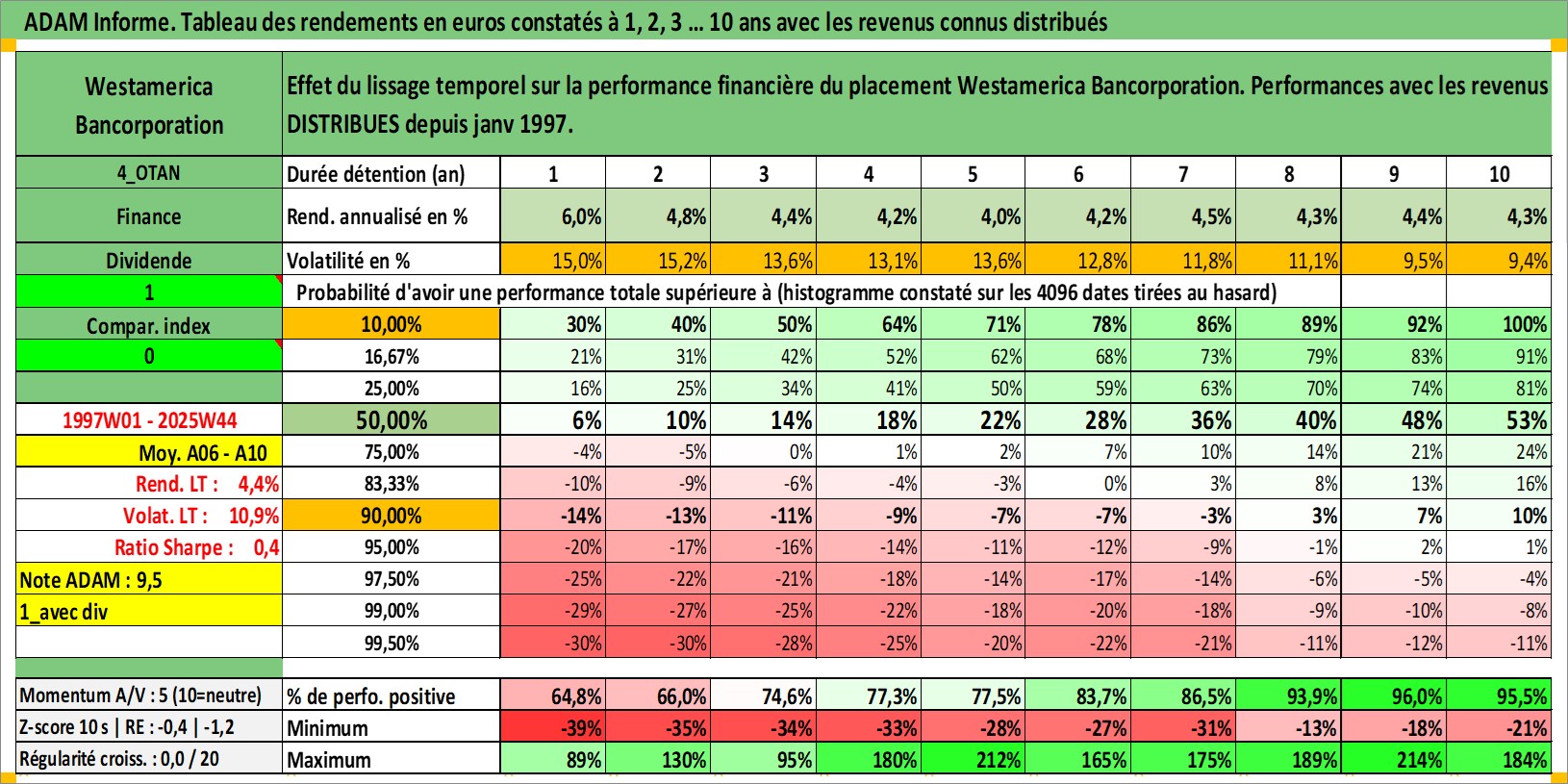 Site dédié aux investisseursPage dédiée sur site financeAnalyse des valorisations hebdomadaires de l'action Westamerica Bancorporation. Cet actif est cote en USD. Les valorisations sont en contrevaleur EURO et couvrent les semaines 1997W01 a 2025W44. Les revenus de cet actif financier sont pris en compte depuis la semaine 1997W03. La note ESG de cet actif n'est pas connue.