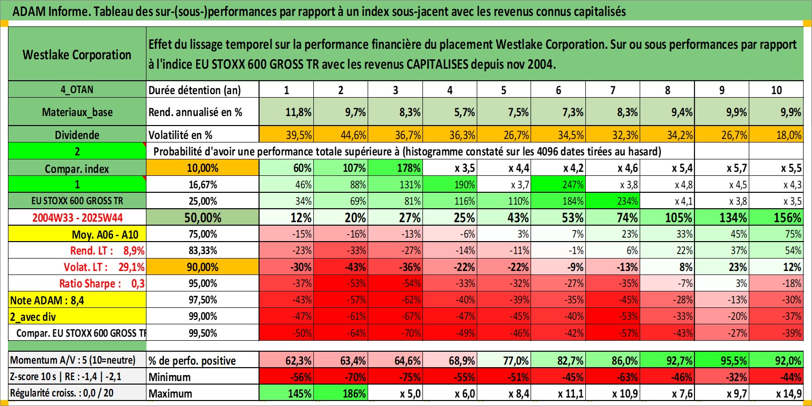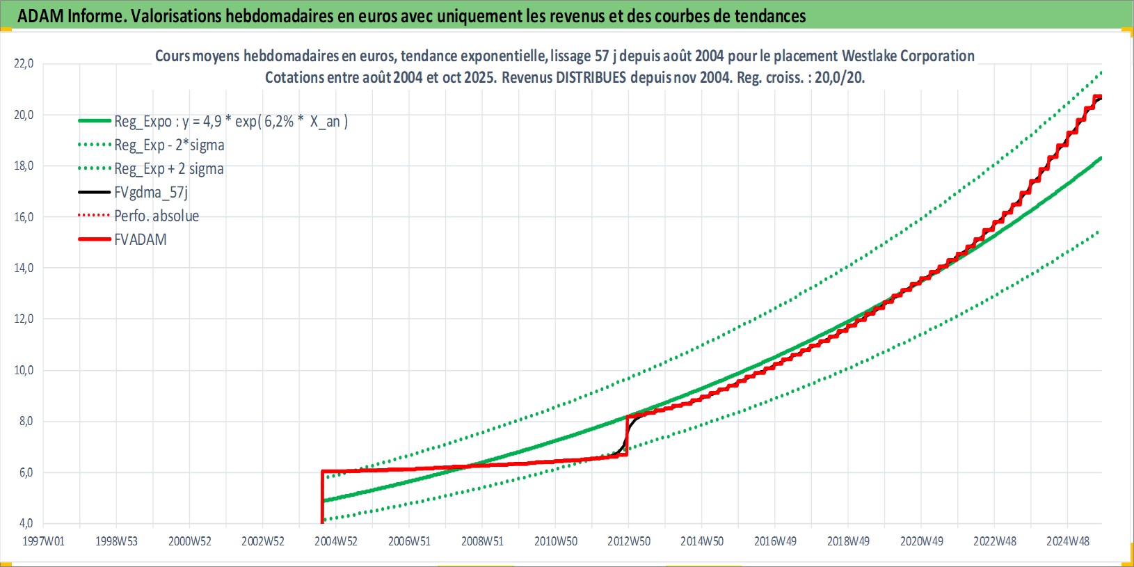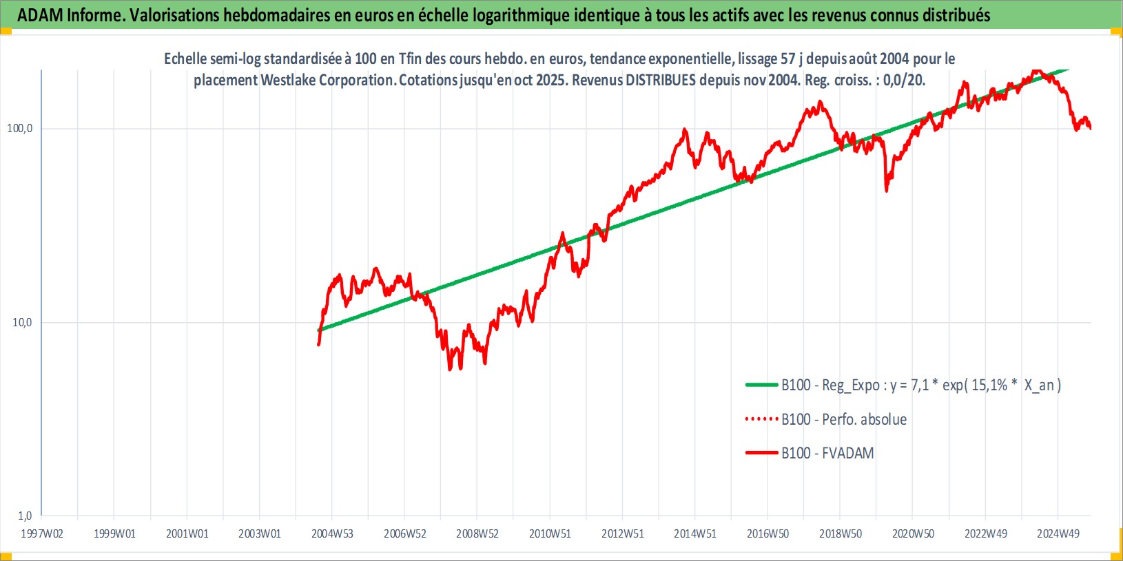 Site dédié aux investisseursPage dédiée sur site financeAnalyse des valorisations hebdomadaires de l'action Westlake Corporation. Cet actif est cote en USD. Les valorisations sont en contrevaleur EURO et couvrent les semaines 2004W33 a 2025W44. Les revenus de cet actif financier sont pris en compte depuis la semaine 2004W47. La note globale ESG de cet actif est estimee a 5.0 (apres rebasage entre 0 et 20).