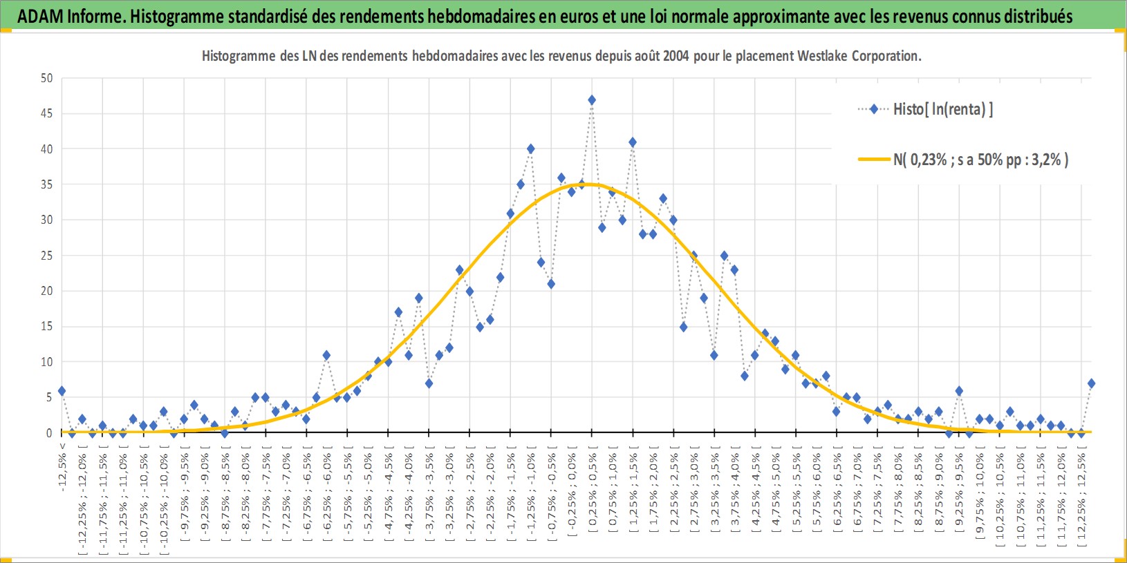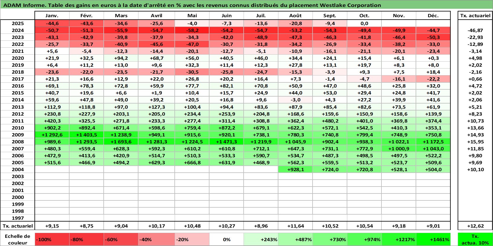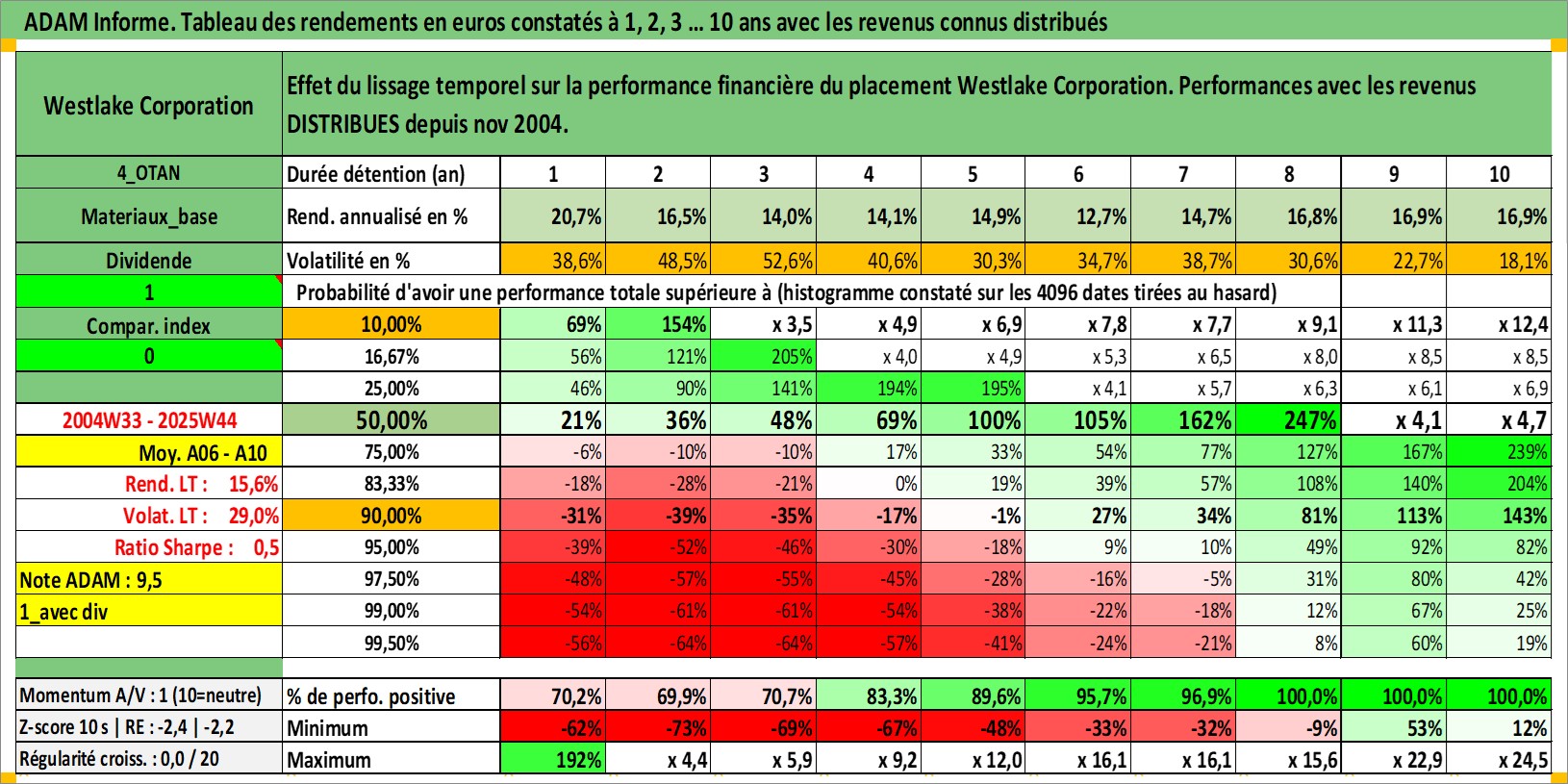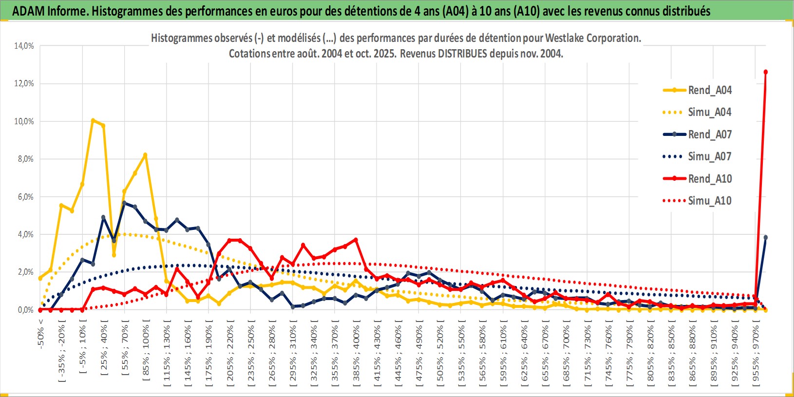 Site dédié aux investisseursPage dédiée sur site financeAnalyse des valorisations hebdomadaires de l'action Westlake Corporation. Cet actif est cote en USD. Les valorisations sont en contrevaleur EURO et couvrent les semaines 2004W33 a 2025W44. Les revenus de cet actif financier sont pris en compte depuis la semaine 2004W47. La note globale ESG de cet actif est estimee a 5.0 (apres rebasage entre 0 et 20).