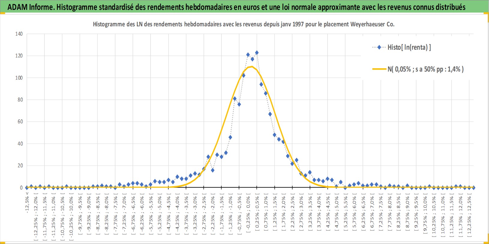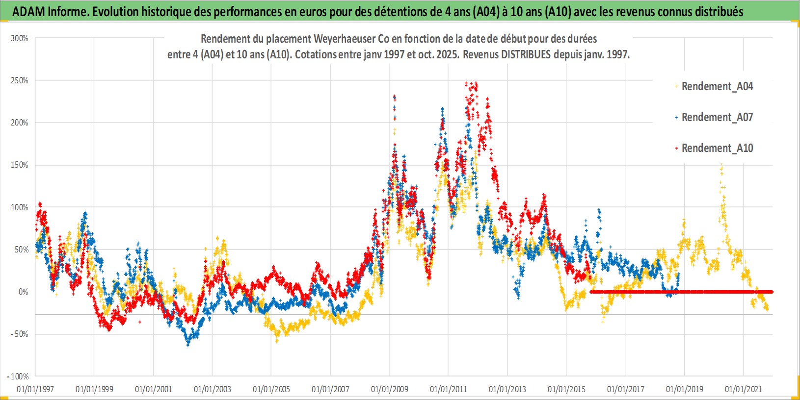 Site dédié aux investisseursPage dédiée sur site financeAnalyse des valorisations hebdomadaires de l'action Weyerhaeuser Co. Cet actif est cote en USD. Les valorisations sont en contrevaleur EURO et couvrent les semaines 1997W01 a 2025W44. Les revenus de cet actif financier sont pris en compte depuis la semaine 1997W05. La note globale ESG de cet actif est estimee a 11.0 (apres rebasage entre 0 et 20).