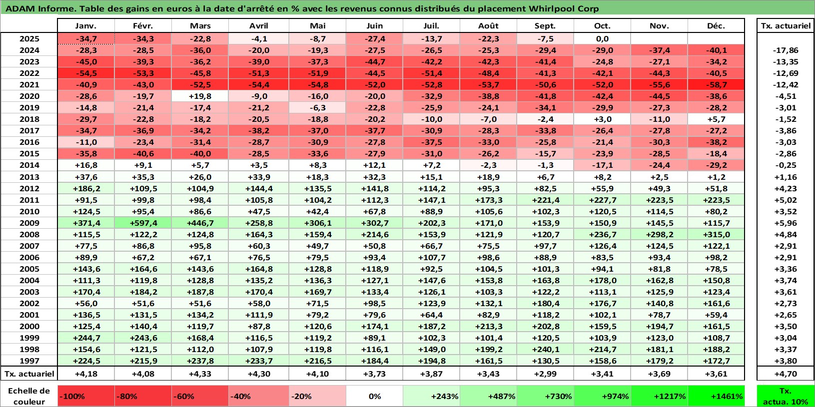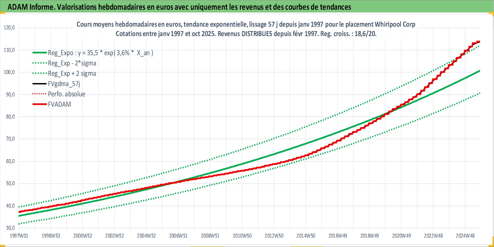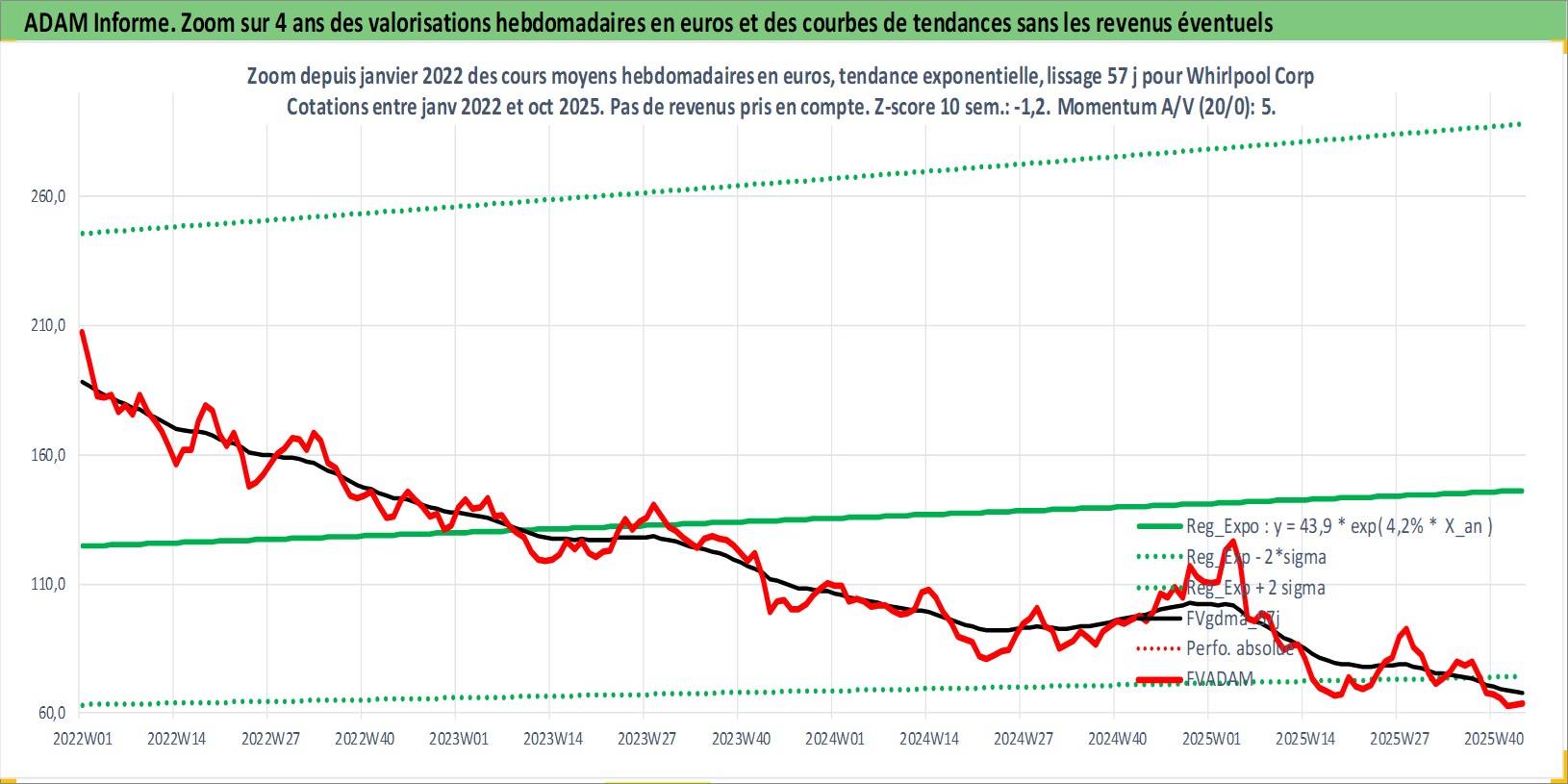 Site dédié aux investisseursPage dédiée sur site financeAnalyse des valorisations hebdomadaires de l'action Whirlpool Corp. Cet actif est cote en USD. Les valorisations sont en contrevaleur EURO et couvrent les semaines 1997W01 a 2025W44. Les revenus de cet actif financier sont pris en compte depuis la semaine 1997W09. La note globale ESG de cet actif est estimee a 13.0 (apres rebasage entre 0 et 20).