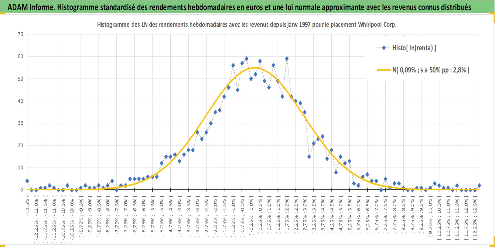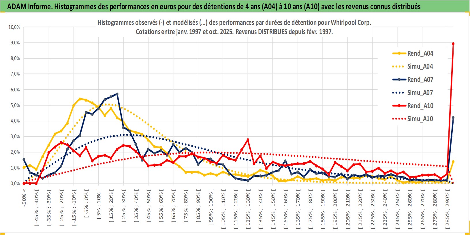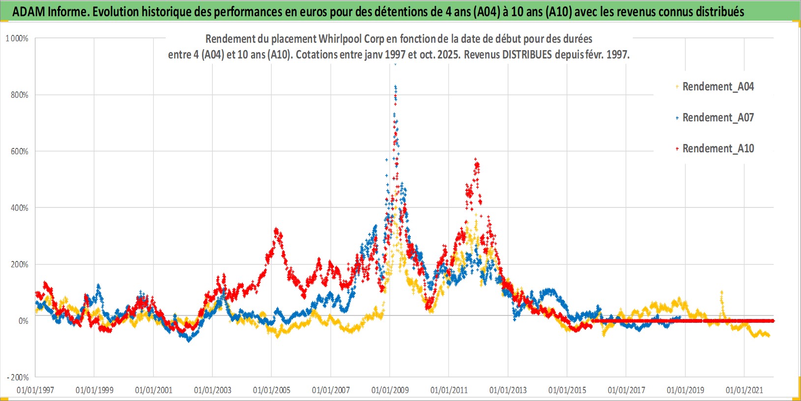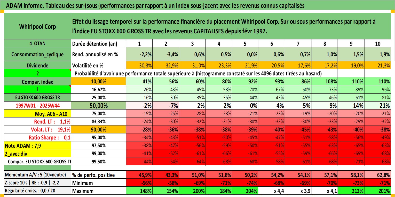 Site dédié aux investisseursPage dédiée sur site financeAnalyse des valorisations hebdomadaires de l'action Whirlpool Corp. Cet actif est cote en USD. Les valorisations sont en contrevaleur EURO et couvrent les semaines 1997W01 a 2025W44. Les revenus de cet actif financier sont pris en compte depuis la semaine 1997W09. La note globale ESG de cet actif est estimee a 13.0 (apres rebasage entre 0 et 20).