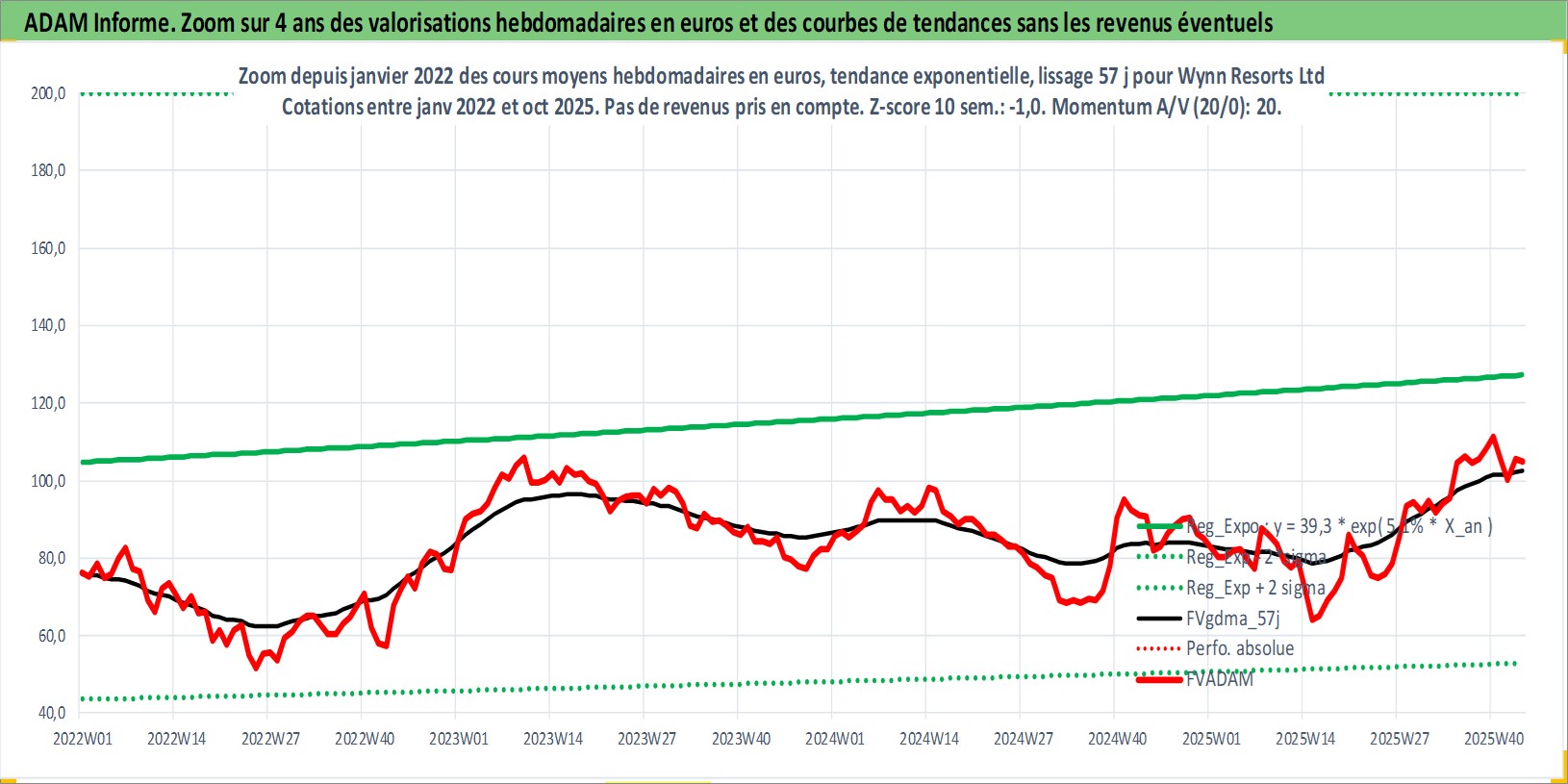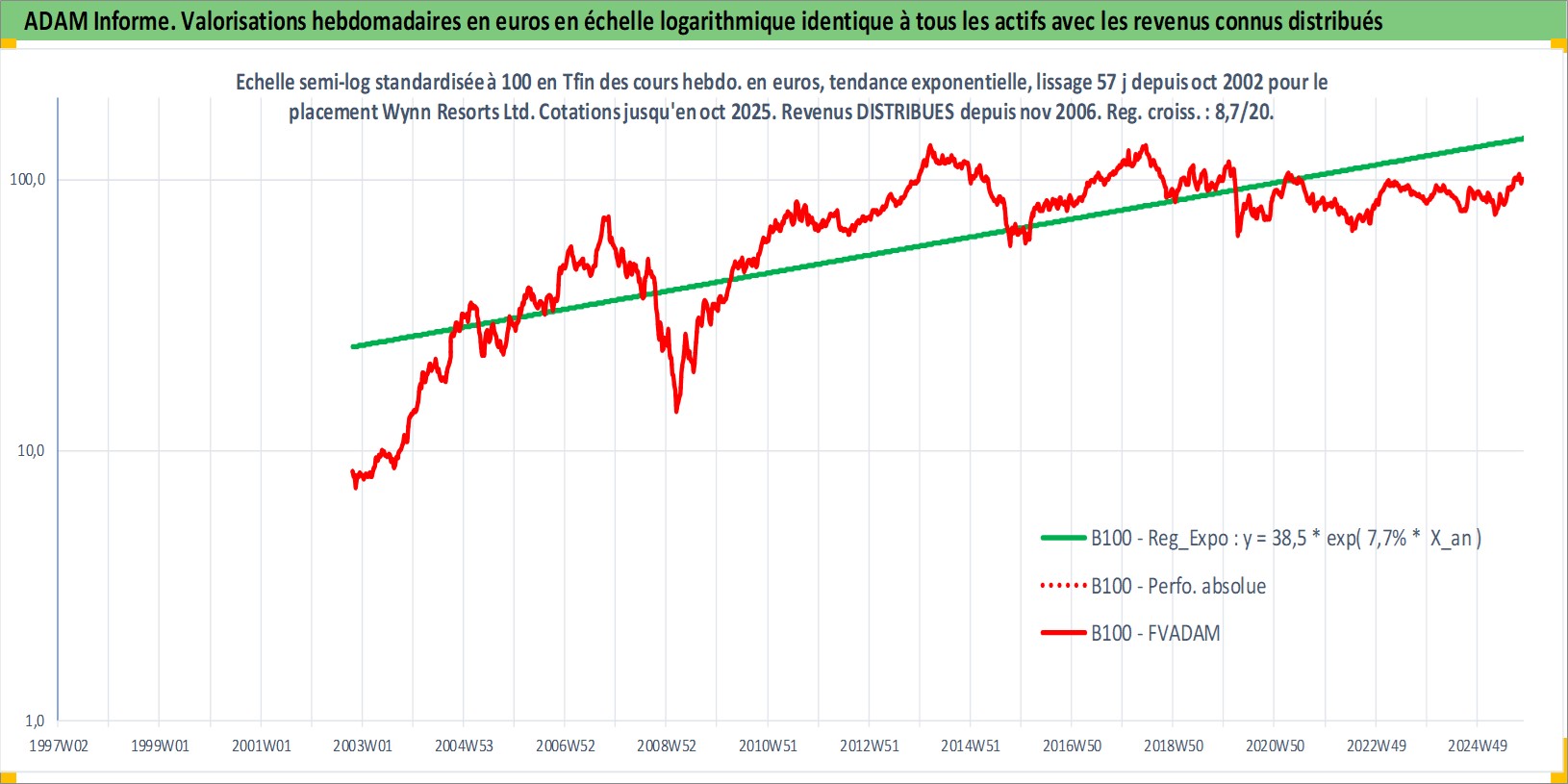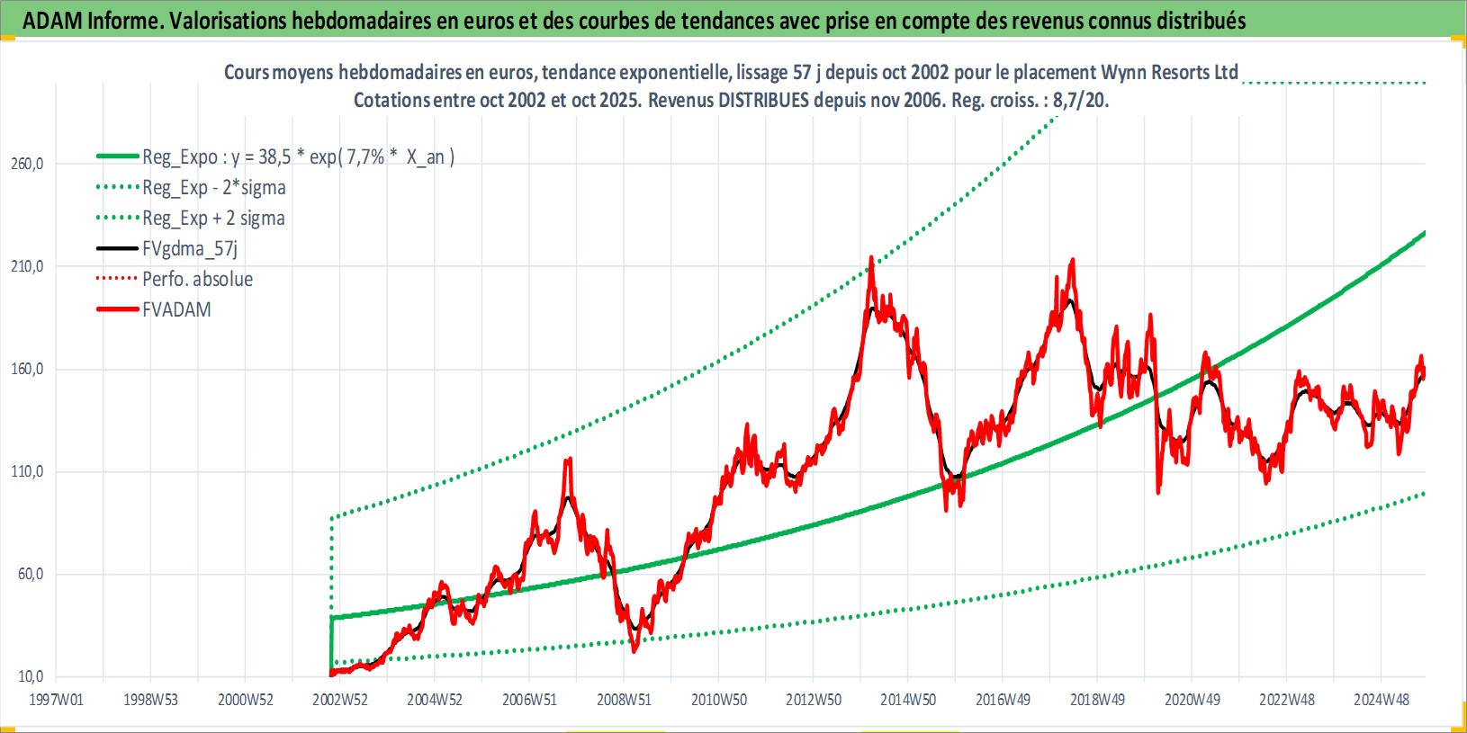 Site dédié aux investisseursPage dédiée sur site financeAnalyse des valorisations hebdomadaires de l'action Wynn Resorts Ltd. Cet actif est cote en USD. Les valorisations sont en contrevaleur EURO et couvrent les semaines 2002W43 a 2025W44. Les revenus de cet actif financier sont pris en compte depuis la semaine 2006W47. La note globale ESG de cet actif est estimee a 7.0 (apres rebasage entre 0 et 20).