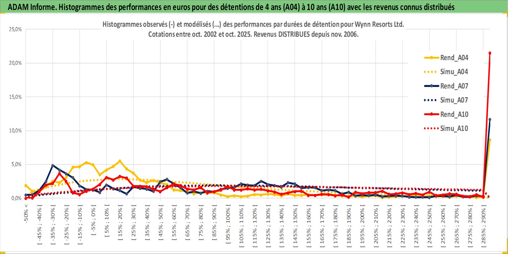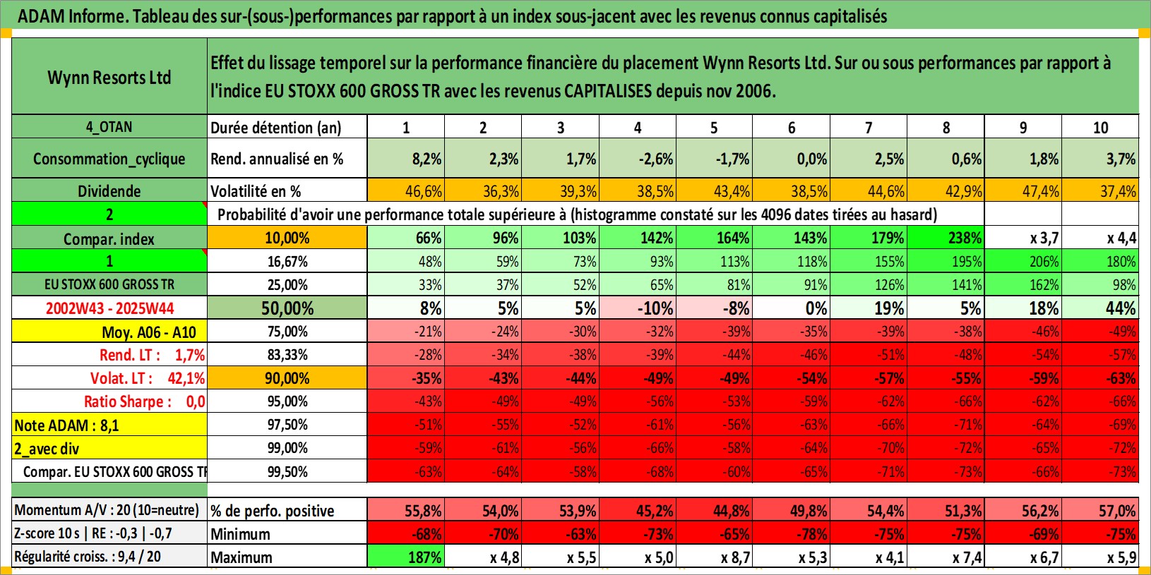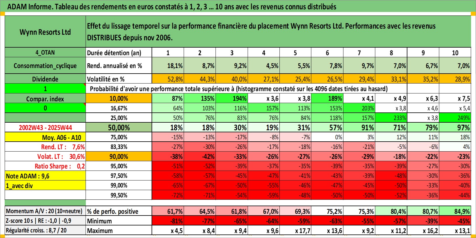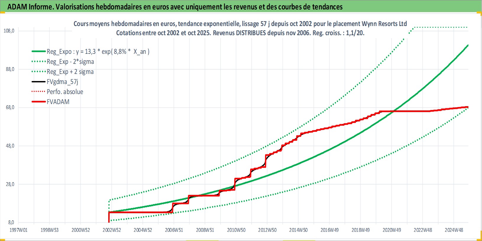 Site dédié aux investisseursPage dédiée sur site financeAnalyse des valorisations hebdomadaires de l'action Wynn Resorts Ltd. Cet actif est cote en USD. Les valorisations sont en contrevaleur EURO et couvrent les semaines 2002W43 a 2025W44. Les revenus de cet actif financier sont pris en compte depuis la semaine 2006W47. La note globale ESG de cet actif est estimee a 7.0 (apres rebasage entre 0 et 20).