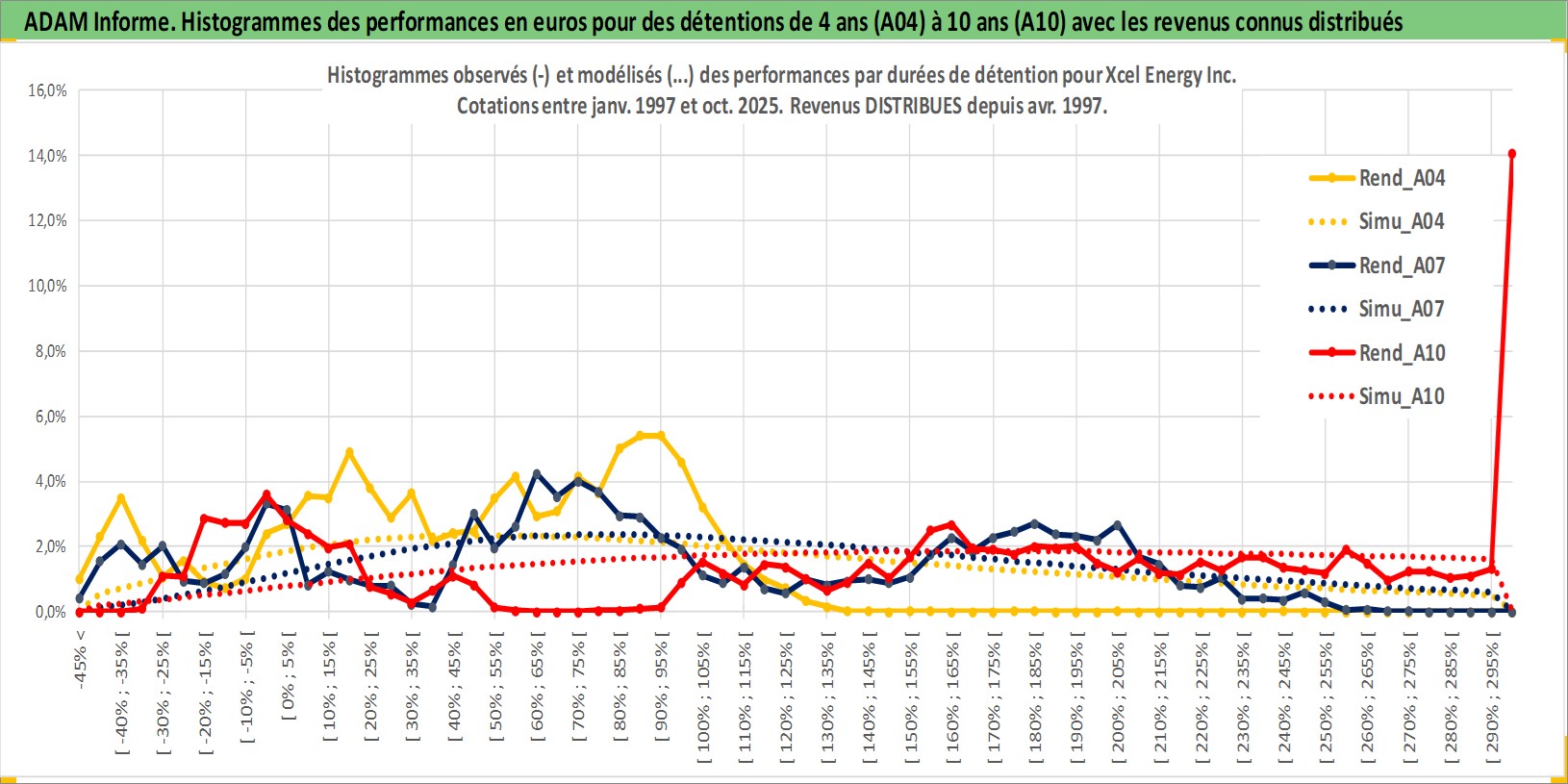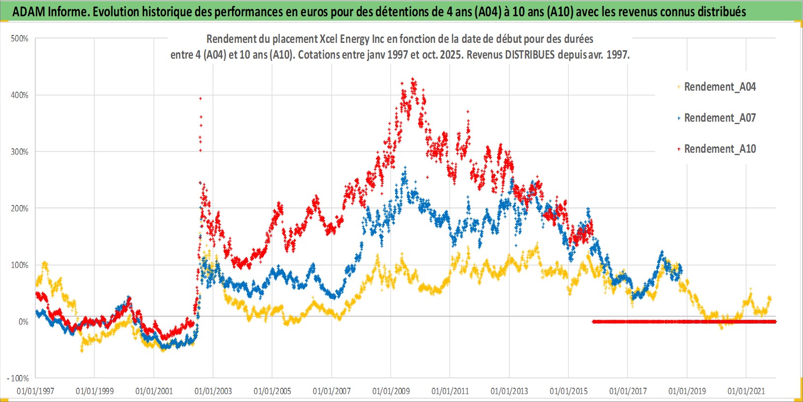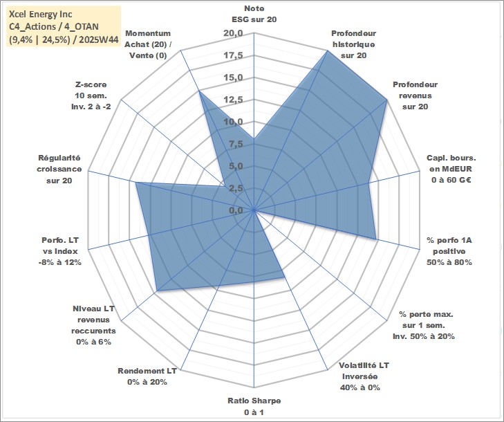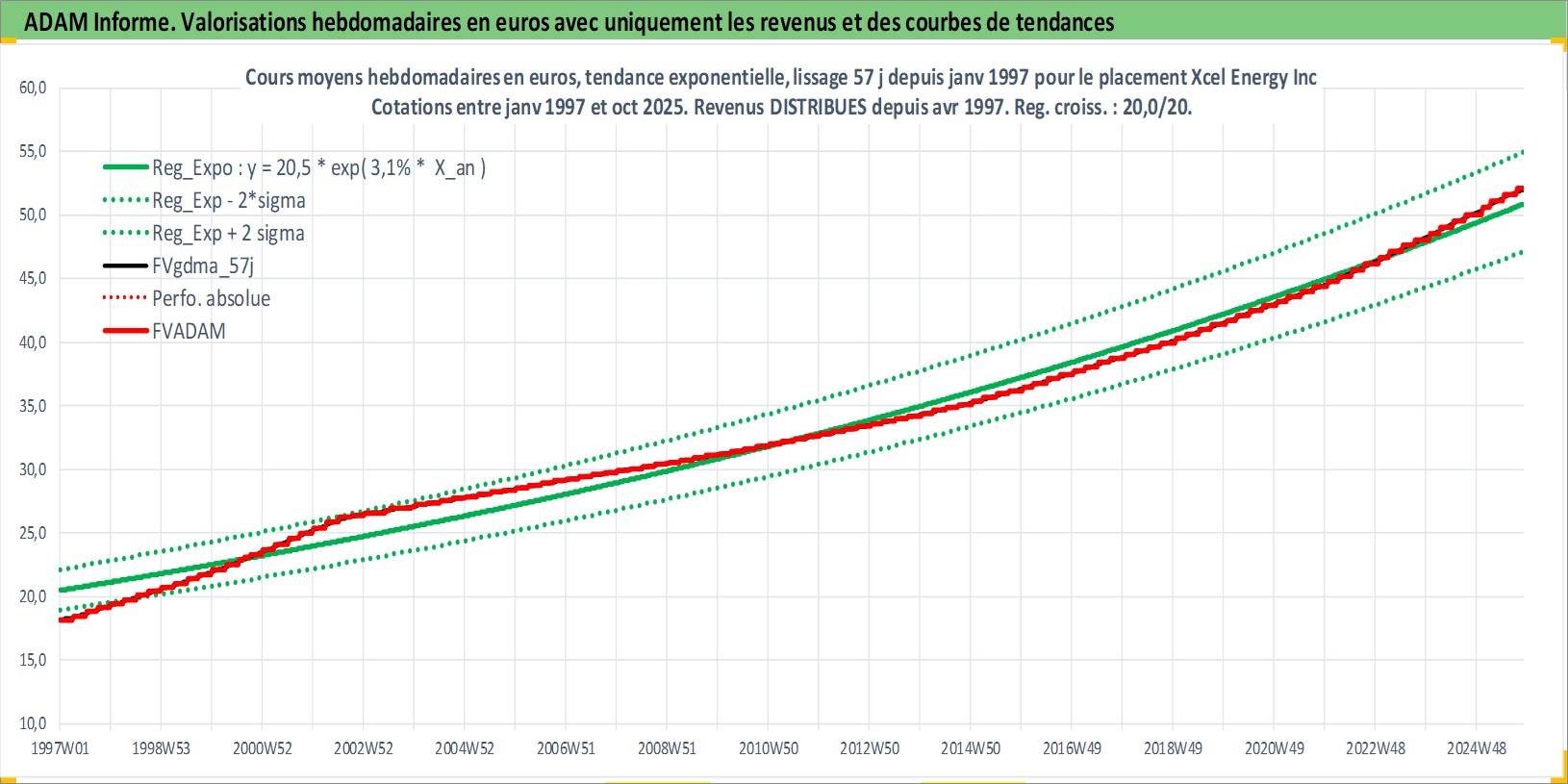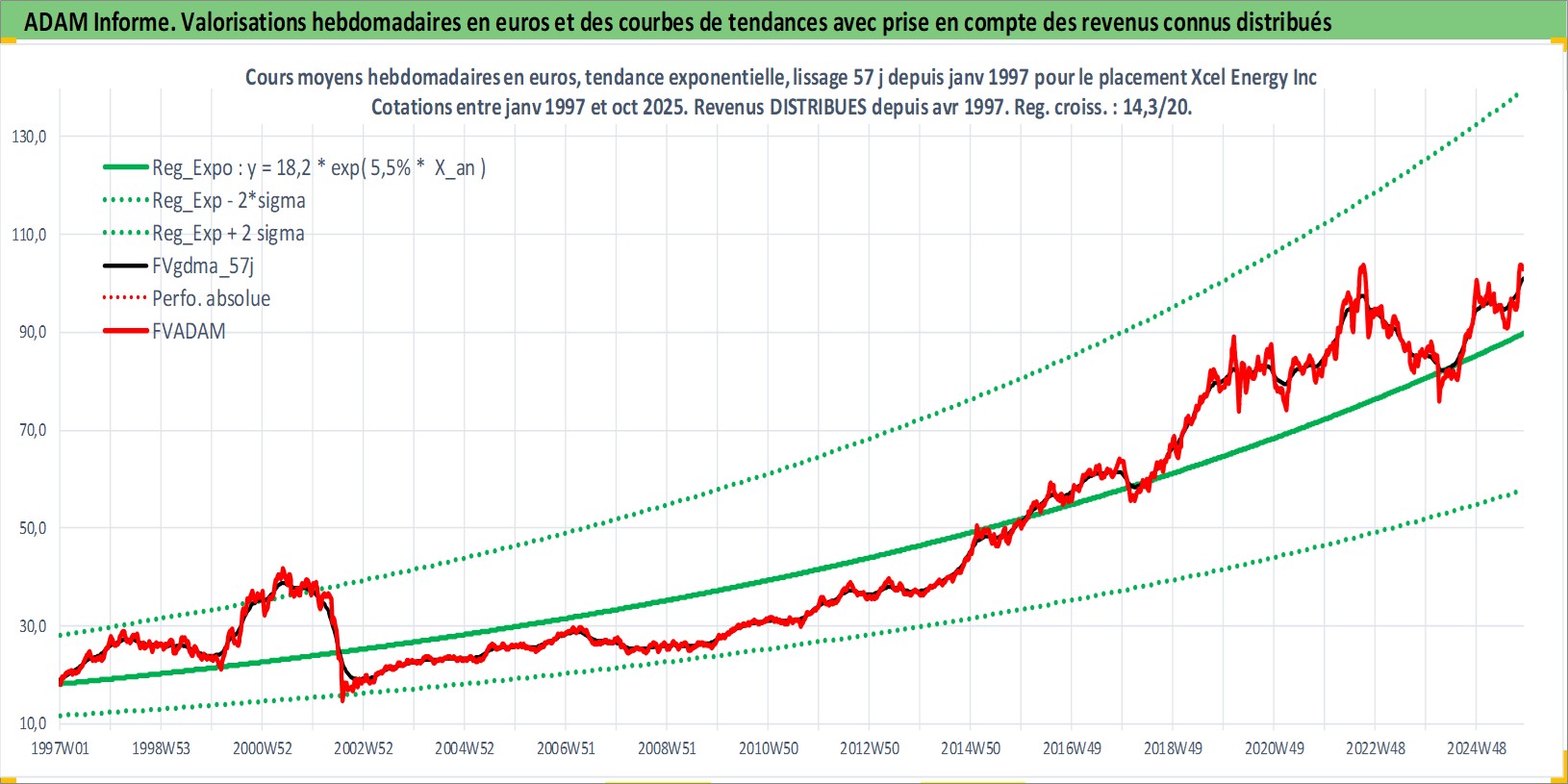 Site dédié aux investisseursPage dédiée sur site financeAnalyse des valorisations hebdomadaires de l'action Xcel Energy Inc. Cet actif est cote en USD. Les valorisations sont en contrevaleur EURO et couvrent les semaines 1997W01 a 2025W44. Les revenus de cet actif financier sont pris en compte depuis la semaine 1997W15. La note globale ESG de cet actif est estimee a 8.0 (apres rebasage entre 0 et 20).