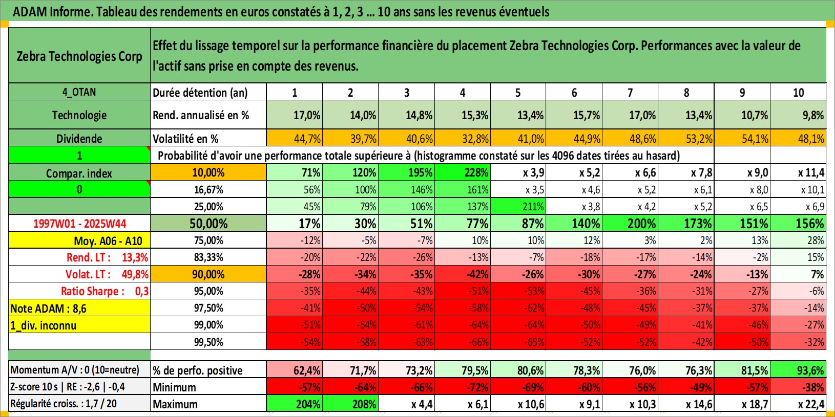 Site dédié aux investisseursPage dédiée sur site financeAnalyse des valorisations hebdomadaires de l'action Zebra Technologies Corp. Cet actif est cote en USD. Les valorisations sont en contrevaleur EURO et couvrent les semaines 1997W01 a 2025W44. Les revenus de cet actif financier ne sont pas connus car non existants ou non disponibles sur le site Yahoo Finance. La note ESG de cet actif n'est pas connue.