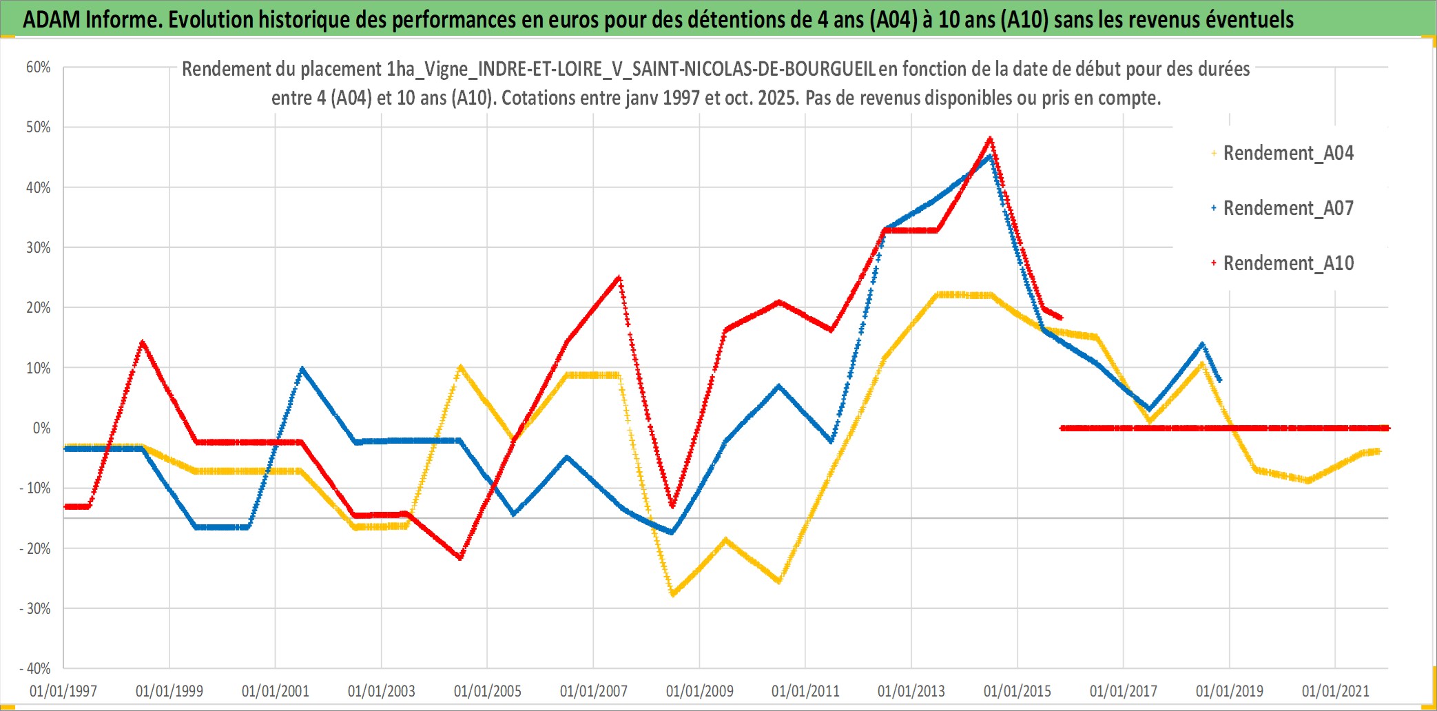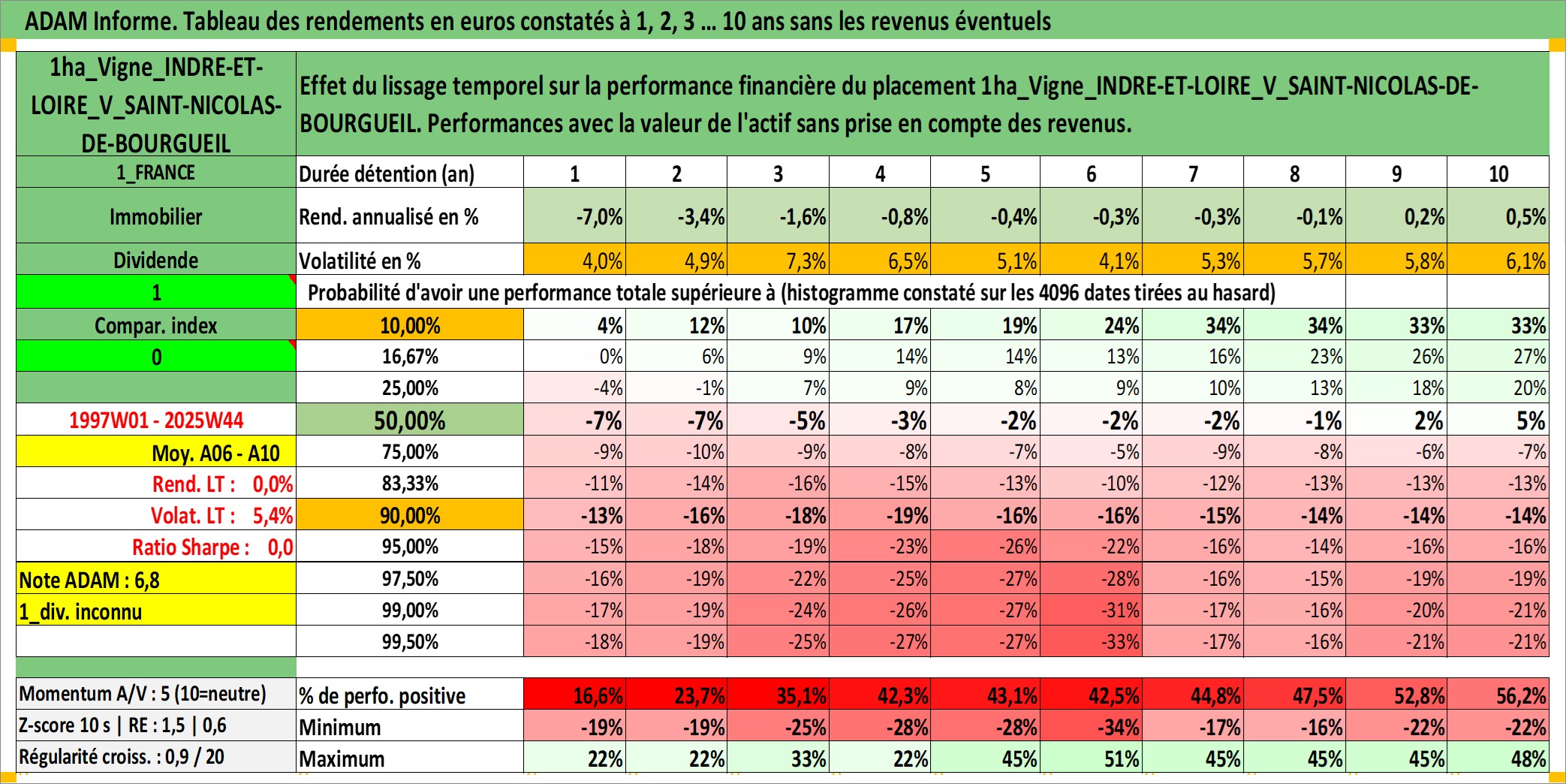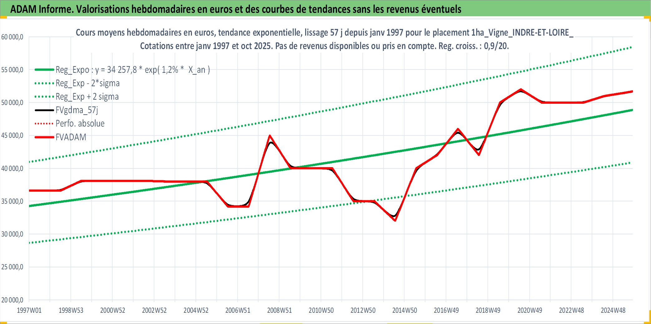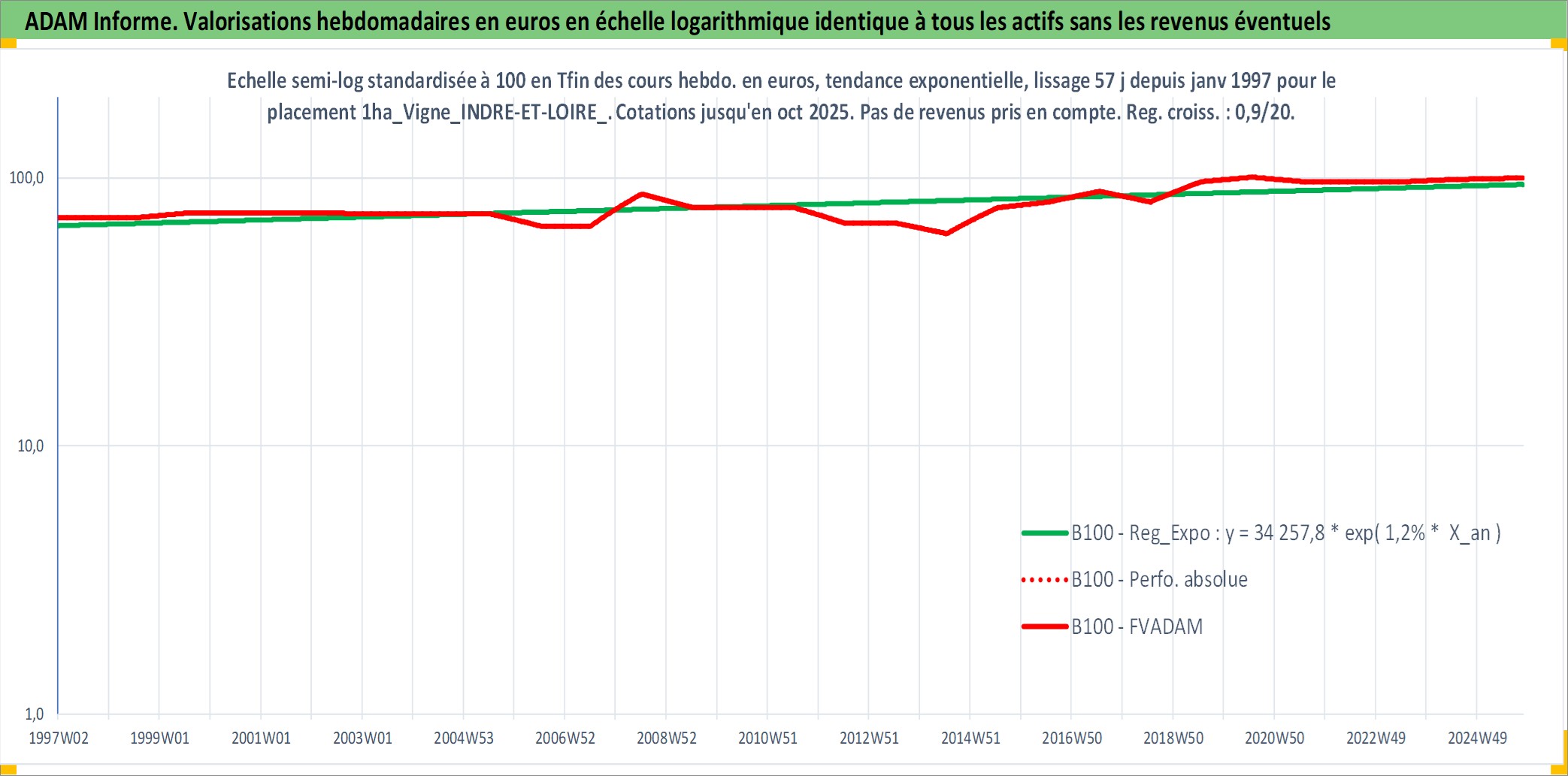 Site dédié aux investisseursPage dédiée sur site financeAnalyse des valorisations hebdomadaires de l'actif 1ha_Vigne_INDRE-ET-LOIRE_V_SAINT-NICOLAS-DE-BOURGUEIL. Cet actif est cote en EUR. Les valorisations couvrent les semaines 1997W01 a 2025W44. Les fermages de ce bien foncier sont pris egaux a 2,5% annuels de la valeur venale du bien.