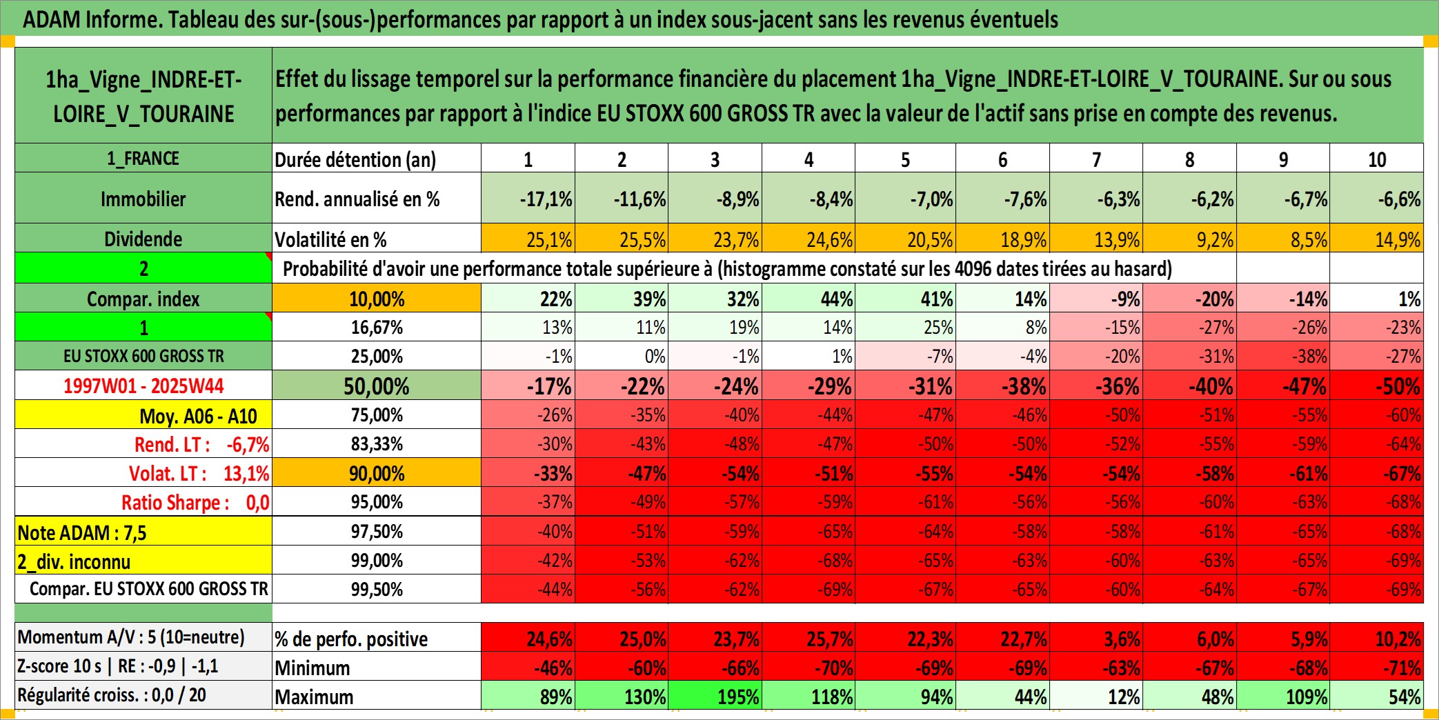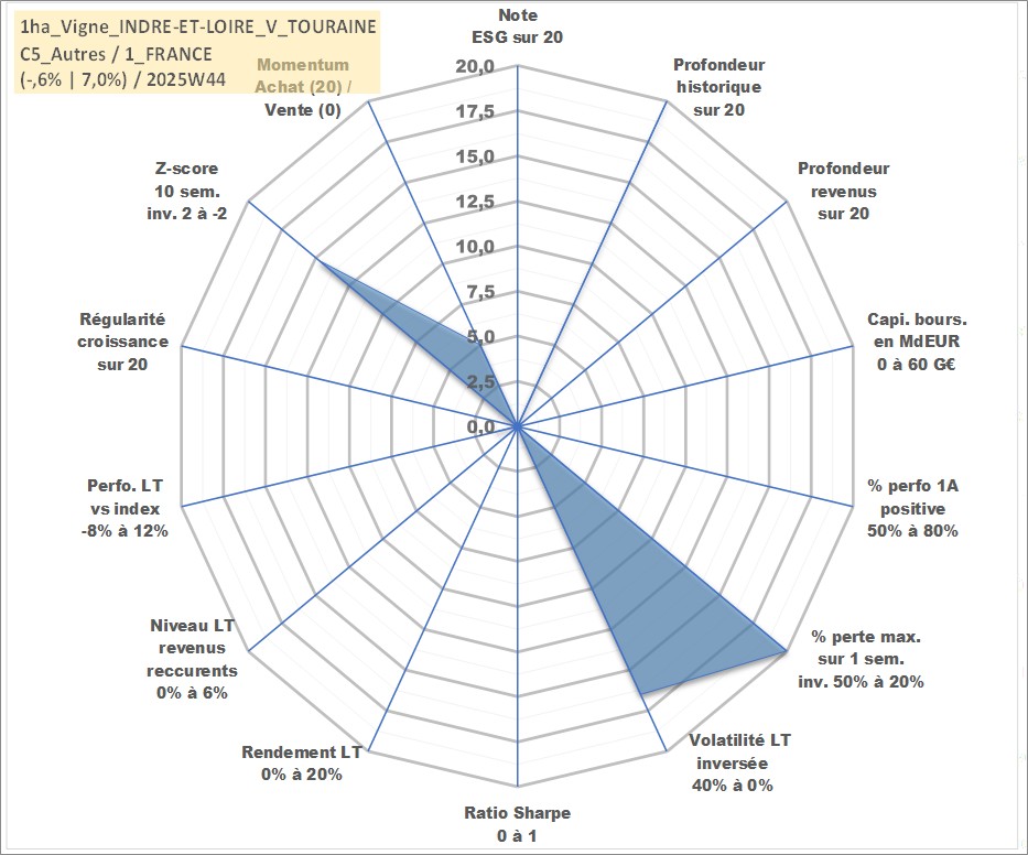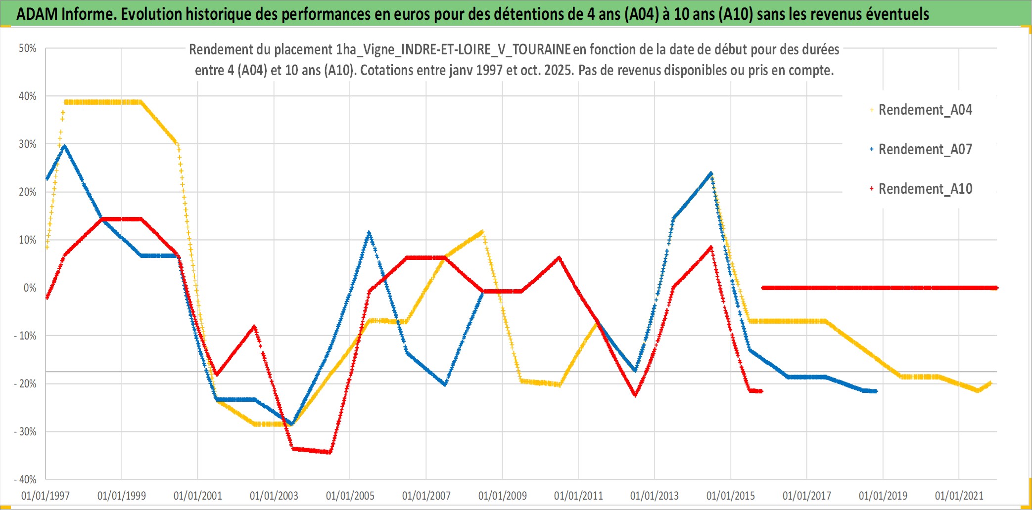 Site dédié aux investisseursPage dédiée sur site financeAnalyse des valorisations hebdomadaires de l'actif 1ha_Vigne_INDRE-ET-LOIRE_V_TOURAINE. Cet actif est cote en EUR. Les valorisations couvrent les semaines 1997W01 a 2025W44. Les fermages de ce bien foncier sont pris egaux a 2,5% annuels de la valeur venale du bien.