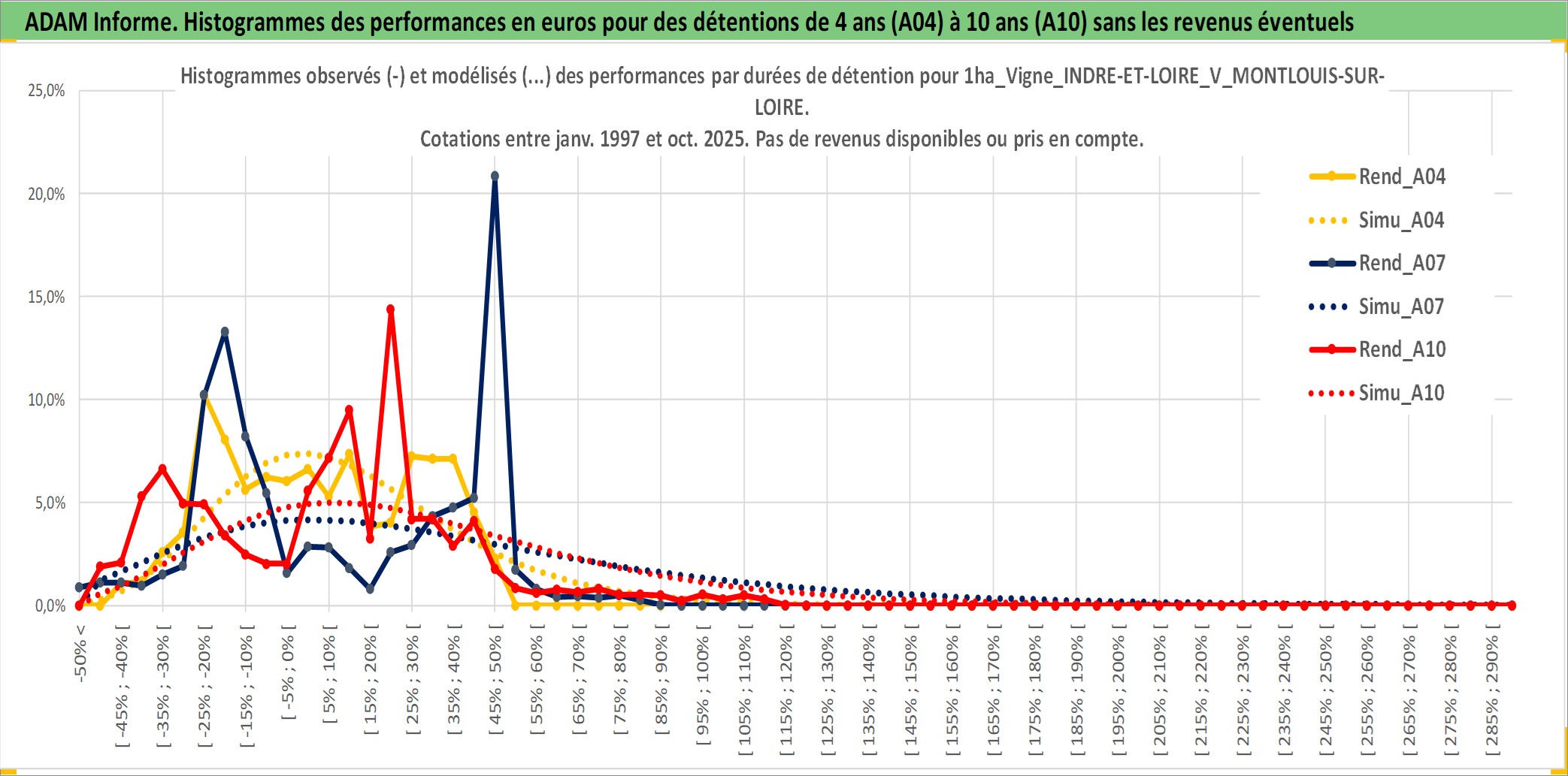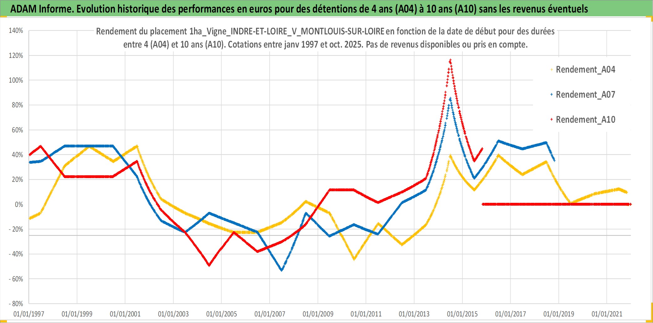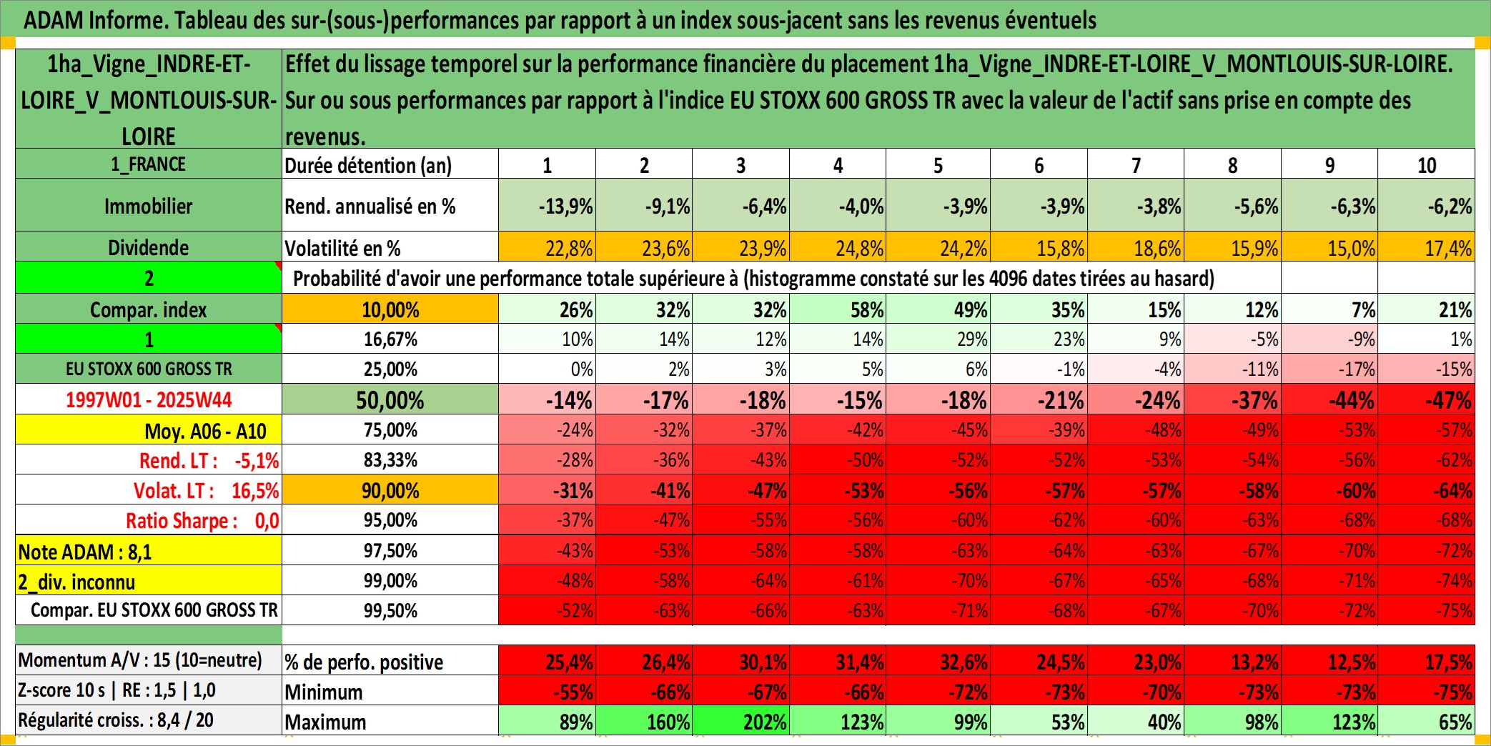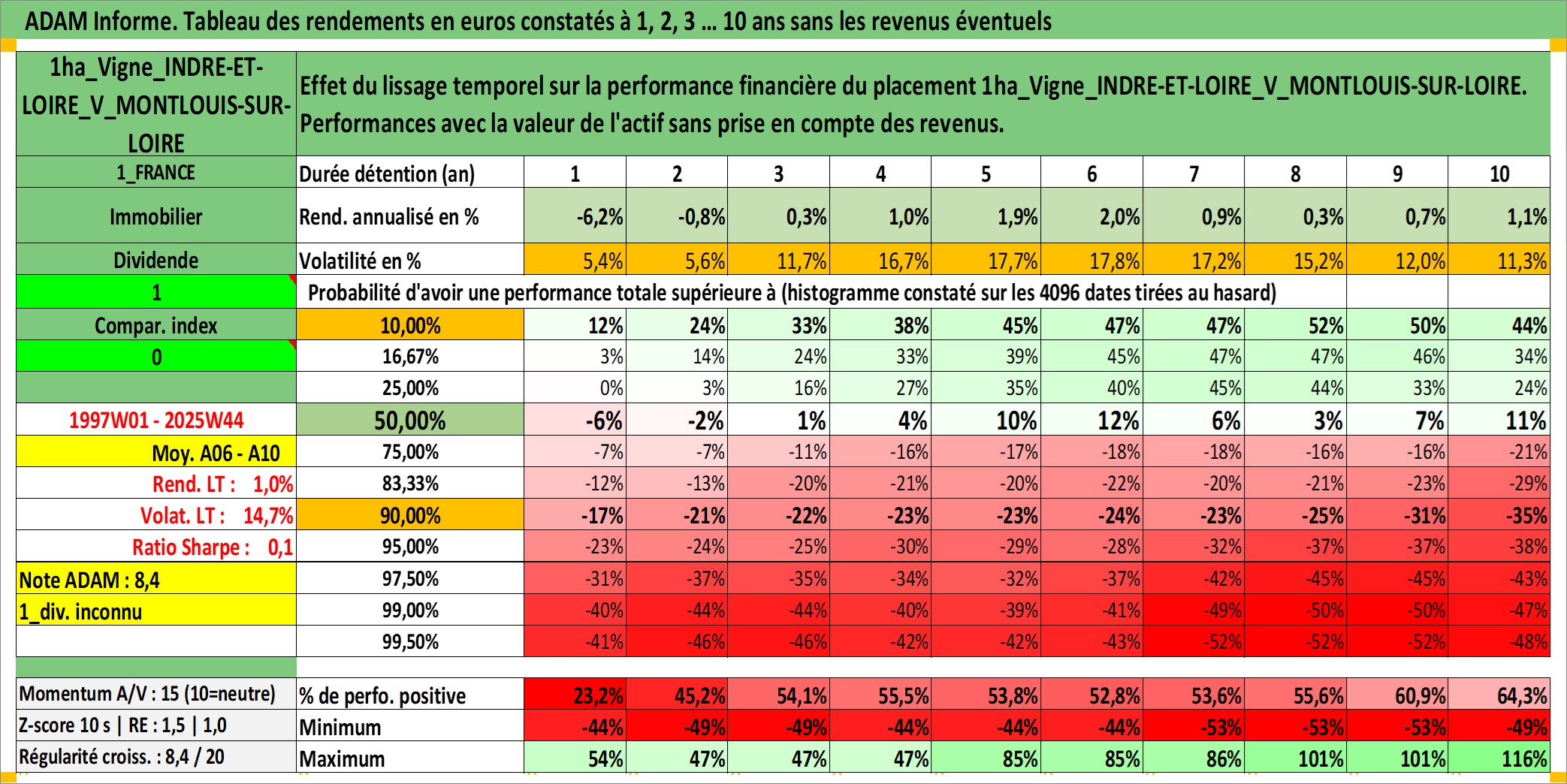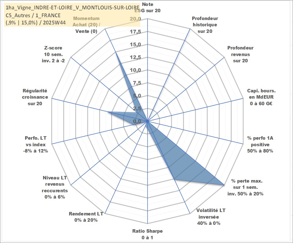 Site dédié aux investisseursPage dédiée sur site financeAnalyse des valorisations hebdomadaires de l'actif 1ha_Vigne_INDRE-ET-LOIRE_V_MONTLOUIS-SUR-LOIRE. Cet actif est cote en EUR. Les valorisations couvrent les semaines 1997W01 a 2025W44. Les fermages de ce bien foncier sont pris egaux a 2,5% annuels de la valeur venale du bien.