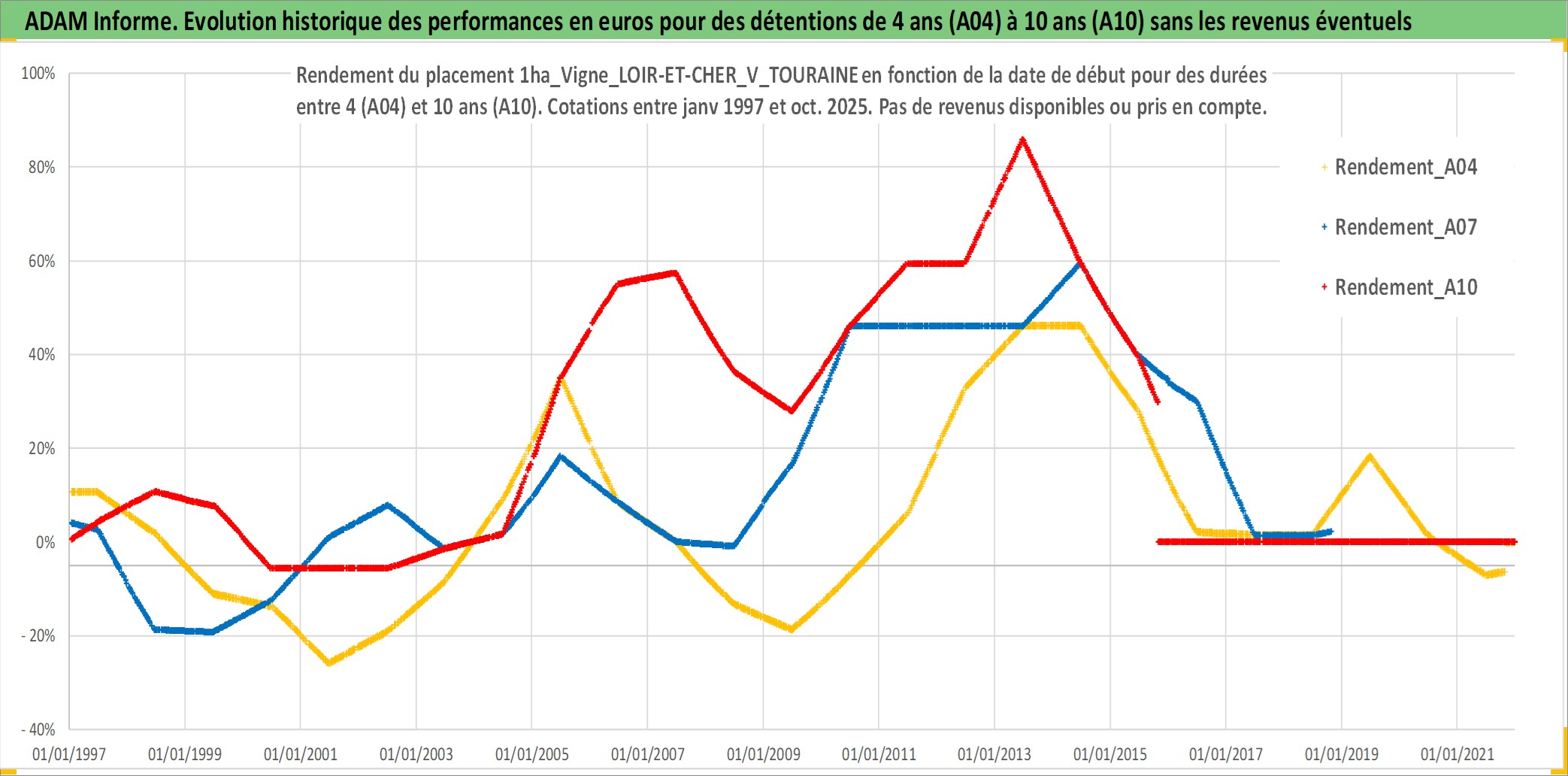 Site dédié aux investisseursPage dédiée sur site financeAnalyse des valorisations hebdomadaires de l'actif 1ha_Vigne_LOIR-ET-CHER_V_TOURAINE. Cet actif est cote en EUR. Les valorisations couvrent les semaines 1997W01 a 2025W44. Les fermages de ce bien foncier sont pris egaux a 2,5% annuels de la valeur venale du bien.
