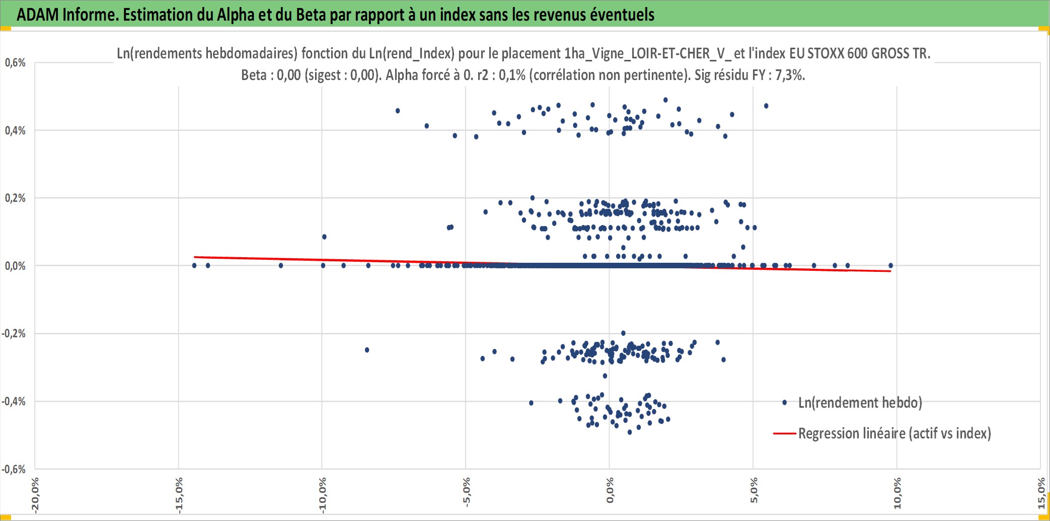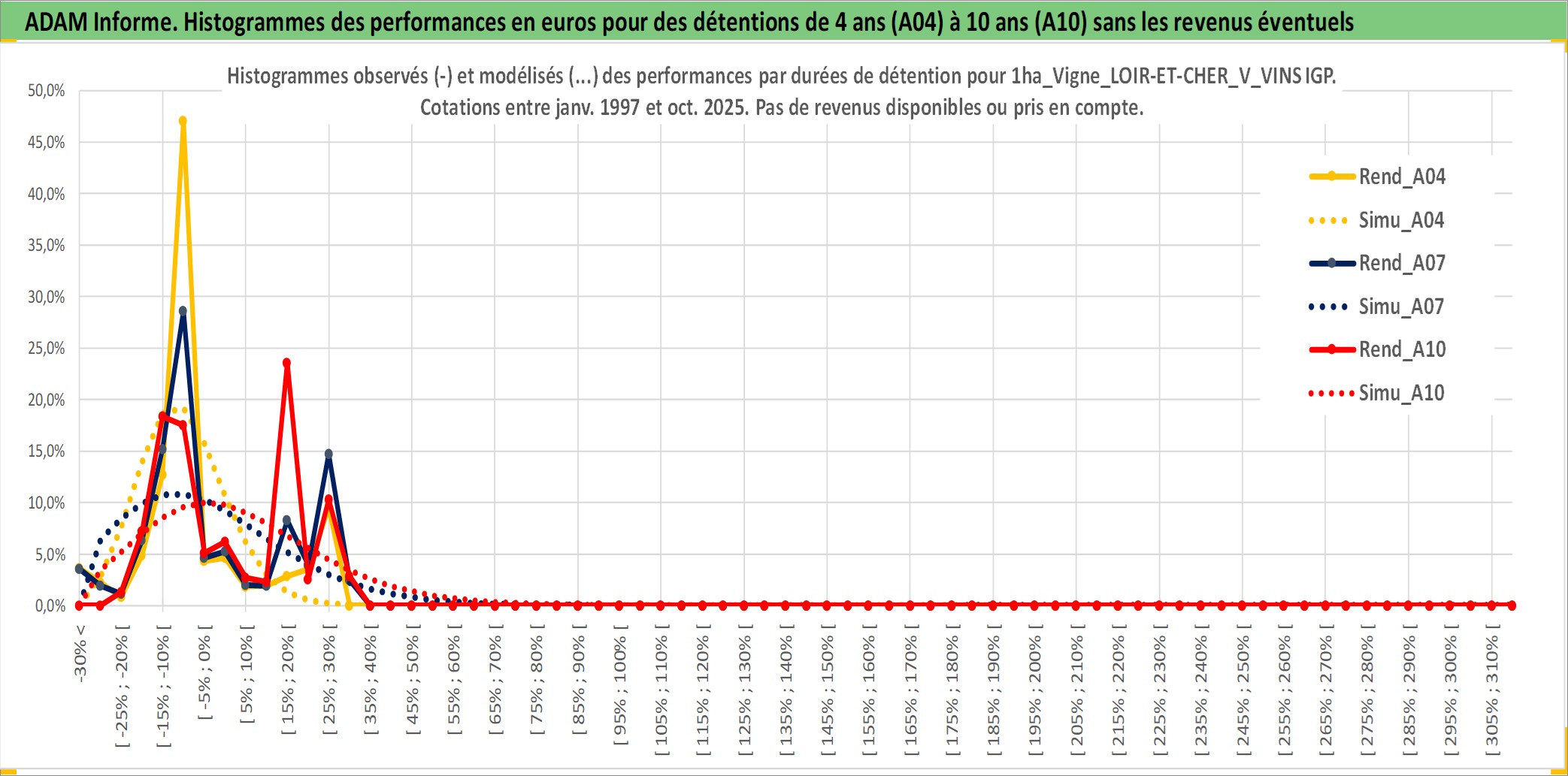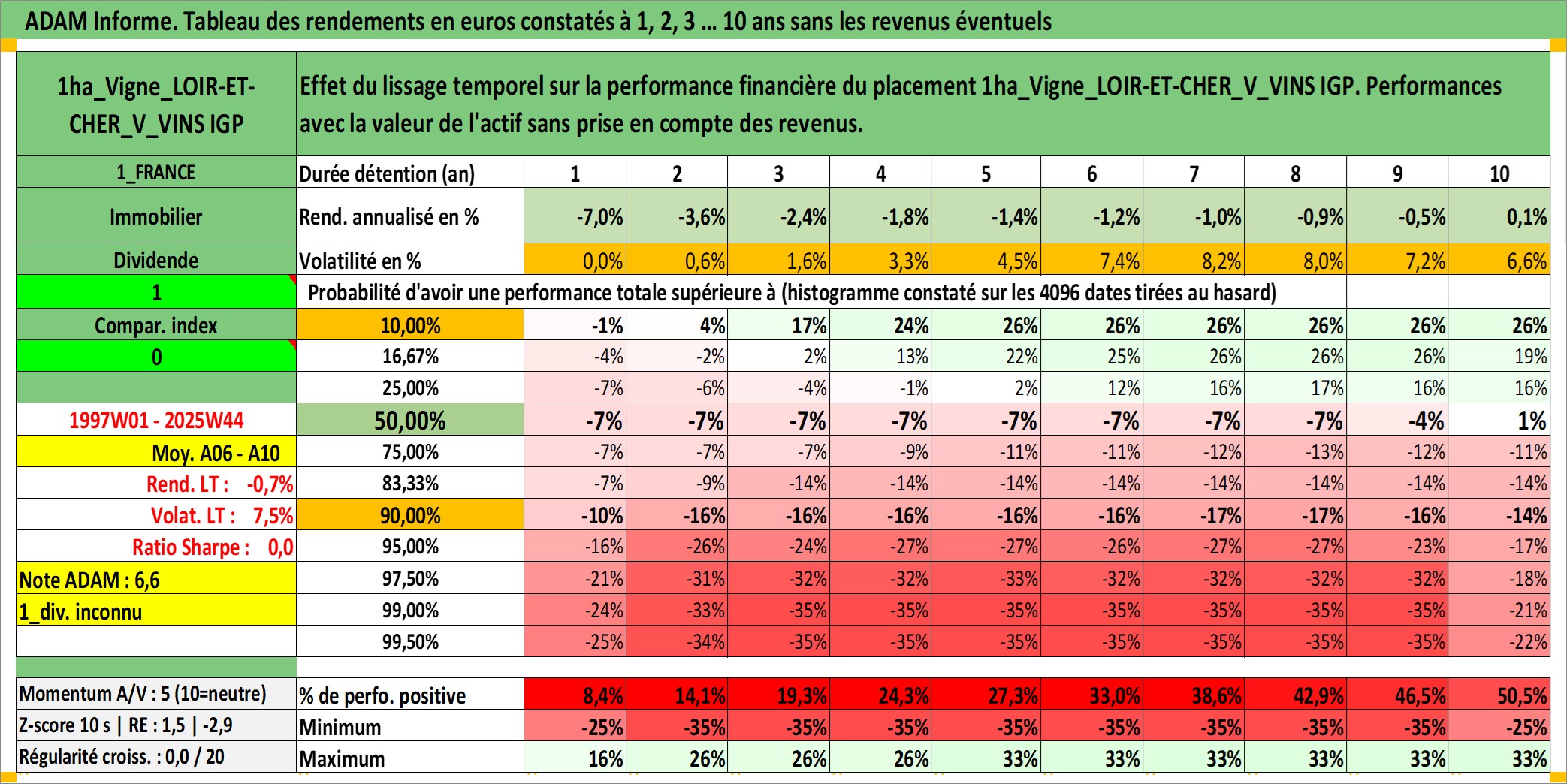 Site dédié aux investisseursPage dédiée sur site financeAnalyse des valorisations hebdomadaires de l'actif 1ha_Vigne_LOIR-ET-CHER_V_VINS IGP. Cet actif est cote en EUR. Les valorisations couvrent les semaines 1997W01 a 2025W44. Les fermages de ce bien foncier sont pris egaux a 2,5% annuels de la valeur venale du bien.
