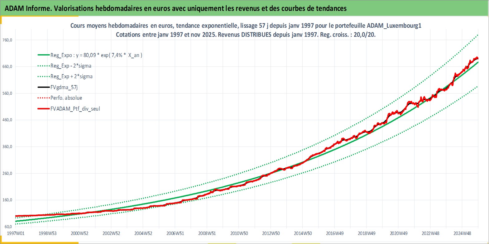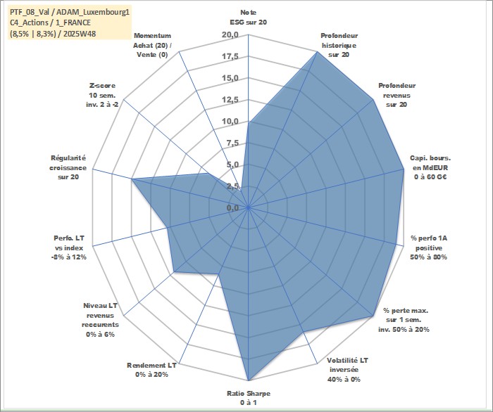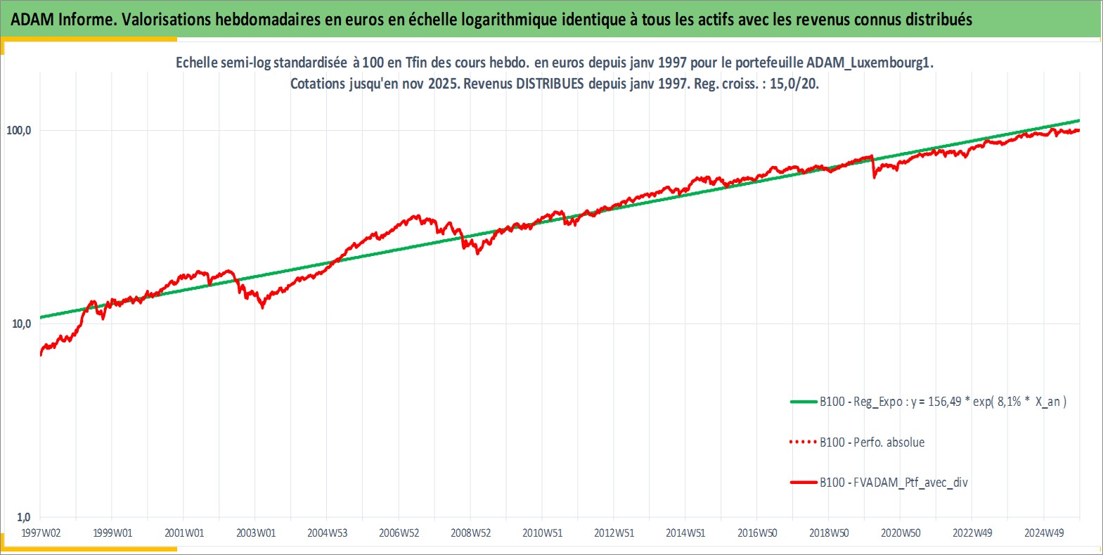 Site dédié aux investisseursPage dédiée sur site financeAnalyse des valorisations hebdomadaires du portefeuille ADAM_Luxembourg1_8actifs avec un profil P6_PurActions. Ce portefeuille est cote en EUR. Les valorisations couvrent les semaines 1997W01 a 2025W48. Les revenus de cet actif financier sont pris en compte depuis la semaine 1997W01. La note globale ESG de cet actif est estimee a 9.7 (apres rebasage entre 0 et 20).