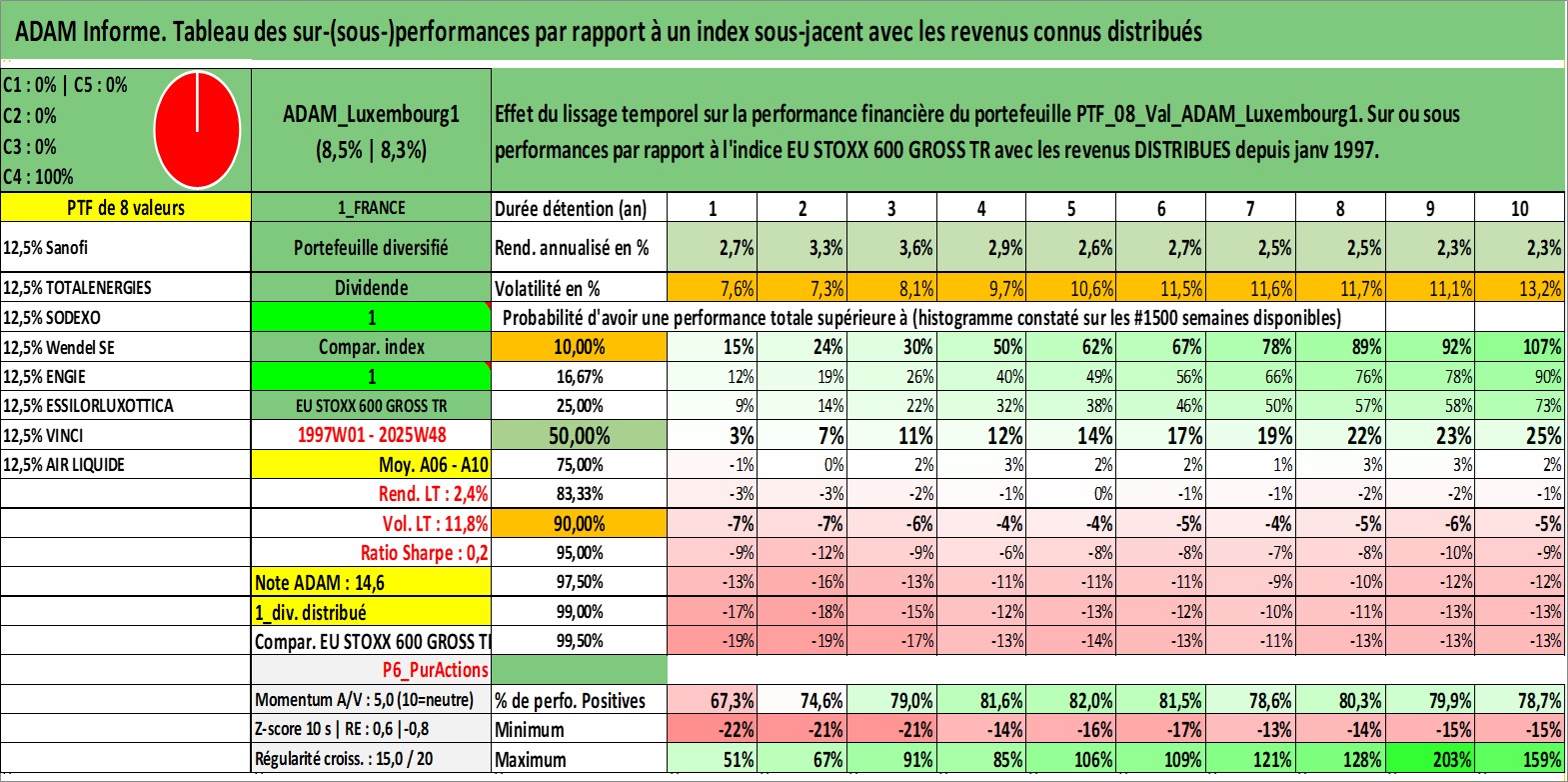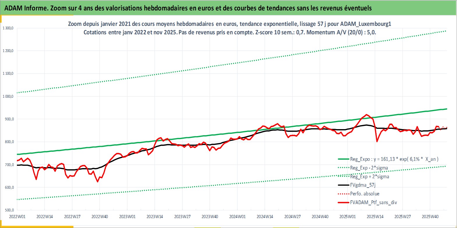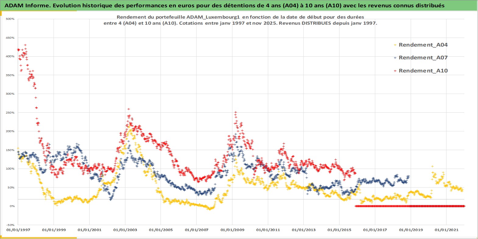 Site dédié aux investisseursPage dédiée sur site financeAnalyse des valorisations hebdomadaires du portefeuille ADAM_Luxembourg1_8actifs avec un profil P6_PurActions. Ce portefeuille est cote en EUR. Les valorisations couvrent les semaines 1997W01 a 2025W48. Les revenus de cet actif financier sont pris en compte depuis la semaine 1997W01. La note globale ESG de cet actif est estimee a 9.7 (apres rebasage entre 0 et 20).