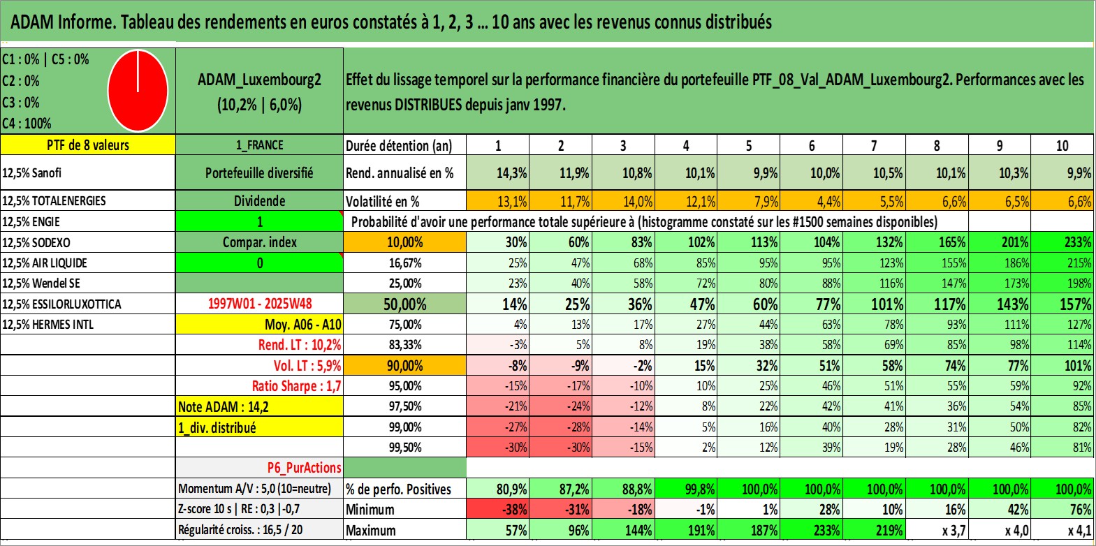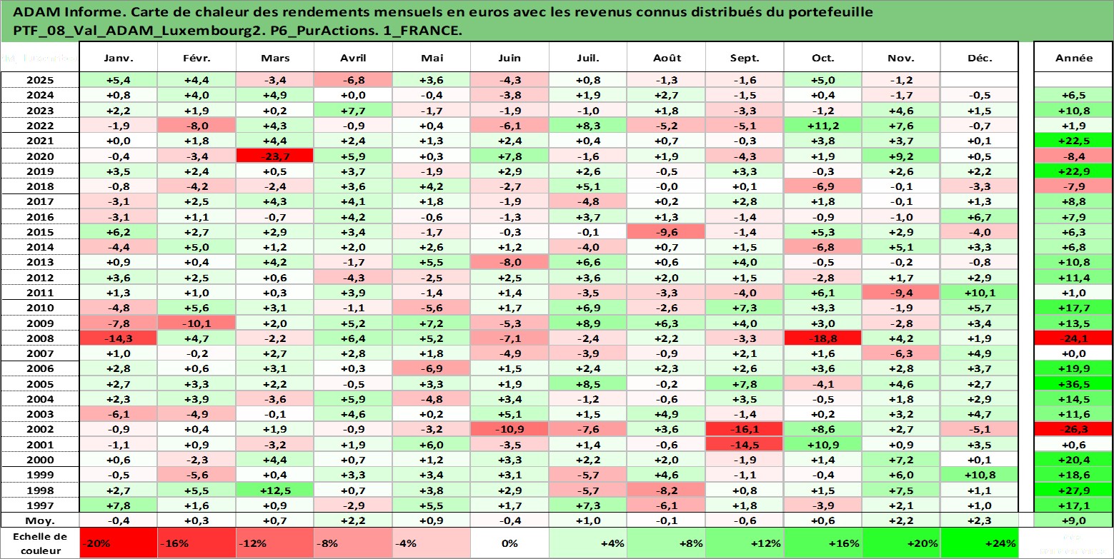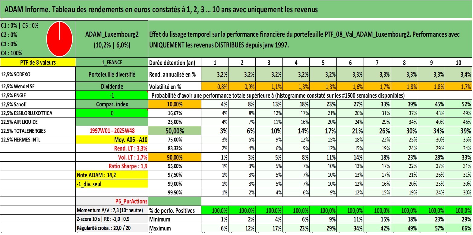 Site dédié aux investisseursPage dédiée sur site financeAnalyse des valorisations hebdomadaires du portefeuille ADAM_Luxembourg2_8actifs avec un profil P6_PurActions. Ce portefeuille est cote en EUR. Les valorisations couvrent les semaines 1997W01 a 2025W48. Les revenus de cet actif financier sont pris en compte depuis la semaine 1997W01. La note globale ESG de cet actif est estimee a 11.0 (apres rebasage entre 0 et 20).