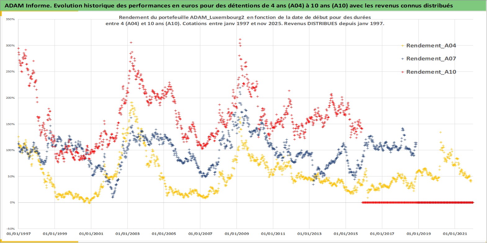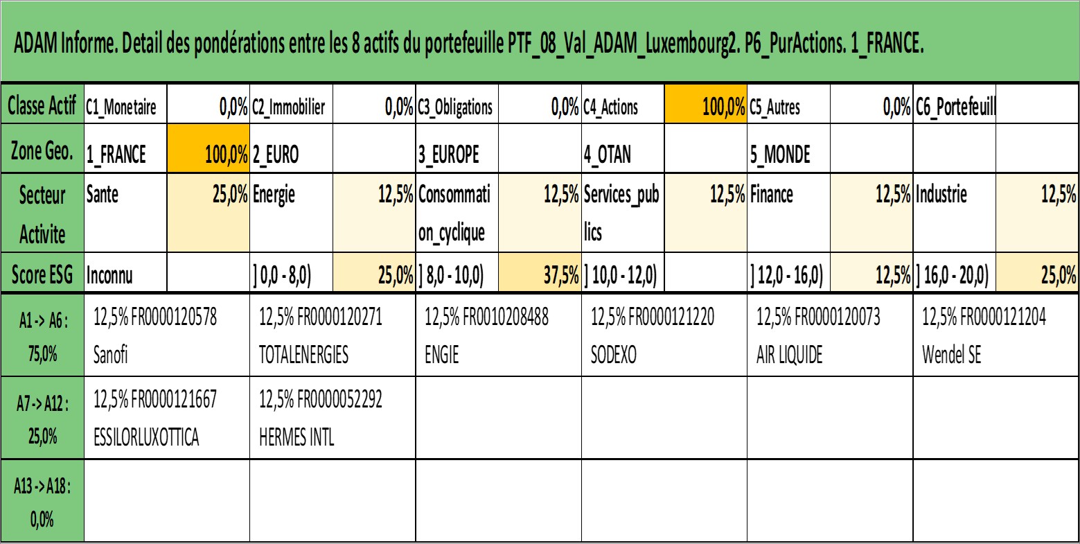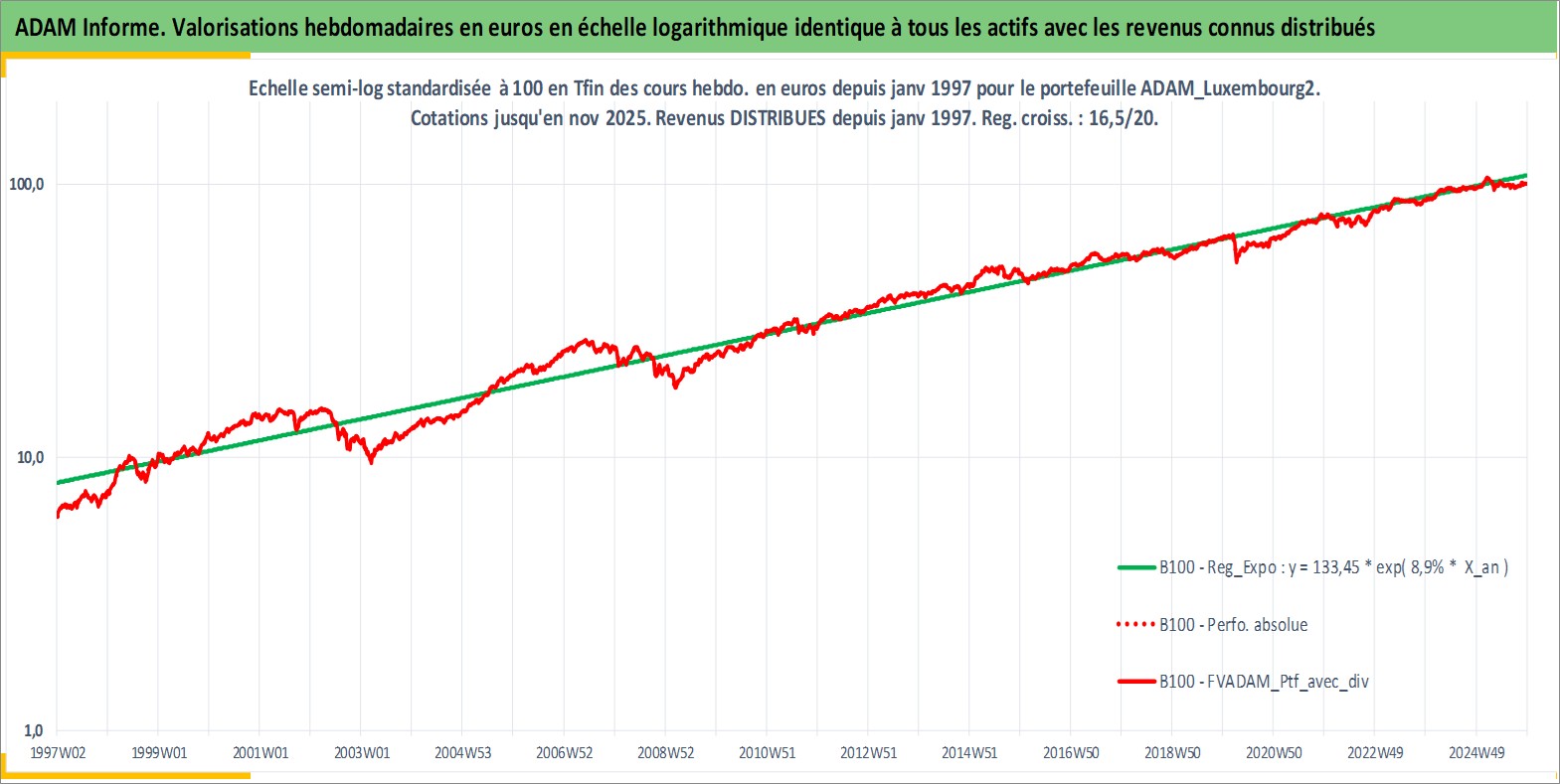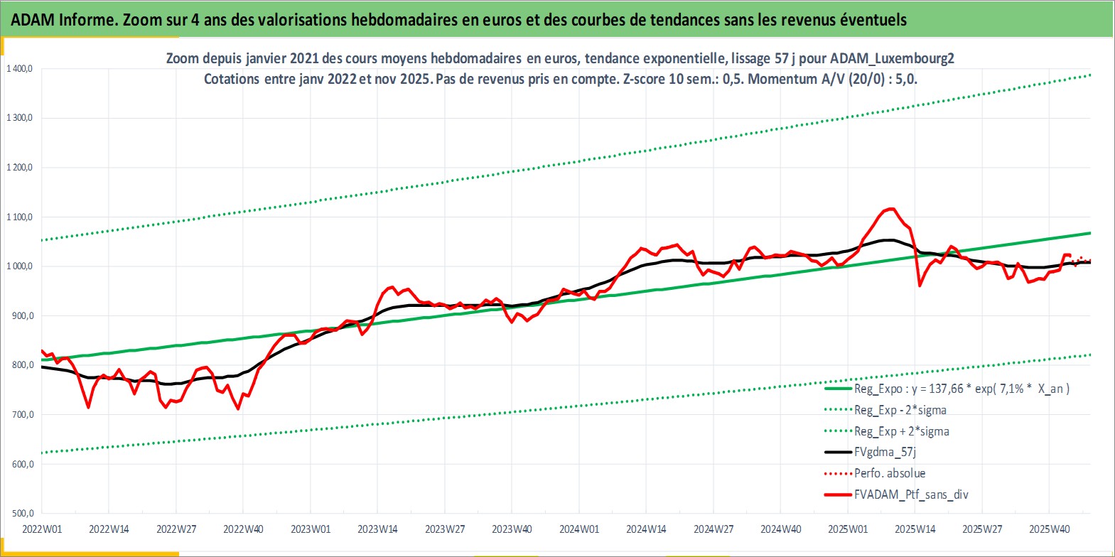 Site dédié aux investisseursPage dédiée sur site financeAnalyse des valorisations hebdomadaires du portefeuille ADAM_Luxembourg2_8actifs avec un profil P6_PurActions. Ce portefeuille est cote en EUR. Les valorisations couvrent les semaines 1997W01 a 2025W48. Les revenus de cet actif financier sont pris en compte depuis la semaine 1997W01. La note globale ESG de cet actif est estimee a 11.0 (apres rebasage entre 0 et 20).