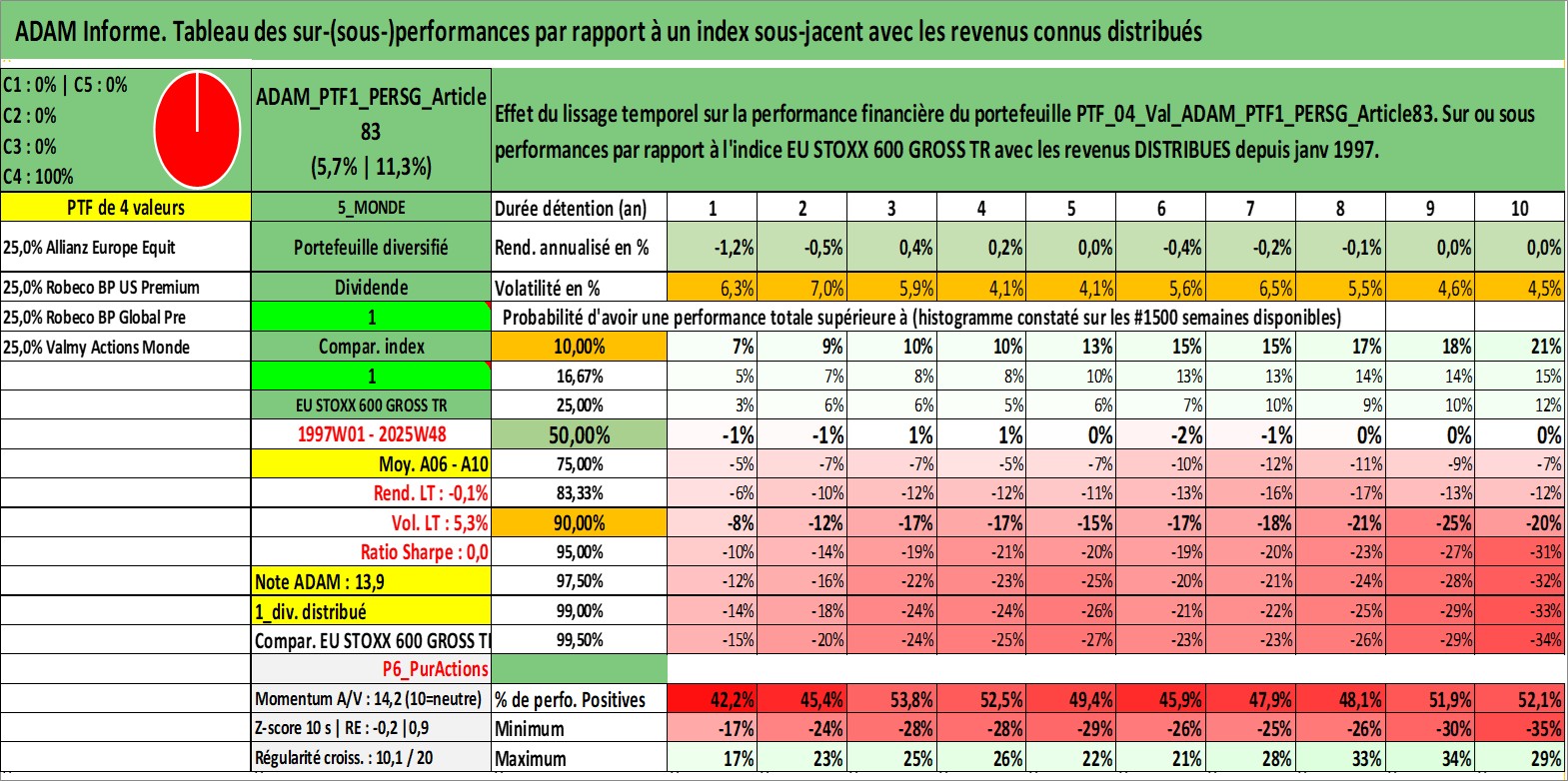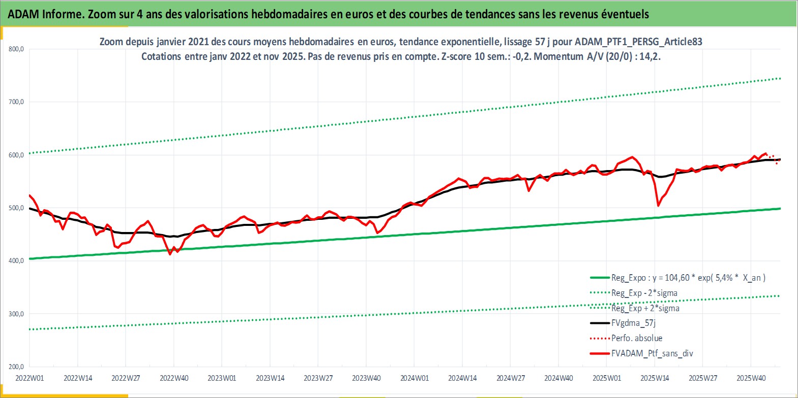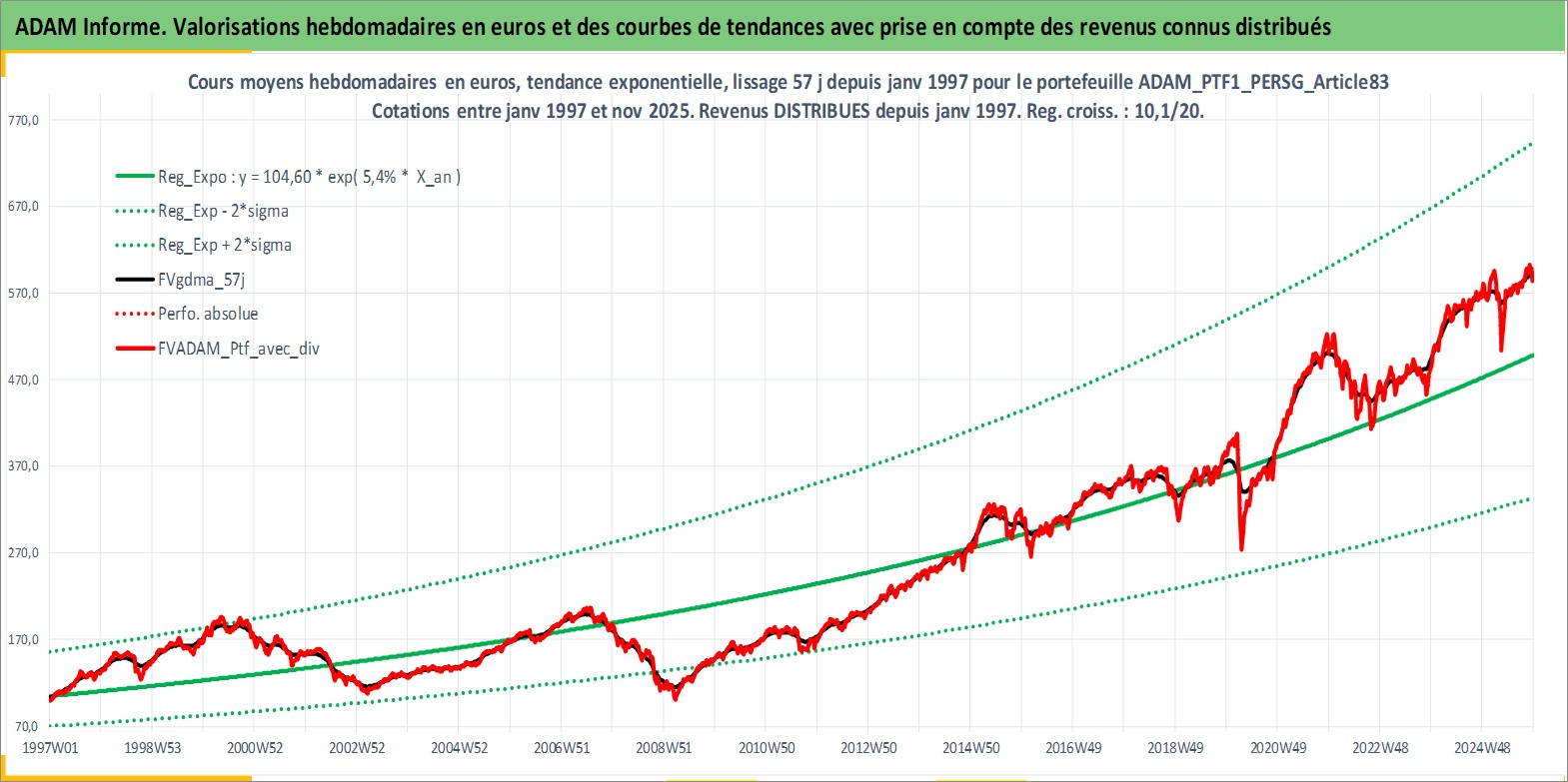 Site dédié aux investisseursPage dédiée sur site financeAnalyse des valorisations hebdomadaires du portefeuille PTF1_PERSG_Article83_4actifs avec un profil P6_PurActions. Ce portefeuille est cote en EUR. Les valorisations couvrent les semaines 1997W01 a 2025W48. Les revenus de cet actif financier sont pris en compte depuis la semaine 1997W01. La note globale ESG de cet actif est estimee a 9.0 (apres rebasage entre 0 et 20).