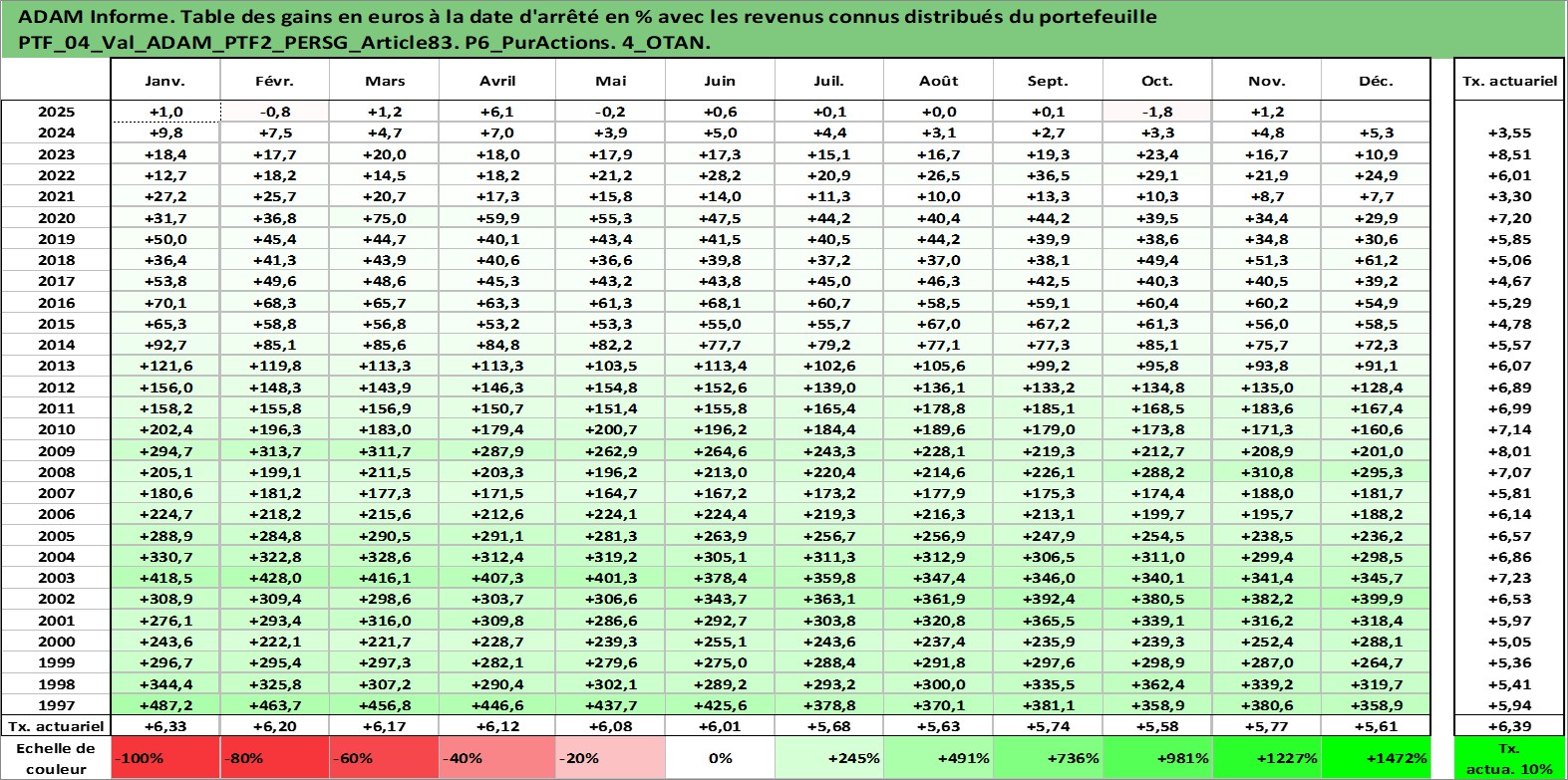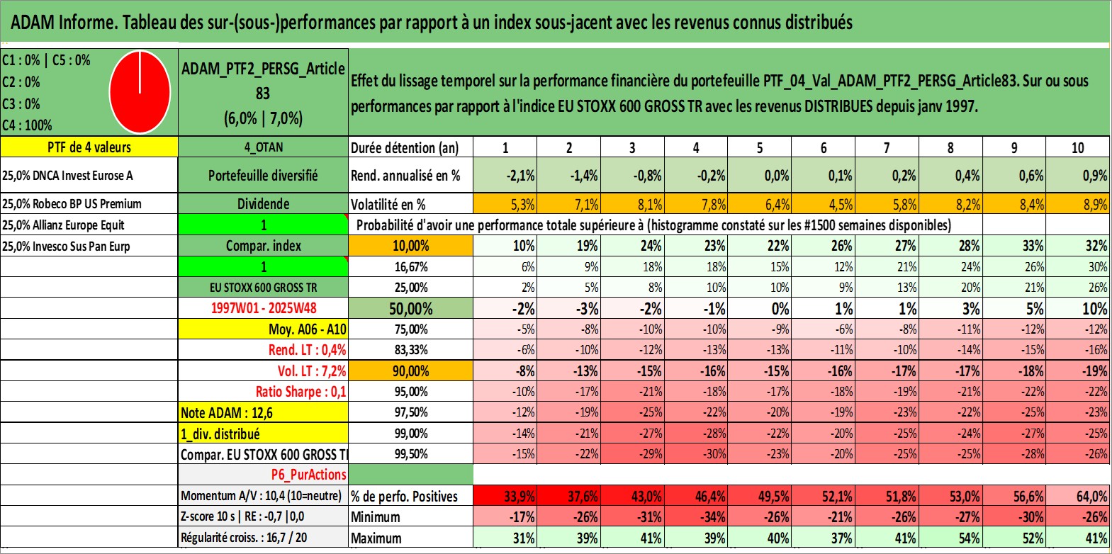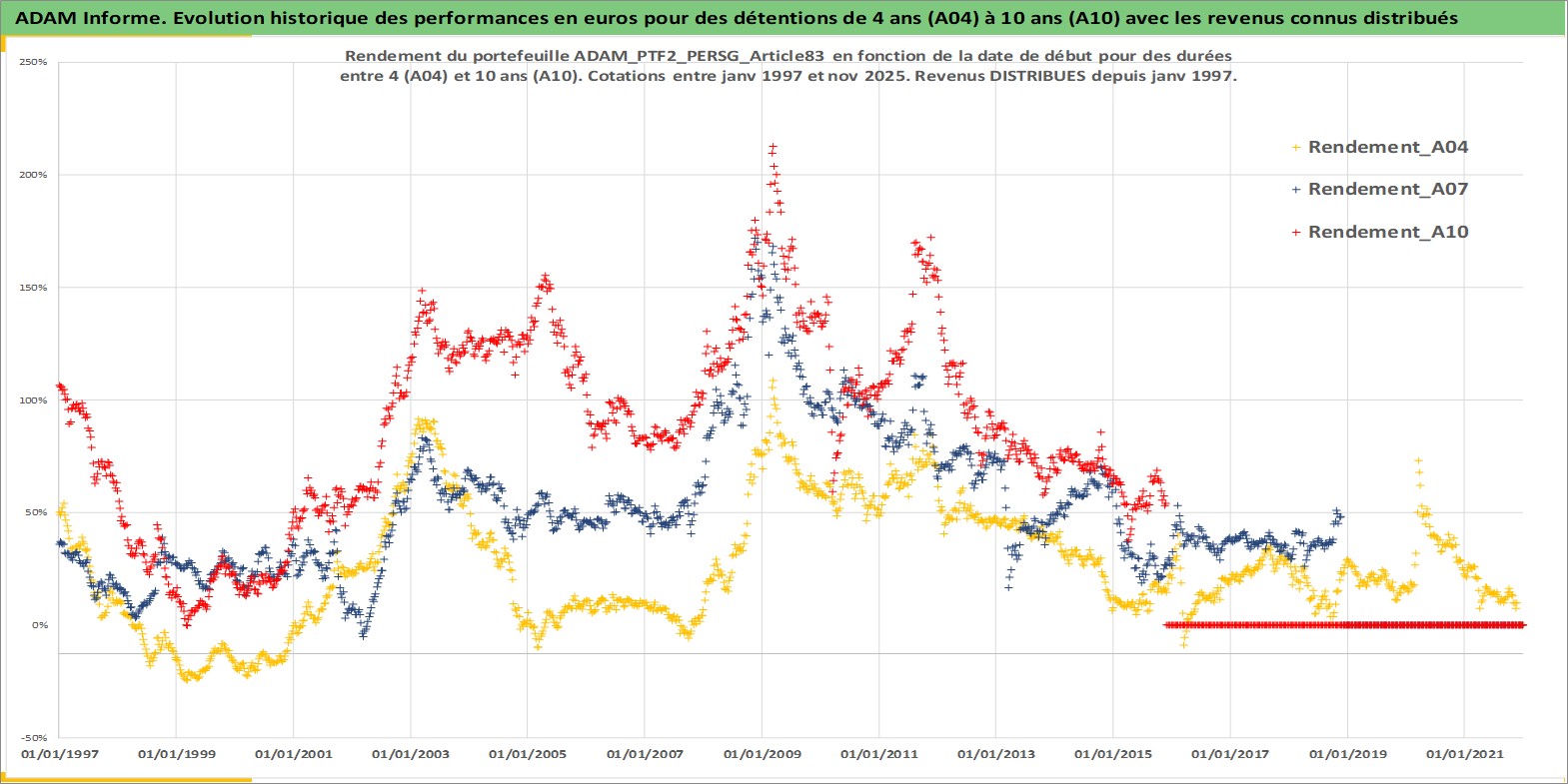 Site dédié aux investisseursPage dédiée sur site financeAnalyse des valorisations hebdomadaires du portefeuille PTF2_PERSG_Article83_4actifs avec un profil P6_PurActions. Ce portefeuille est cote en EUR. Les valorisations couvrent les semaines 1997W01 a 2025W48. Les revenus de cet actif financier sont pris en compte depuis la semaine 1997W01. La note globale ESG de cet actif est estimee a 9.2 (apres rebasage entre 0 et 20).