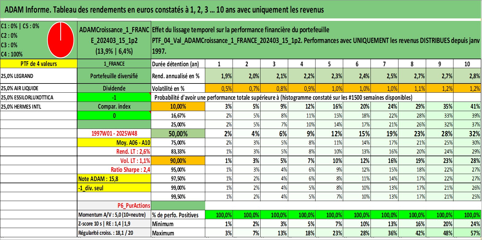 Site dédié aux investisseursPage dédiée sur site financeAnalyse des valorisations hebdomadaires du portefeuille ADAMCroissance_1_FRANCE_202403_15_1p2_4actifs avec un profil P6_PurActions. Ce portefeuille est cote en EUR. Les valorisations couvrent les semaines 1997W01 a 2025W48. Les revenus de cet actif financier sont pris en compte depuis la semaine 1997W01. La note globale ESG de cet actif est estimee a 13.5 (apres rebasage entre 0 et 20).