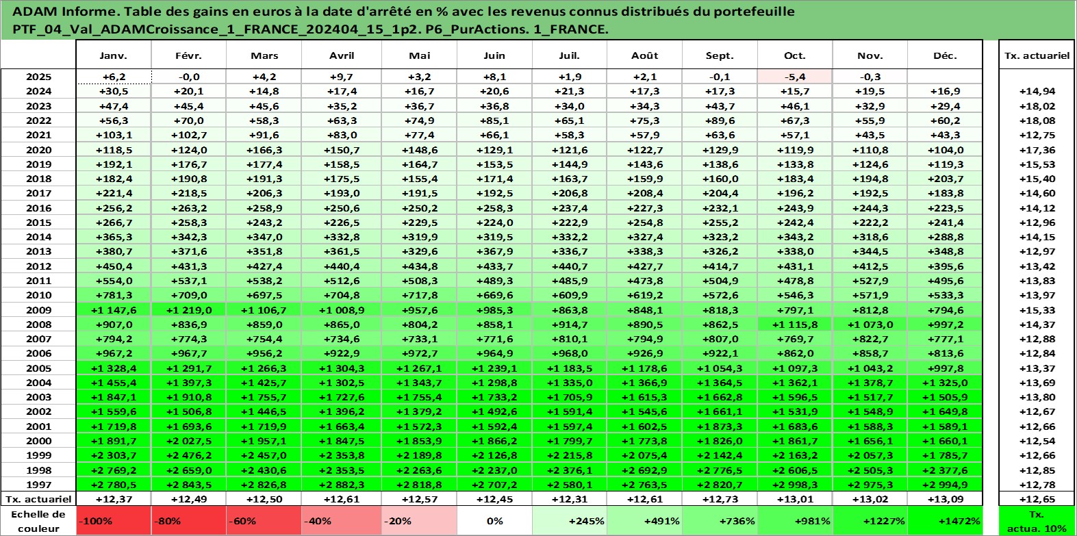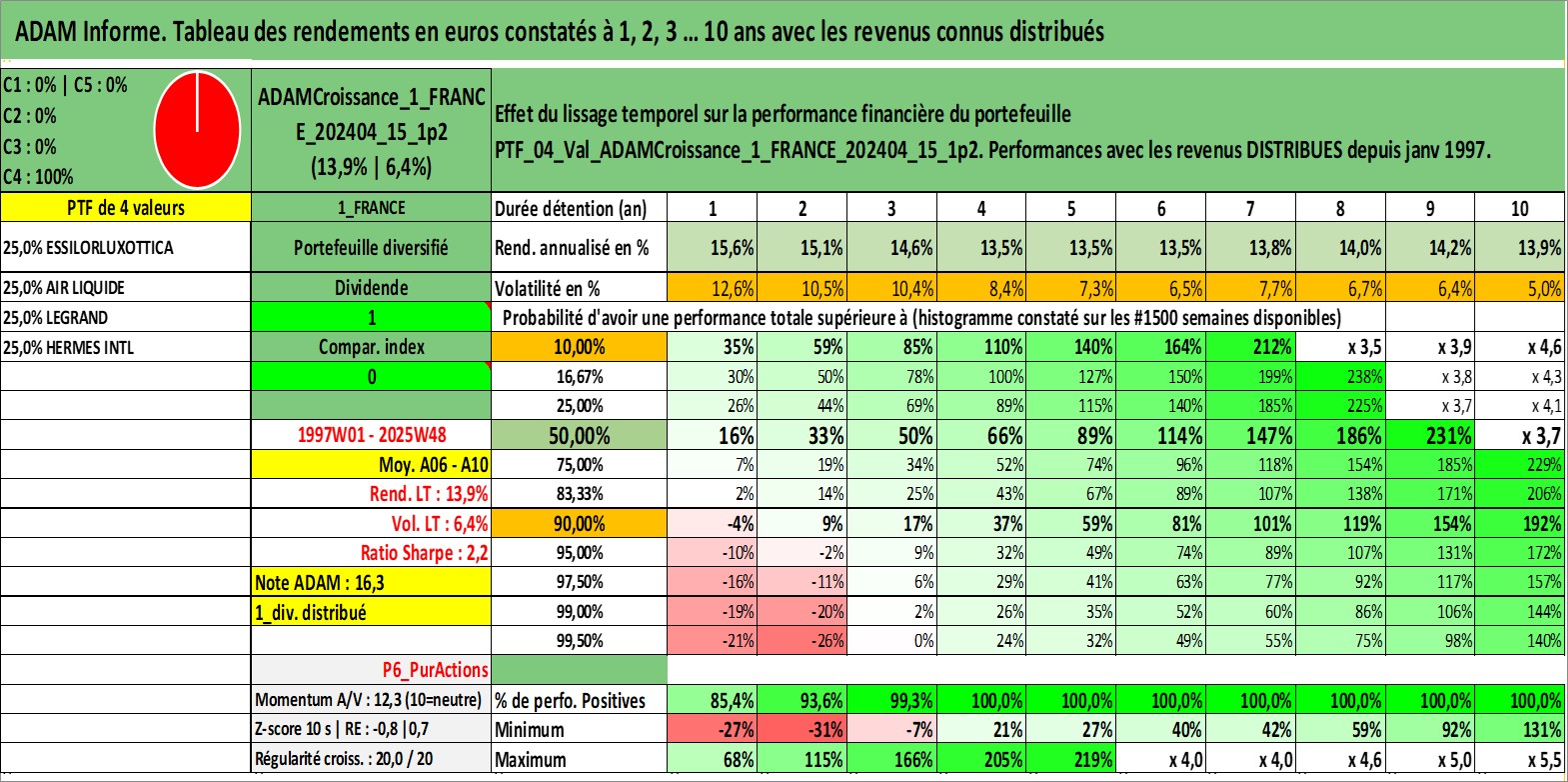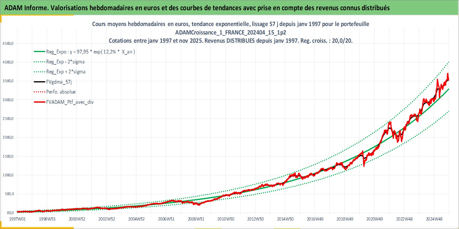 Site dédié aux investisseursPage dédiée sur site financeAnalyse des valorisations hebdomadaires du portefeuille ADAMCroissance_1_FRANCE_202404_15_1p2_4actifs avec un profil P6_PurActions. Ce portefeuille est cote en EUR. Les valorisations couvrent les semaines 1997W01 a 2025W48. Les revenus de cet actif financier sont pris en compte depuis la semaine 1997W01. La note globale ESG de cet actif est estimee a 13.5 (apres rebasage entre 0 et 20).
