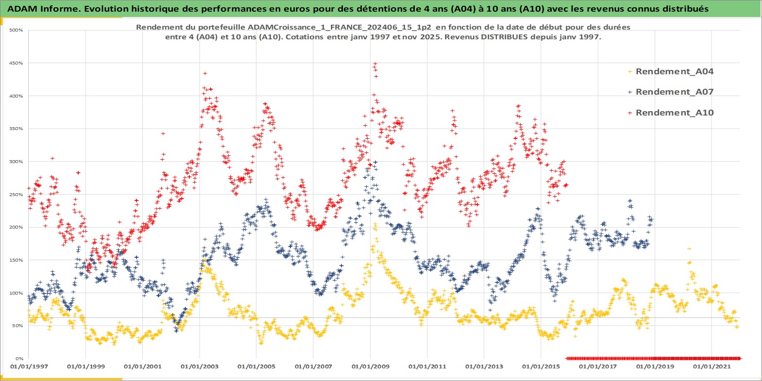 Site dédié aux investisseursPage dédiée sur site financeAnalyse des valorisations hebdomadaires du portefeuille ADAMCroissance_1_FRANCE_202406_15_1p2_4actifs avec un profil P6_PurActions. Ce portefeuille est cote en EUR. Les valorisations couvrent les semaines 1997W01 a 2025W48. Les revenus de cet actif financier sont pris en compte depuis la semaine 1997W01. La note globale ESG de cet actif est estimee a 13.5 (apres rebasage entre 0 et 20).