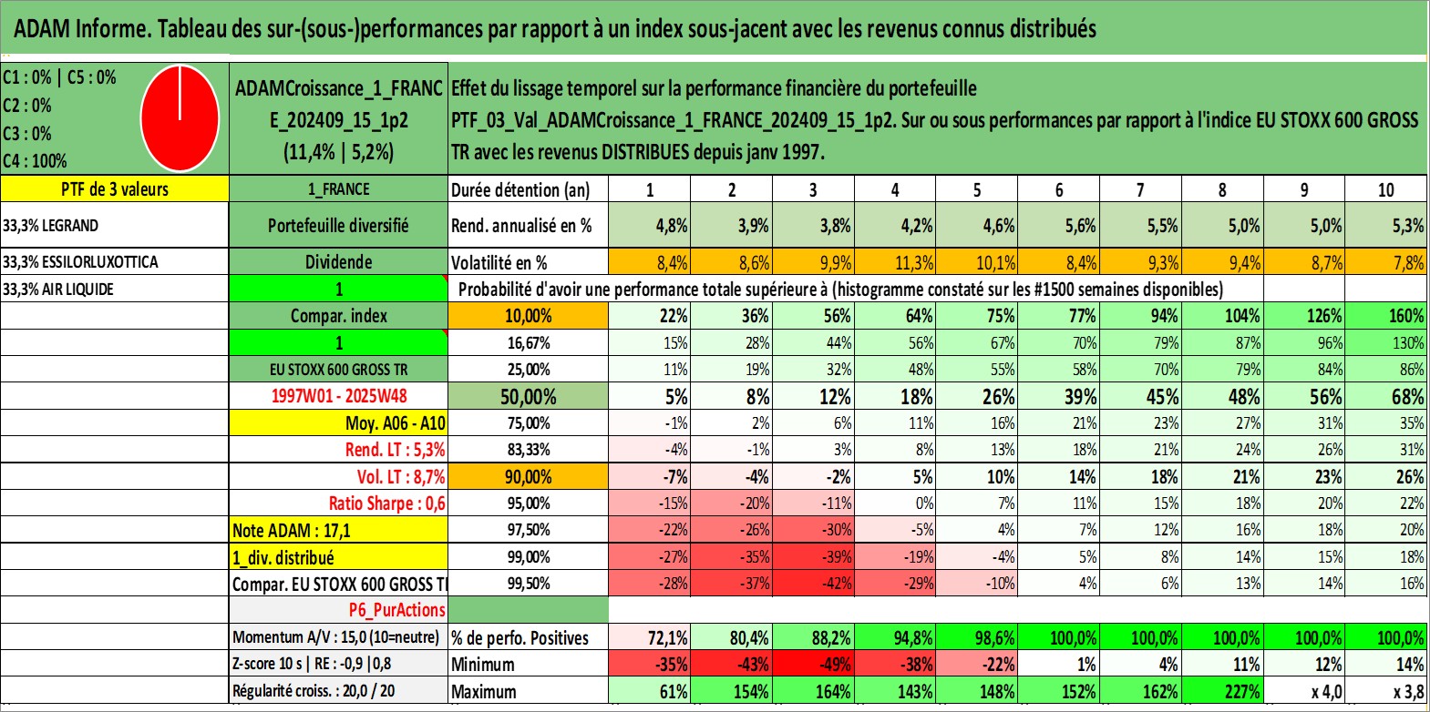 Site dédié aux investisseursPage dédiée sur site financeAnalyse des valorisations hebdomadaires du portefeuille ADAMCroissance_1_FRANCE_202409_15_1p2_3actifs avec un profil P6_PurActions. Ce portefeuille est cote en EUR. Les valorisations couvrent les semaines 1997W01 a 2025W48. Les revenus de cet actif financier sont pris en compte depuis la semaine 1997W01. La note globale ESG de cet actif est estimee a 12.3 (apres rebasage entre 0 et 20).