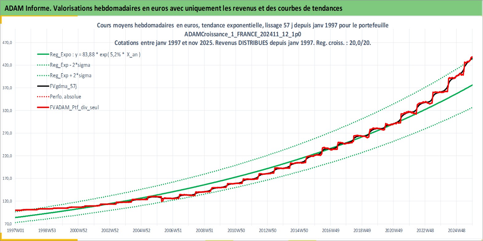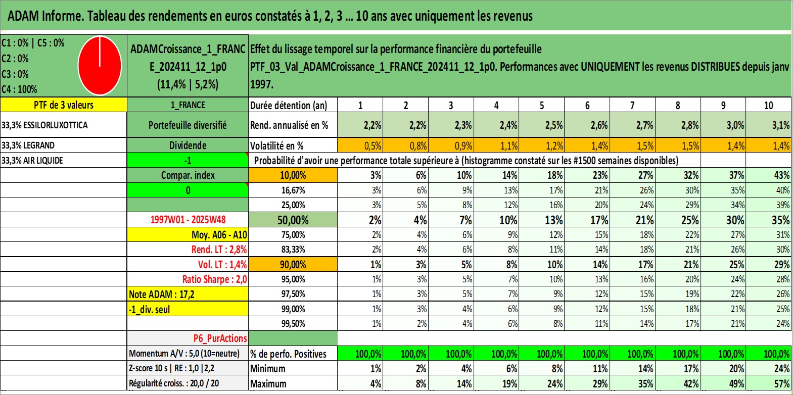 Site dédié aux investisseursPage dédiée sur site financeAnalyse des valorisations hebdomadaires du portefeuille ADAMCroissance_1_FRANCE_202411_12_1p0_3actifs avec un profil P6_PurActions. Ce portefeuille est cote en EUR. Les valorisations couvrent les semaines 1997W01 a 2025W48. Les revenus de cet actif financier sont pris en compte depuis la semaine 1997W01. La note globale ESG de cet actif est estimee a 12.3 (apres rebasage entre 0 et 20).