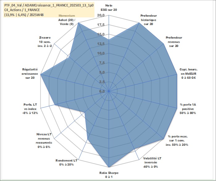 Site dédié aux investisseursPage dédiée sur site financeAnalyse des valorisations hebdomadaires du portefeuille ADAMCroissance_1_FRANCE_202503_13_1p0_4actifs avec un profil P6_PurActions. Ce portefeuille est cote en EUR. Les valorisations couvrent les semaines 1997W01 a 2025W48. Les revenus de cet actif financier sont pris en compte depuis la semaine 1997W01. La note globale ESG de cet actif est estimee a 13.5 (apres rebasage entre 0 et 20).