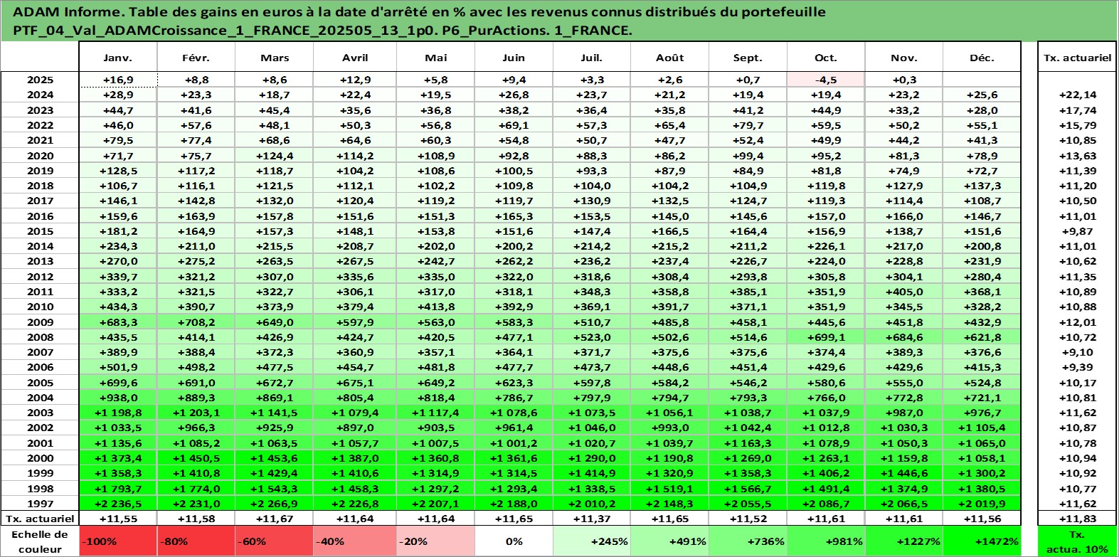 Site dédié aux investisseursPage dédiée sur site financeAnalyse des valorisations hebdomadaires du portefeuille ADAMCroissance_1_FRANCE_202505_13_1p0_4actifs avec un profil P6_PurActions. Ce portefeuille est cote en EUR. Les valorisations couvrent les semaines 1997W01 a 2025W48. Les revenus de cet actif financier sont pris en compte depuis la semaine 1997W01. La note globale ESG de cet actif est estimee a 11.0 (apres rebasage entre 0 et 20).