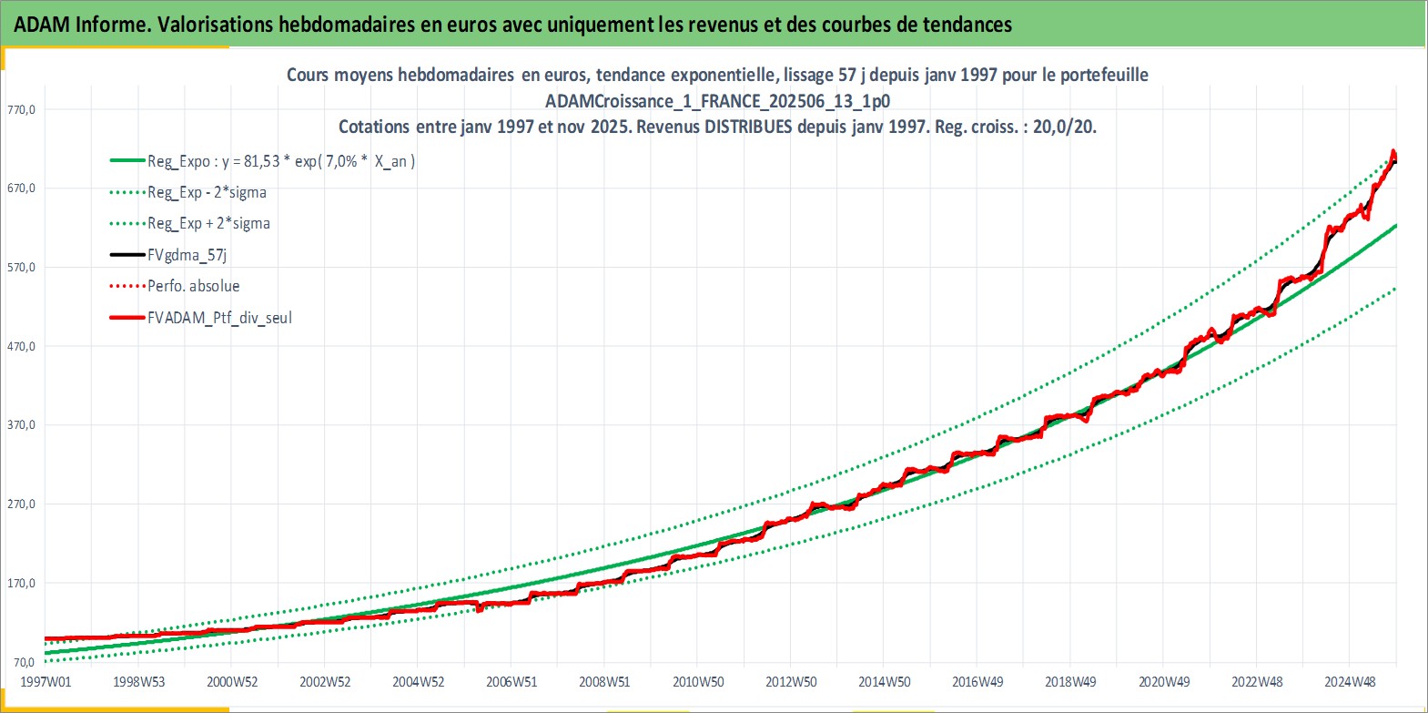 Site dédié aux investisseursPage dédiée sur site financeAnalyse des valorisations hebdomadaires du portefeuille ADAMCroissance_1_FRANCE_202506_13_1p0_4actifs avec un profil P6_PurActions. Ce portefeuille est cote en EUR. Les valorisations couvrent les semaines 1997W01 a 2025W48. Les revenus de cet actif financier sont pris en compte depuis la semaine 1997W01. La note globale ESG de cet actif est estimee a 11.0 (apres rebasage entre 0 et 20).