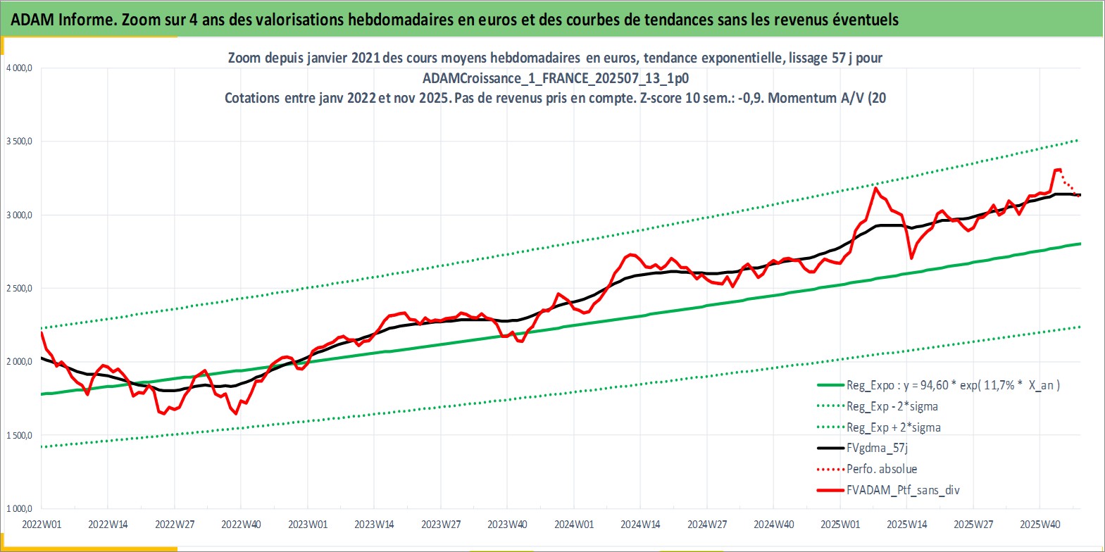 Site dédié aux investisseursPage dédiée sur site financeAnalyse des valorisations hebdomadaires du portefeuille ADAMCroissance_1_FRANCE_202507_13_1p0_4actifs avec un profil P6_PurActions. Ce portefeuille est cote en EUR. Les valorisations couvrent les semaines 1997W01 a 2025W48. Les revenus de cet actif financier sont pris en compte depuis la semaine 1997W01. La note globale ESG de cet actif est estimee a 13.5 (apres rebasage entre 0 et 20).