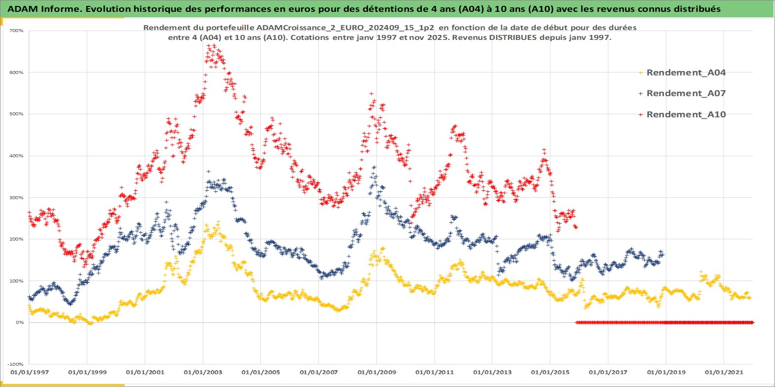 Site dédié aux investisseursPage dédiée sur site financeAnalyse des valorisations hebdomadaires du portefeuille ADAMCroissance_2_EURO_202409_15_1p2_6actifs avec un profil P6_PurActions. Ce portefeuille est cote en EUR. Les valorisations couvrent les semaines 1997W01 a 2025W48. Les revenus de cet actif financier sont pris en compte depuis la semaine 1997W01. La note globale ESG de cet actif est estimee a 12.2 (apres rebasage entre 0 et 20).