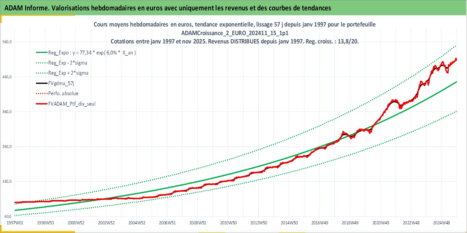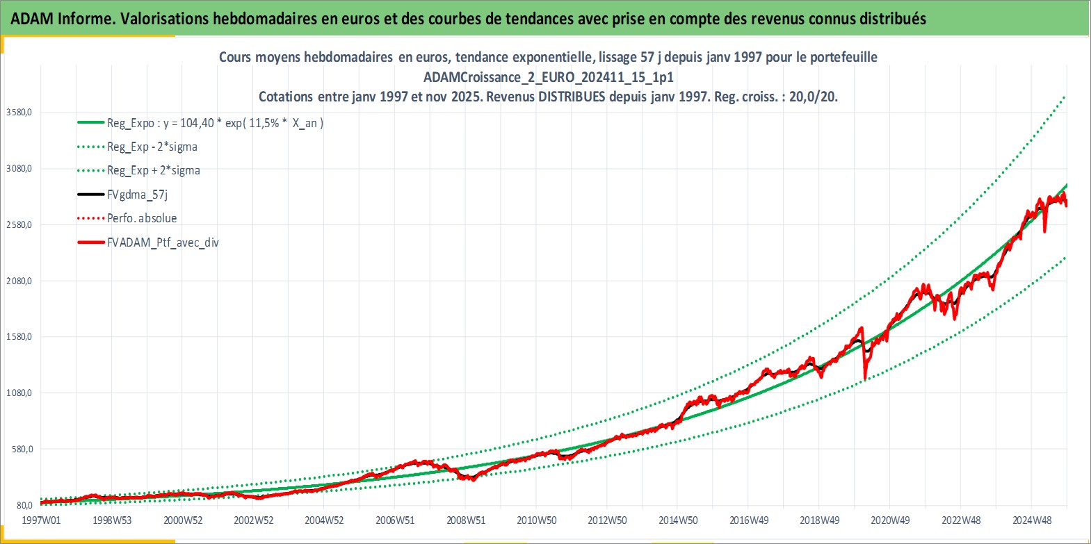Site dédié aux investisseursPage dédiée sur site financeAnalyse des valorisations hebdomadaires du portefeuille ADAMCroissance_2_EURO_202411_15_1p1_11actifs avec un profil P6_PurActions. Ce portefeuille est cote en EUR. Les valorisations couvrent les semaines 1997W01 a 2025W48. Les revenus de cet actif financier sont pris en compte depuis la semaine 1997W01. La note globale ESG de cet actif est estimee a 10.9 (apres rebasage entre 0 et 20).