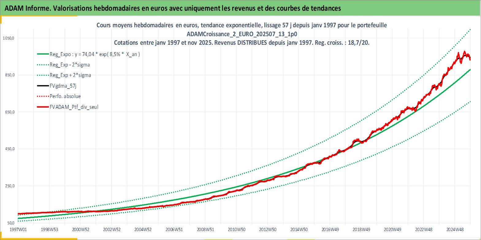 Site dédié aux investisseursPage dédiée sur site financeAnalyse des valorisations hebdomadaires du portefeuille ADAMCroissance_2_EURO_202507_13_1p0_10actifs avec un profil P6_PurActions. Ce portefeuille est cote en EUR. Les valorisations couvrent les semaines 1997W01 a 2025W48. Les revenus de cet actif financier sont pris en compte depuis la semaine 1997W01. La note globale ESG de cet actif est estimee a 13.3 (apres rebasage entre 0 et 20).