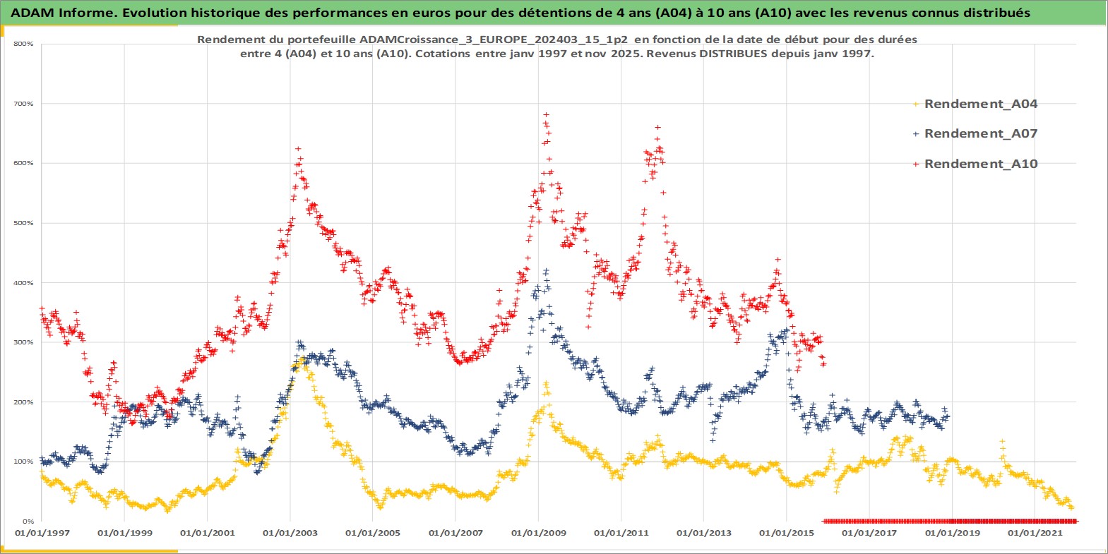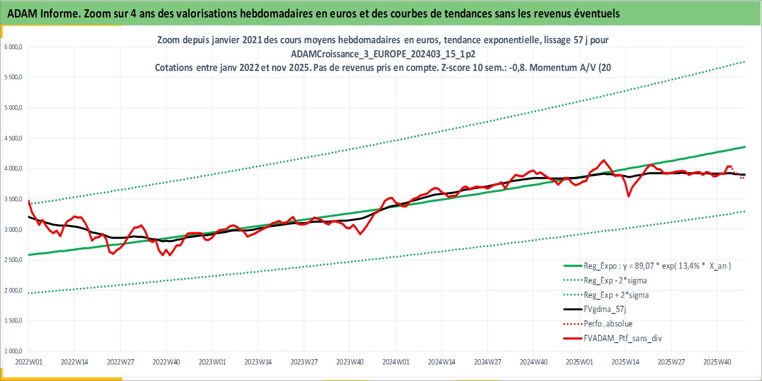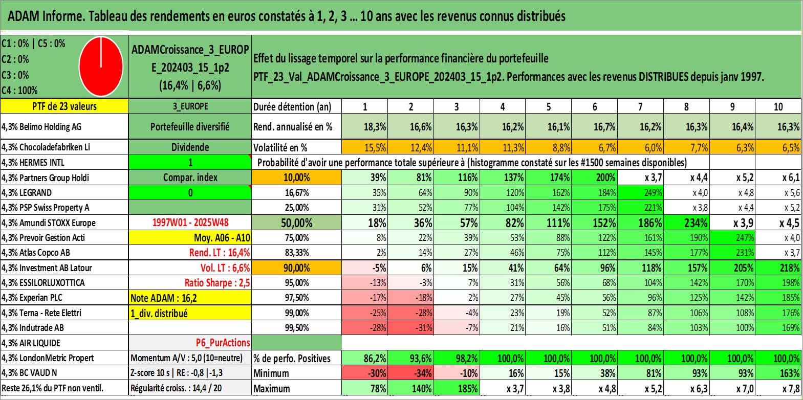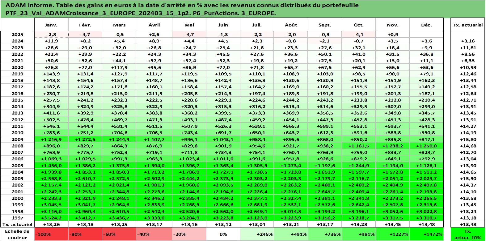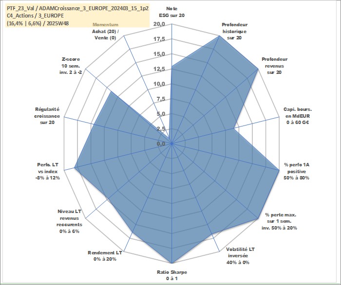 Site dédié aux investisseursPage dédiée sur site financeAnalyse des valorisations hebdomadaires du portefeuille ADAMCroissance_3_EUROPE_202403_15_1p2_23actifs avec un profil P6_PurActions. Ce portefeuille est cote en EUR. Les valorisations couvrent les semaines 1997W01 a 2025W48. Les revenus de cet actif financier sont pris en compte depuis la semaine 1997W01. La note globale ESG de cet actif est estimee a 12.9 (apres rebasage entre 0 et 20).
