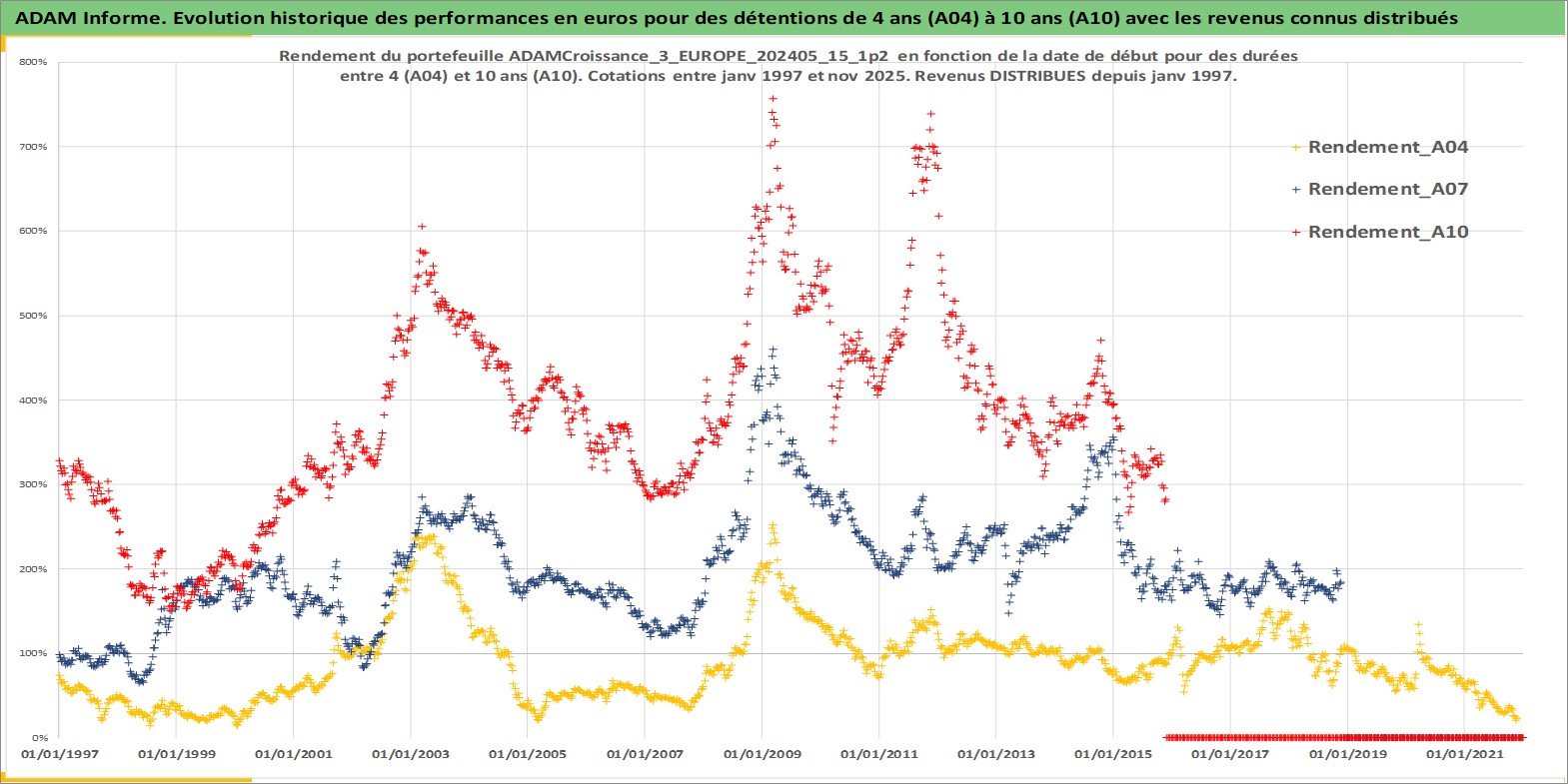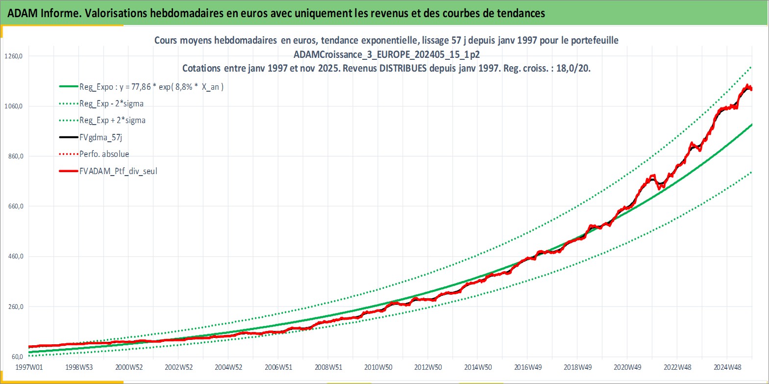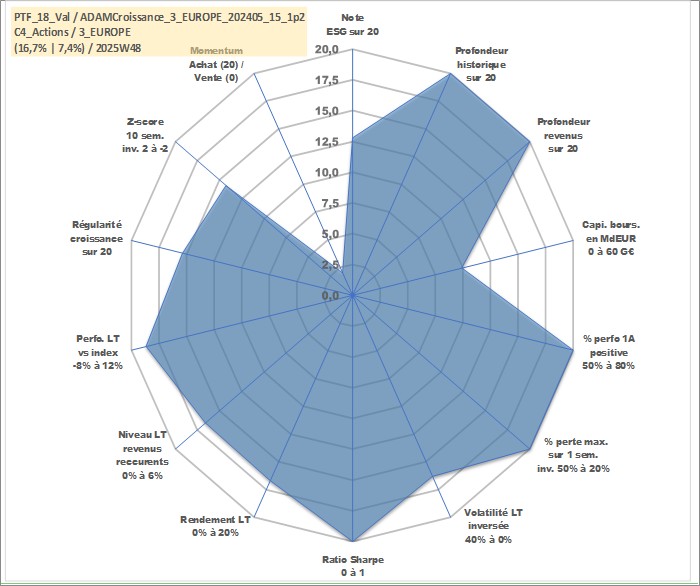 Site dédié aux investisseursPage dédiée sur site financeAnalyse des valorisations hebdomadaires du portefeuille ADAMCroissance_3_EUROPE_202405_15_1p2_18actifs avec un profil P6_PurActions. Ce portefeuille est cote en EUR. Les valorisations couvrent les semaines 1997W01 a 2025W48. Les revenus de cet actif financier sont pris en compte depuis la semaine 1997W01. La note globale ESG de cet actif est estimee a 12.8 (apres rebasage entre 0 et 20).