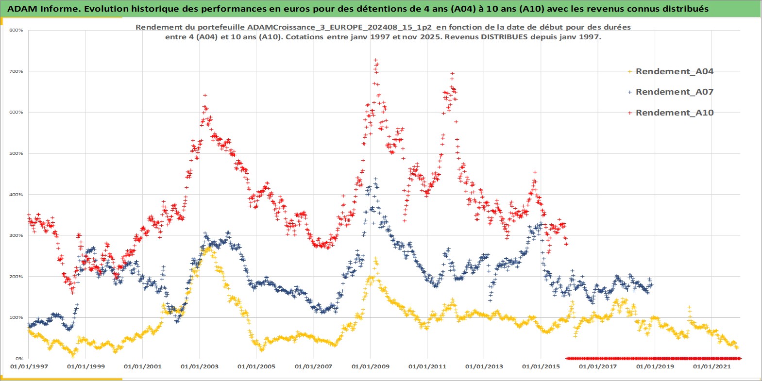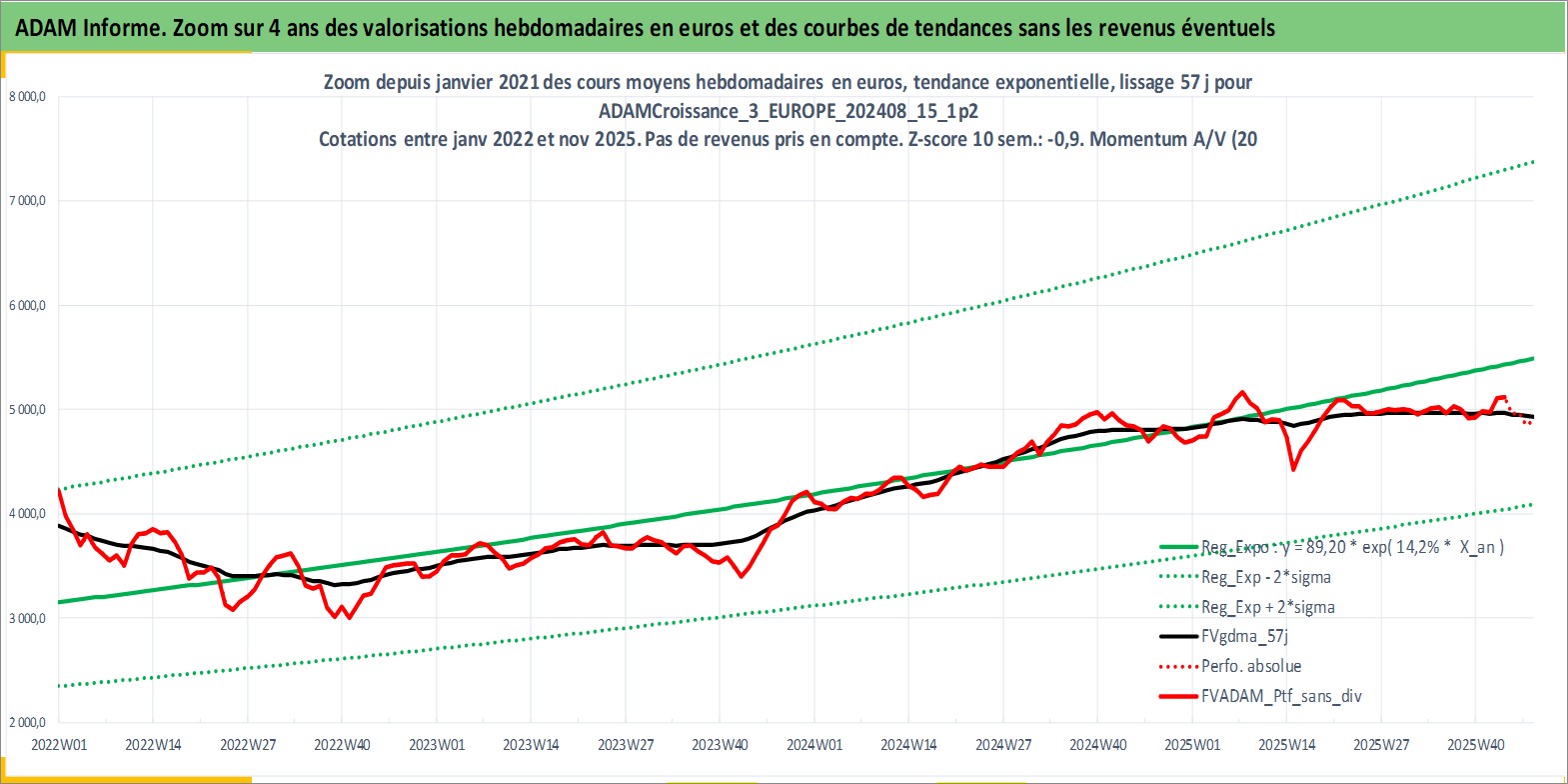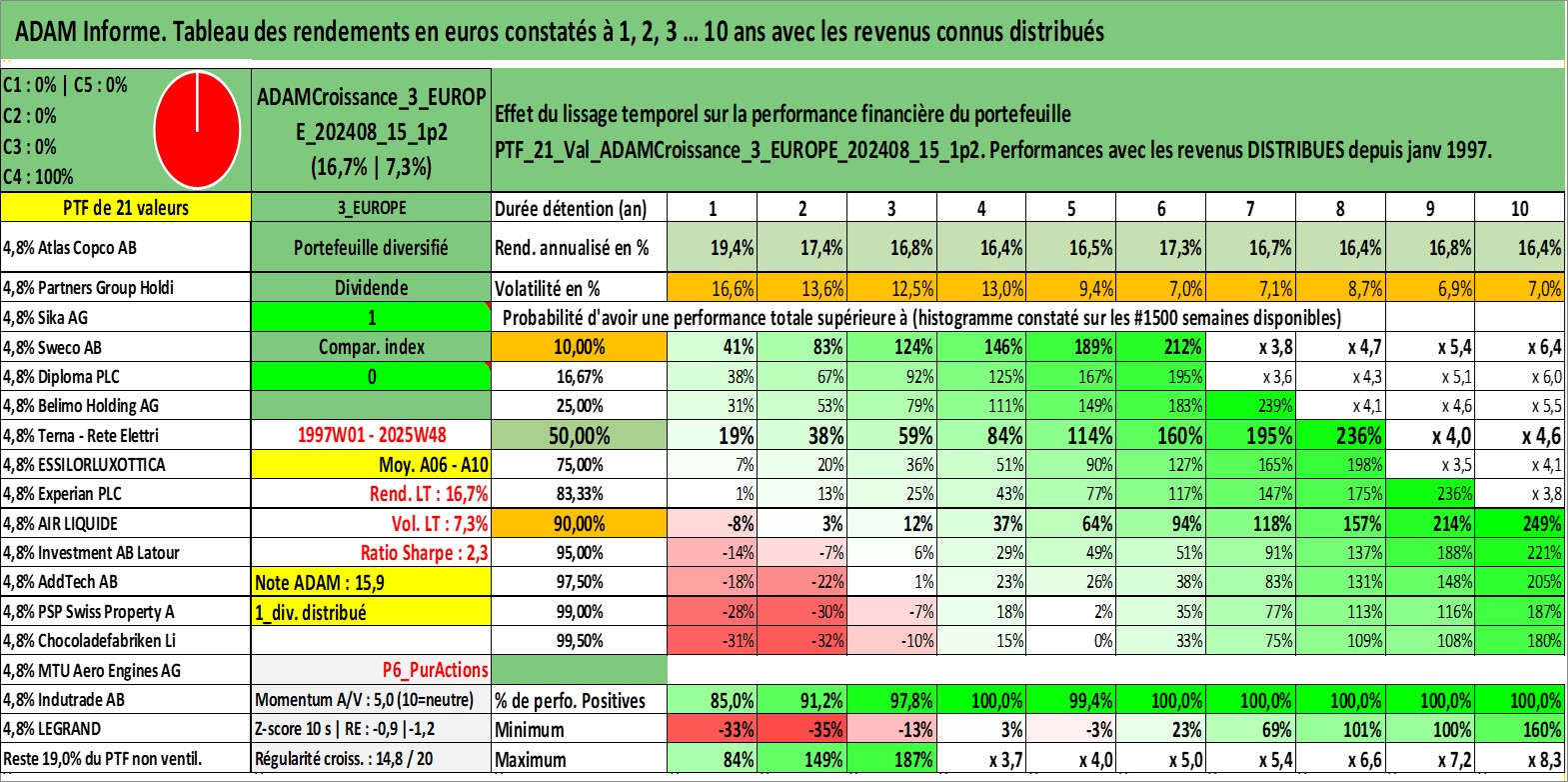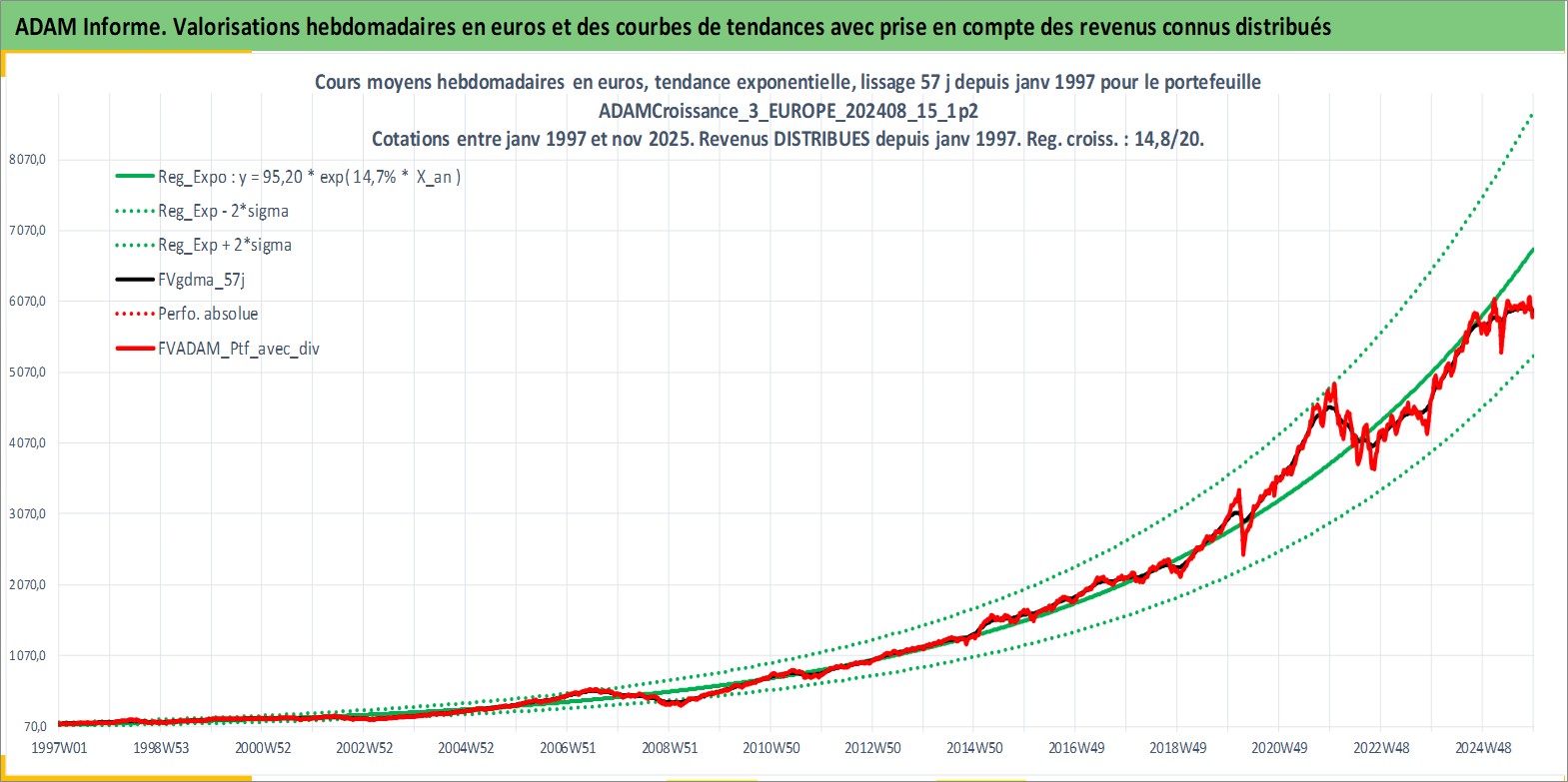 Site dédié aux investisseursPage dédiée sur site financeAnalyse des valorisations hebdomadaires du portefeuille ADAMCroissance_3_EUROPE_202408_15_1p2_21actifs avec un profil P6_PurActions. Ce portefeuille est cote en EUR. Les valorisations couvrent les semaines 1997W01 a 2025W48. Les revenus de cet actif financier sont pris en compte depuis la semaine 1997W01. La note globale ESG de cet actif est estimee a 12.3 (apres rebasage entre 0 et 20).