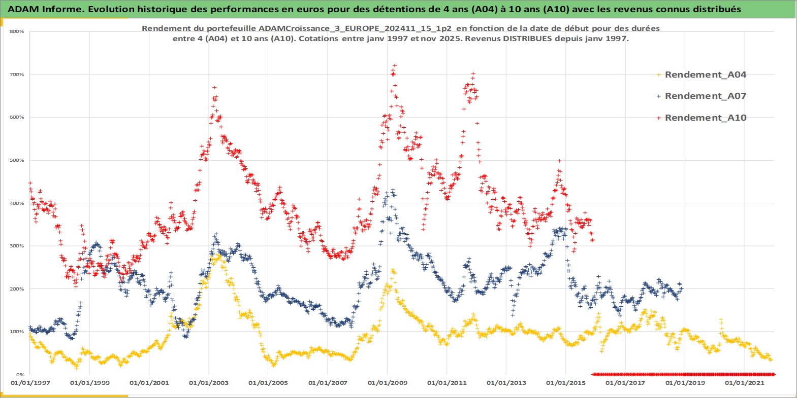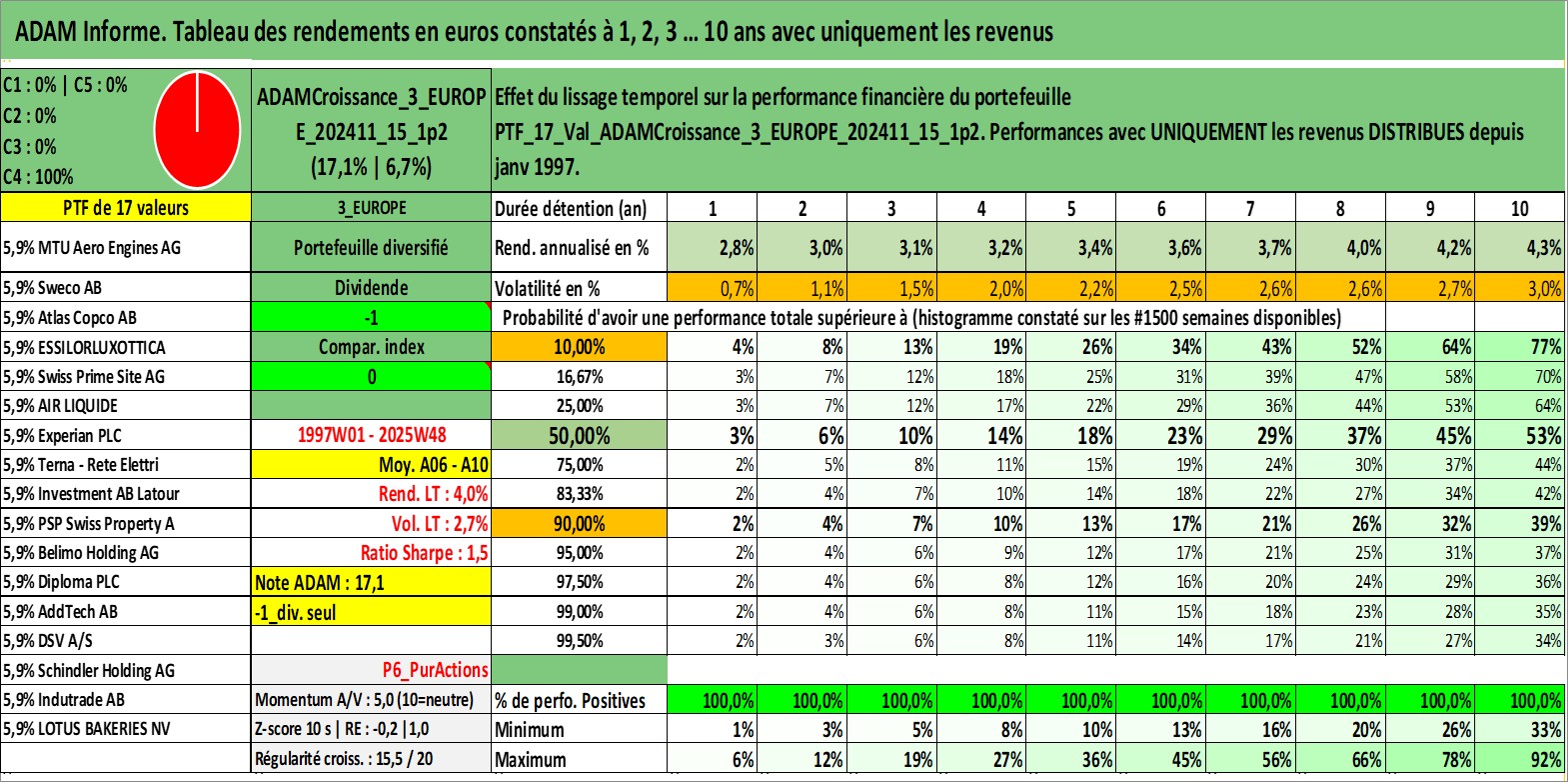 Site dédié aux investisseursPage dédiée sur site financeAnalyse des valorisations hebdomadaires du portefeuille ADAMCroissance_3_EUROPE_202411_15_1p2_17actifs avec un profil P6_PurActions. Ce portefeuille est cote en EUR. Les valorisations couvrent les semaines 1997W01 a 2025W48. Les revenus de cet actif financier sont pris en compte depuis la semaine 1997W01. La note globale ESG de cet actif est estimee a 13.0 (apres rebasage entre 0 et 20).
