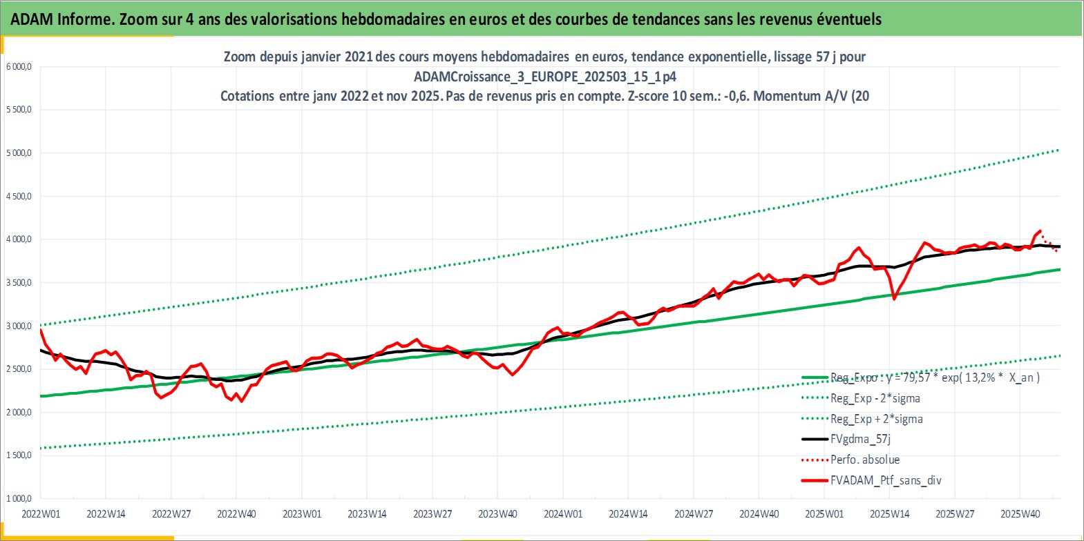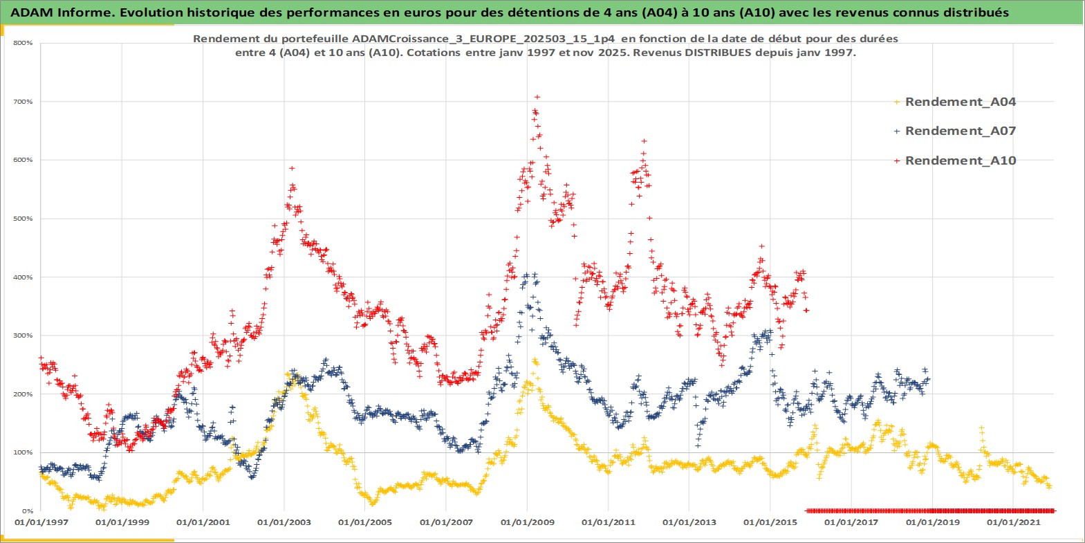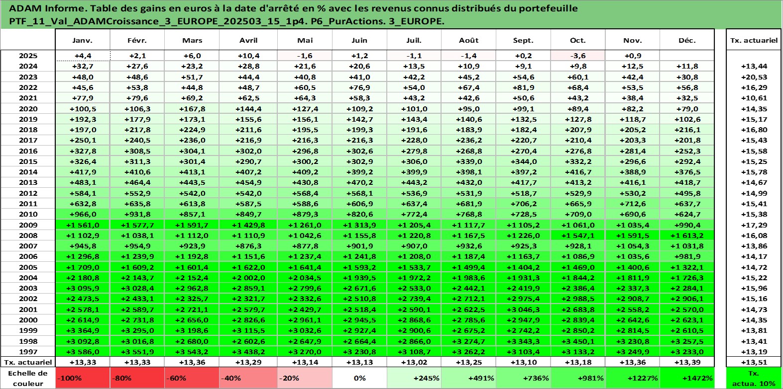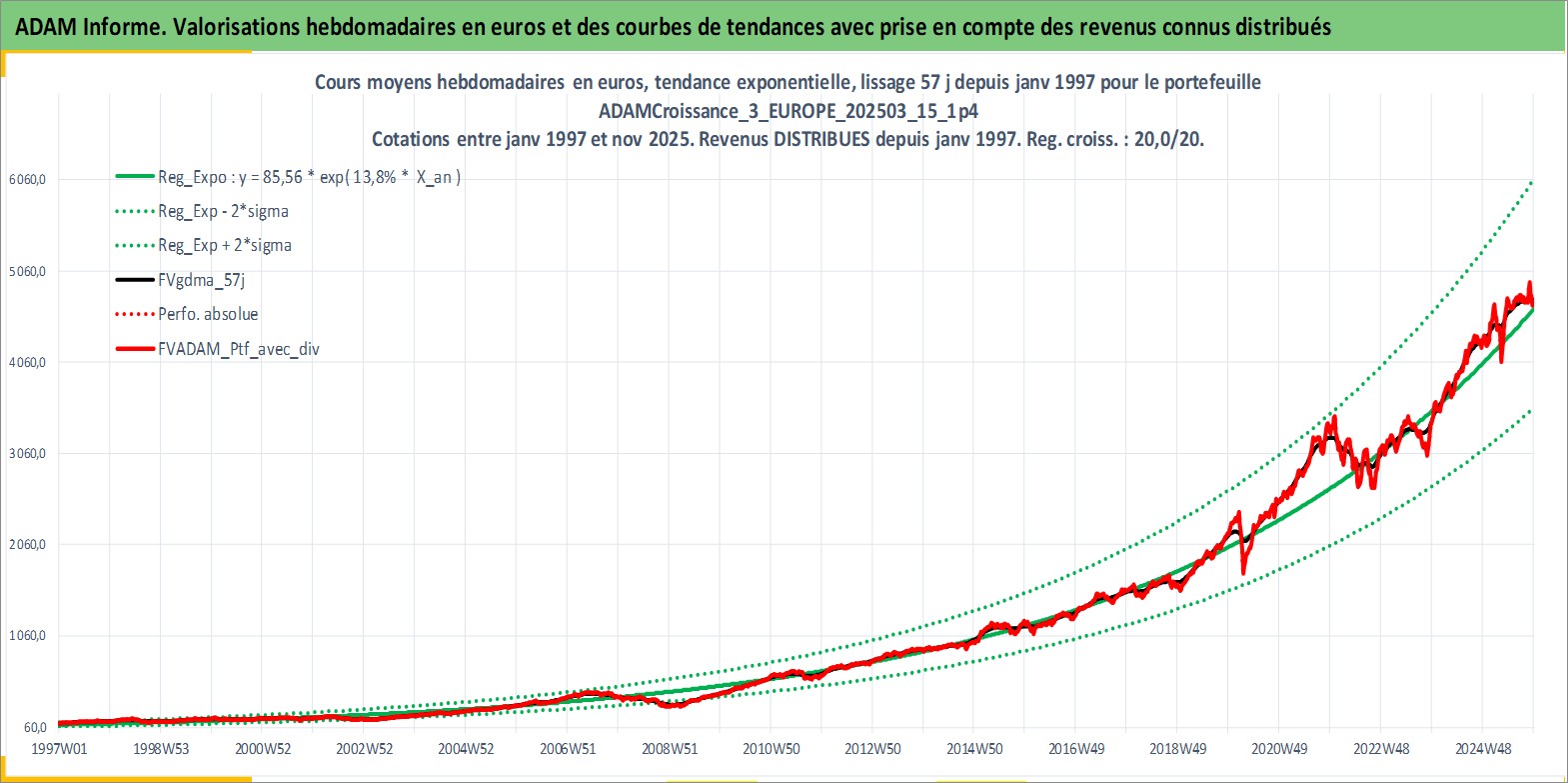 Site dédié aux investisseursPage dédiée sur site financeAnalyse des valorisations hebdomadaires du portefeuille ADAMCroissance_3_EUROPE_202503_15_1p4_11actifs avec un profil P6_PurActions. Ce portefeuille est cote en EUR. Les valorisations couvrent les semaines 1997W01 a 2025W48. Les revenus de cet actif financier sont pris en compte depuis la semaine 1997W01. La note globale ESG de cet actif est estimee a 12.5 (apres rebasage entre 0 et 20).