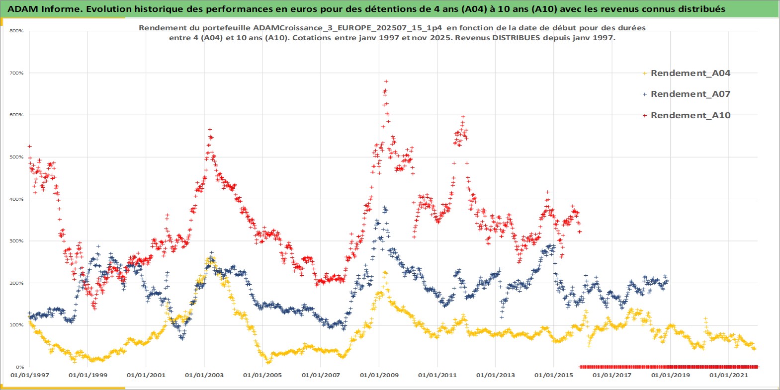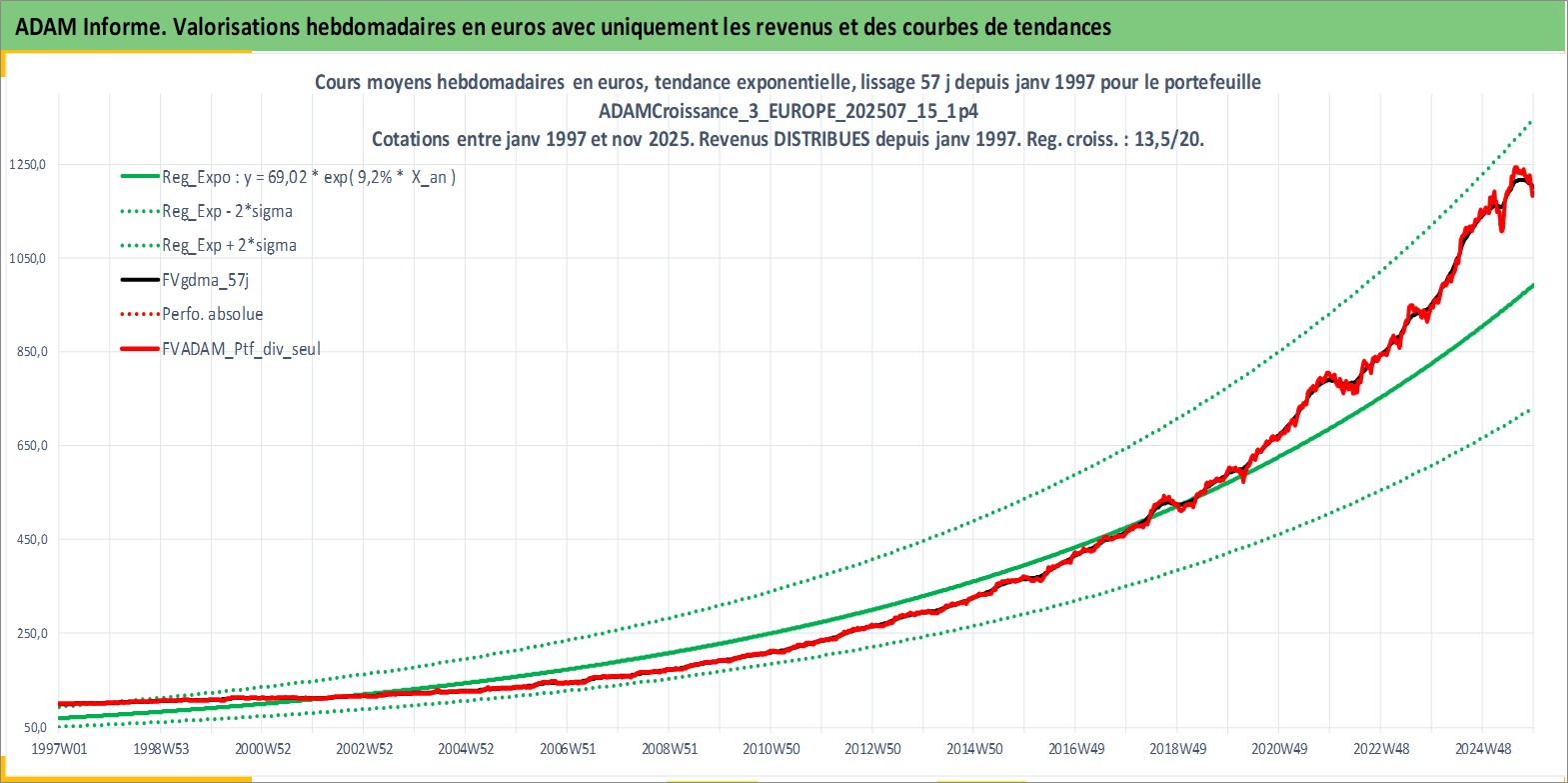 Site dédié aux investisseursPage dédiée sur site financeAnalyse des valorisations hebdomadaires du portefeuille ADAMCroissance_3_EUROPE_202507_15_1p4_12actifs avec un profil P6_PurActions. Ce portefeuille est cote en EUR. Les valorisations couvrent les semaines 1997W01 a 2025W48. Les revenus de cet actif financier sont pris en compte depuis la semaine 1997W01. La note globale ESG de cet actif est estimee a 13.0 (apres rebasage entre 0 et 20).